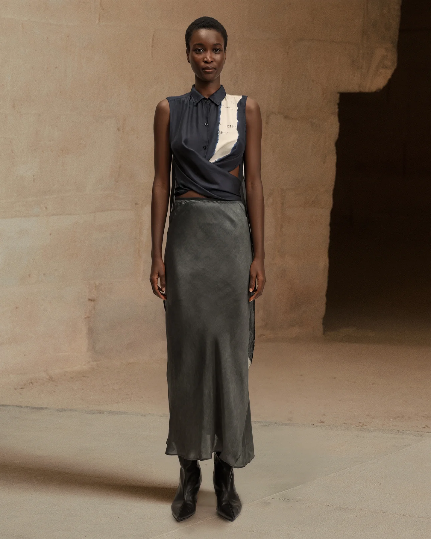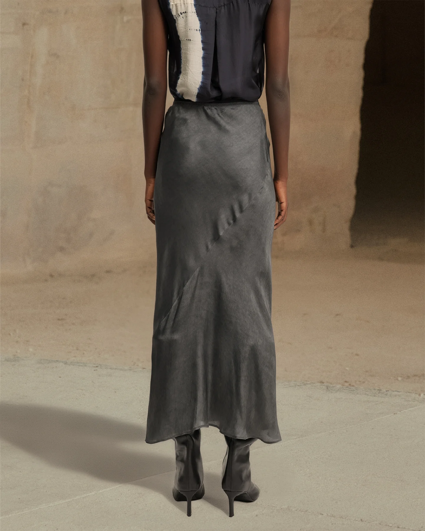 Jupe longue et droite en soie de fausse couleur noire est taillée dans le biais pour offrir un confort optimal. Cette jupe présente une coupe simple qui épouse délicatement les courbes du corps. Dotée d’une taille élastique, elle offre un ajustement parfait. Cette pièce simple et élégante est idéale à associer avec le top assorti pour un look harmonieux.