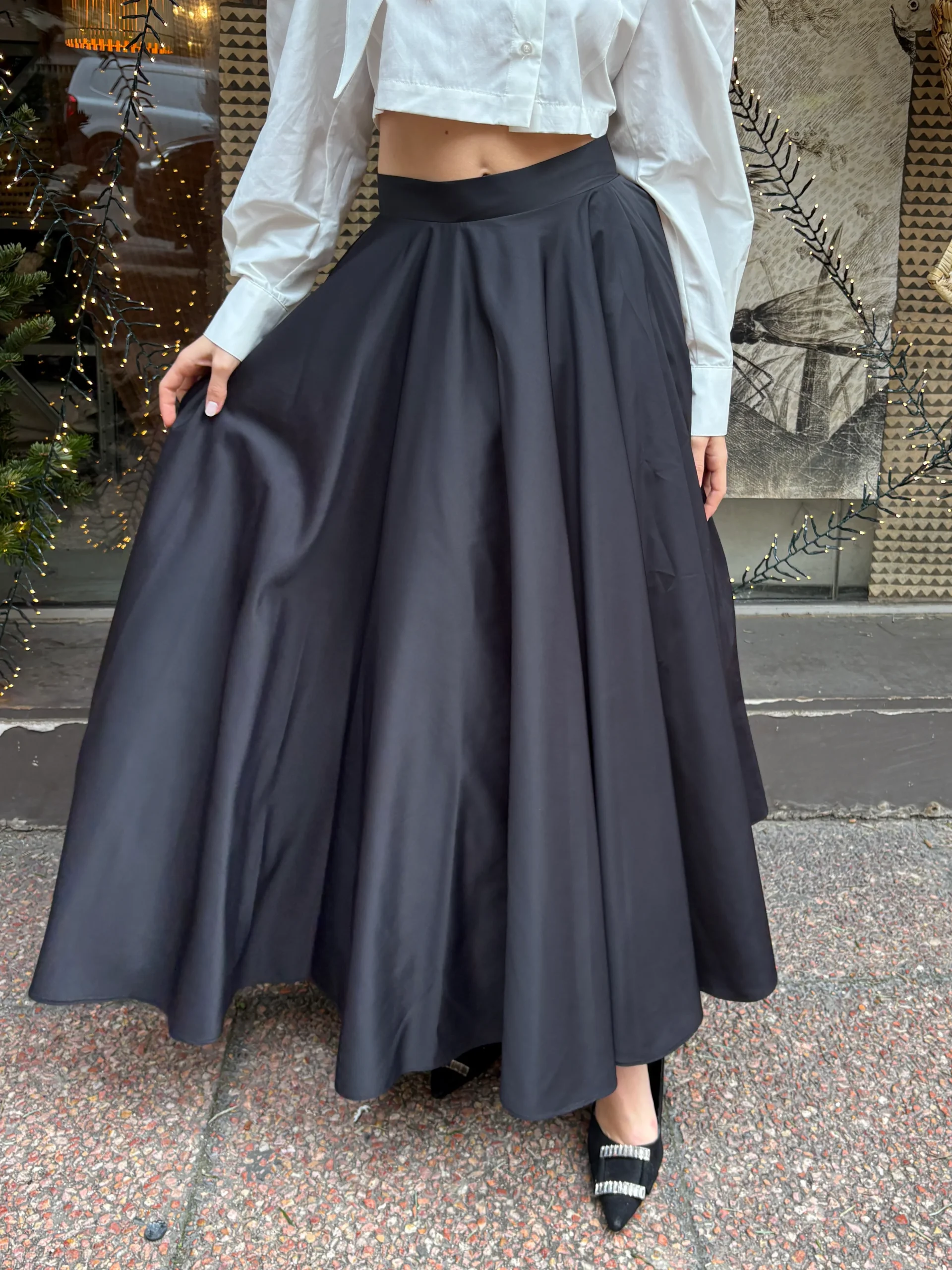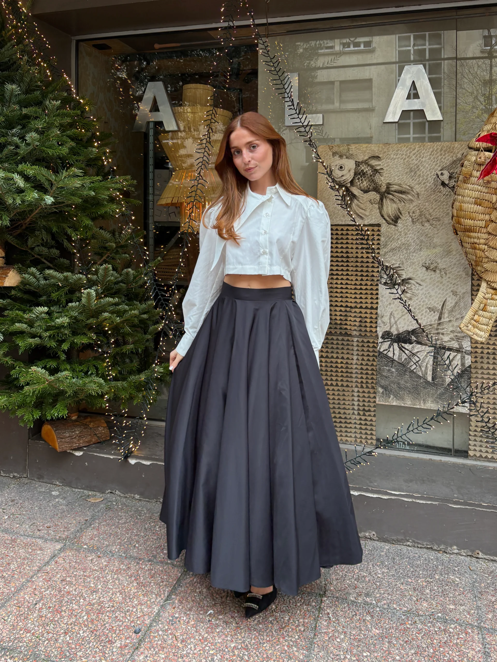Longueur cheville, volume généreux mais structuré : c’est la jupe idéale pour une tenue de soirée, un événement chic ou pour twister une chemise blanche au quotidien avec une allure très couture.