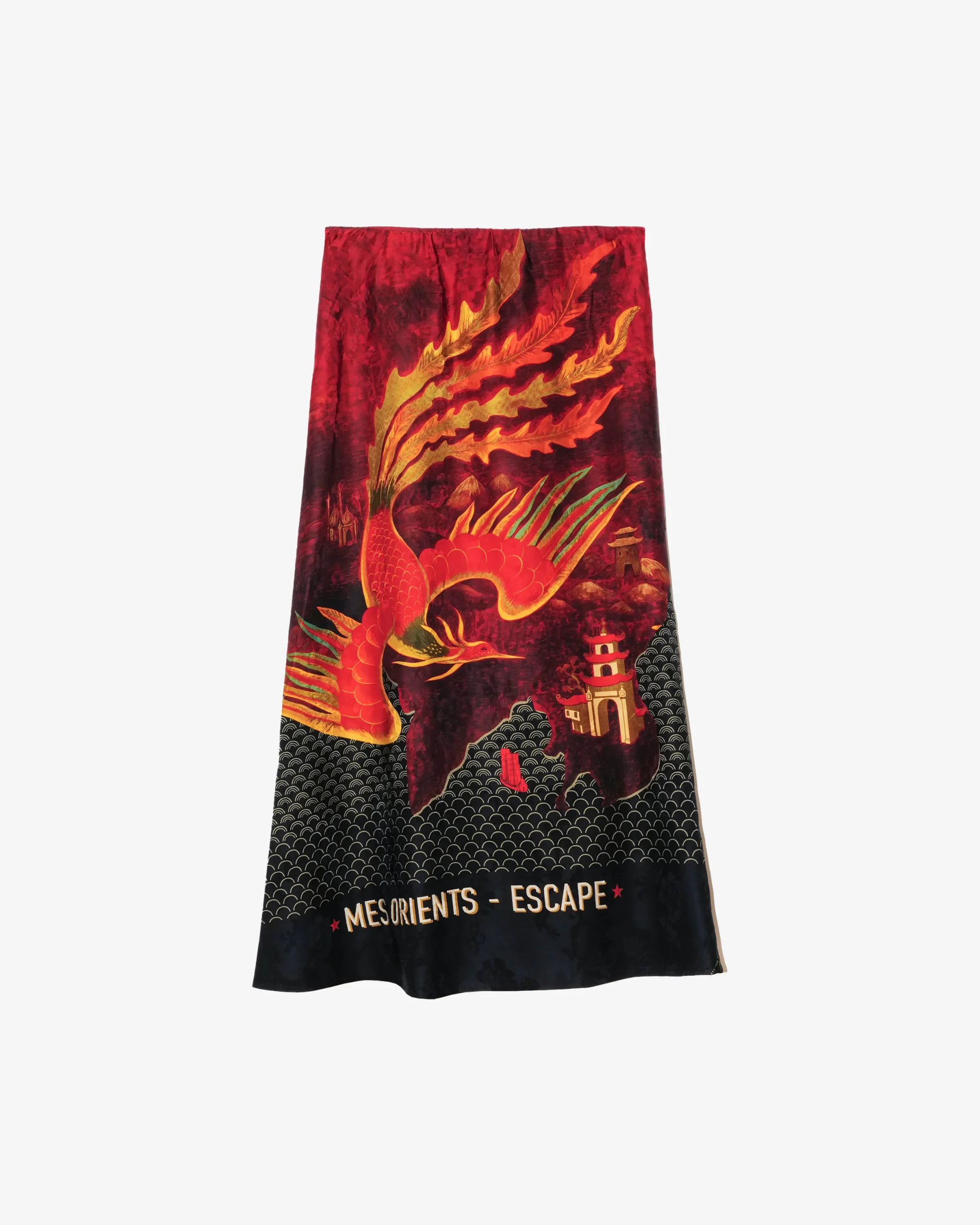 Une pièce forte et spectaculaire qui transporte dans un univers onirique, confectionnée dans un jacquard de viscose au tombé lourd et luxueux. Le tissu est magnifié par un imprimé panoramique inspiré des traditions orientales, mettant en scène un majestueux phénix aux teintes rouge et or sur un fond de paysage nocturne et mystérieux.