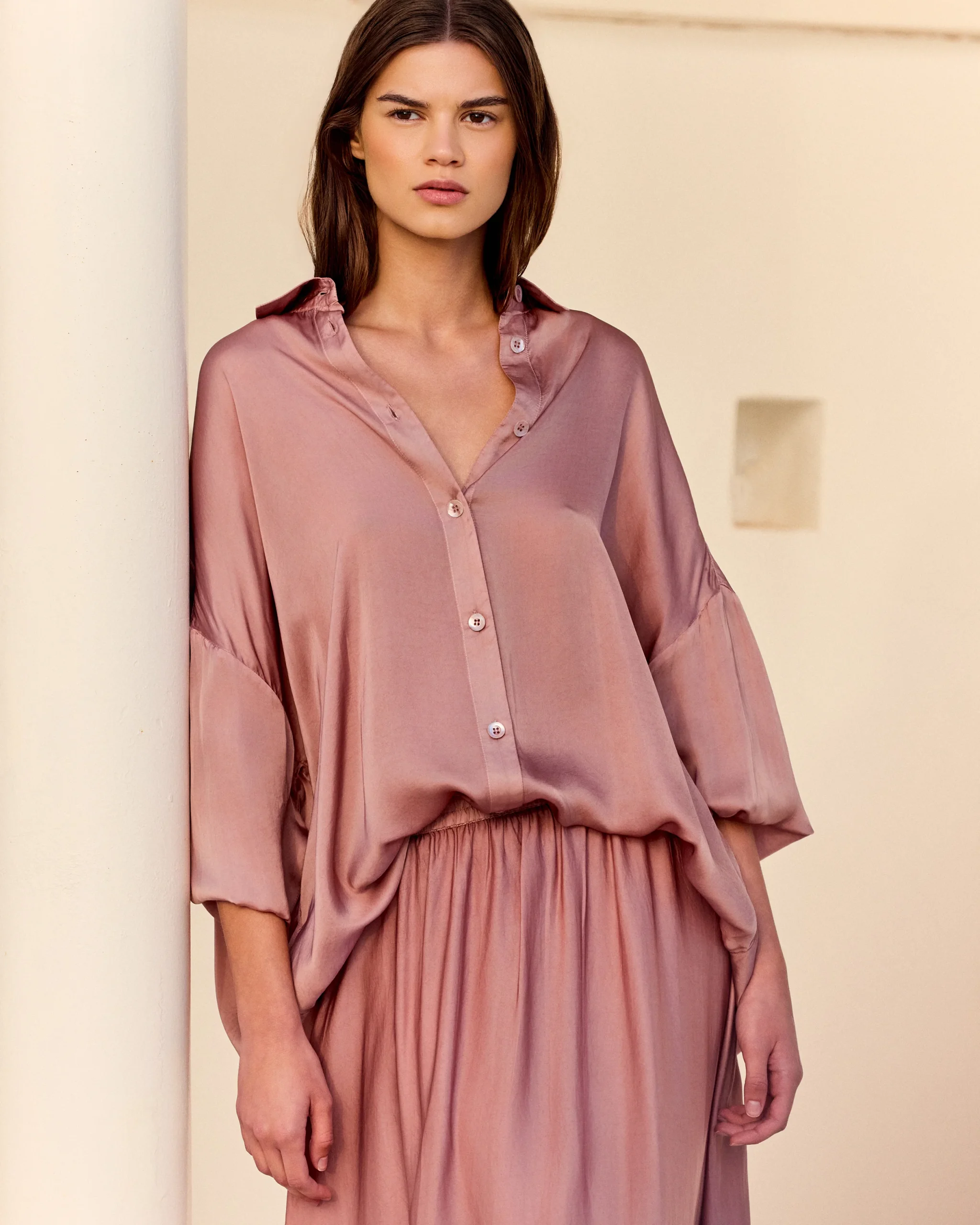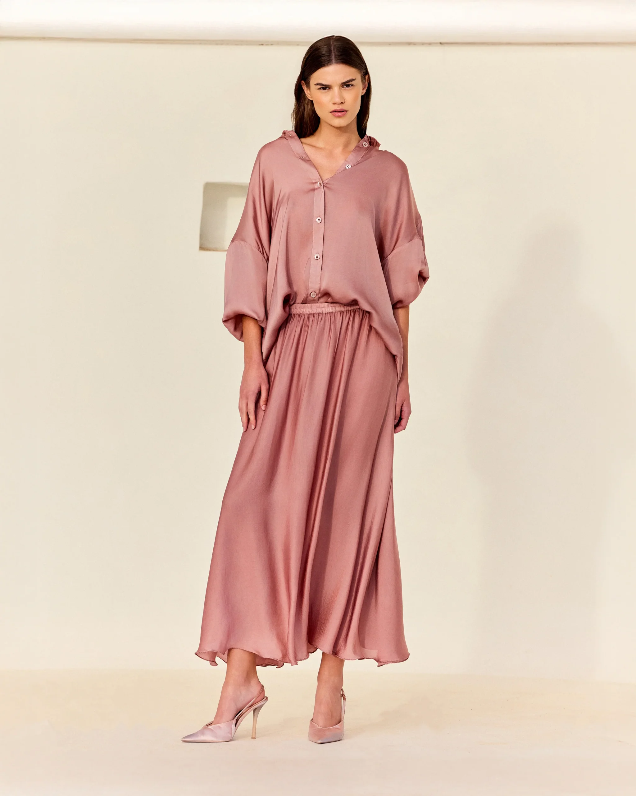 Cette jupe longue fluide en viscose satin pigment dye Petite Orchid se distingue par son tombé souple et sa brillance délicate.