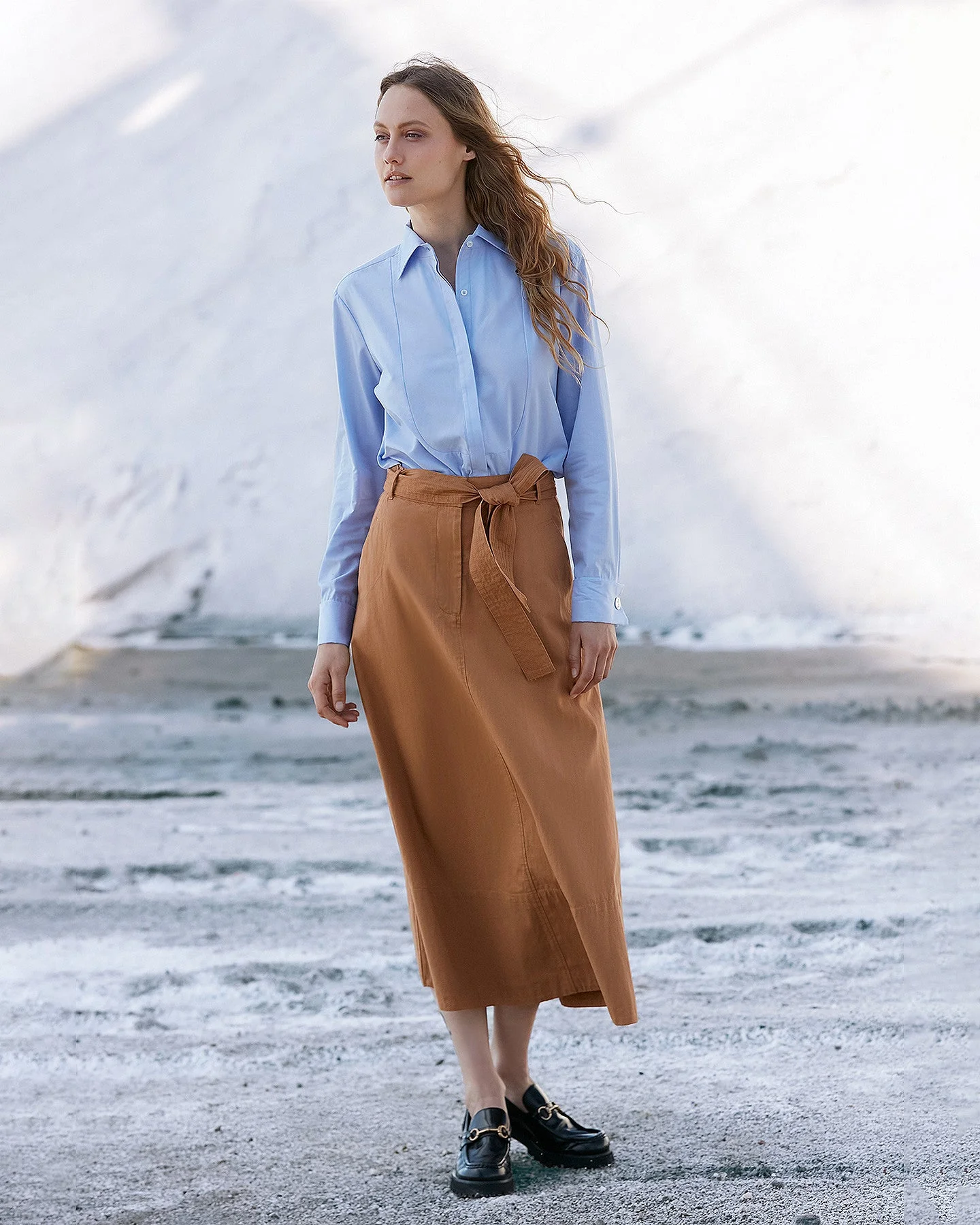 En toute légèreté, optez pour cette jupe mi-longue évasée qui descend sous le genou. Elle dessine une silhouette décontractée grâce à sa ceinture à la taille, ses poches cotées et sa douce toile de coton ocre. Elle se marie à merveille à la chemise « Stanley » bleu ciel et ainsi rivalise de féminité et de style. […]