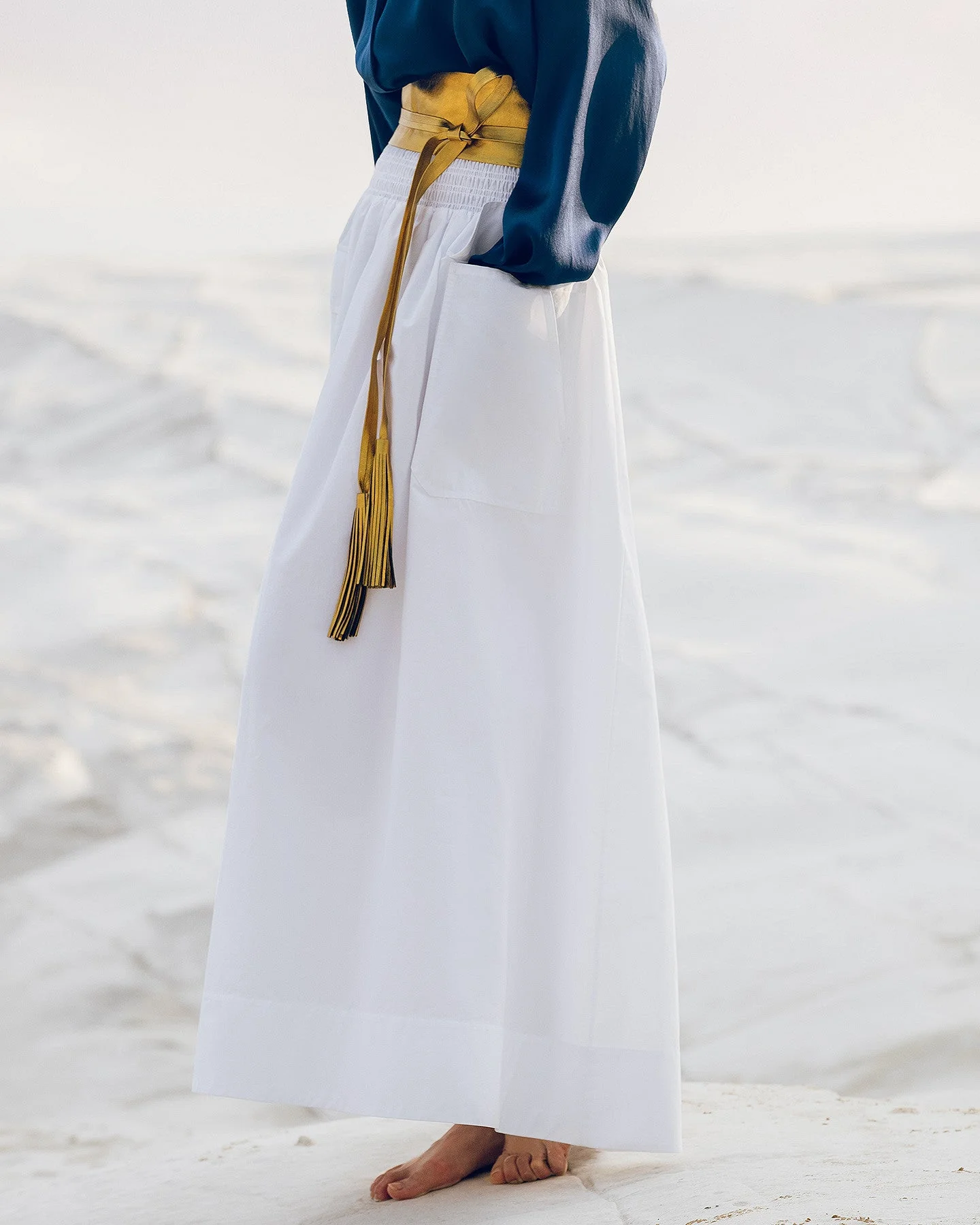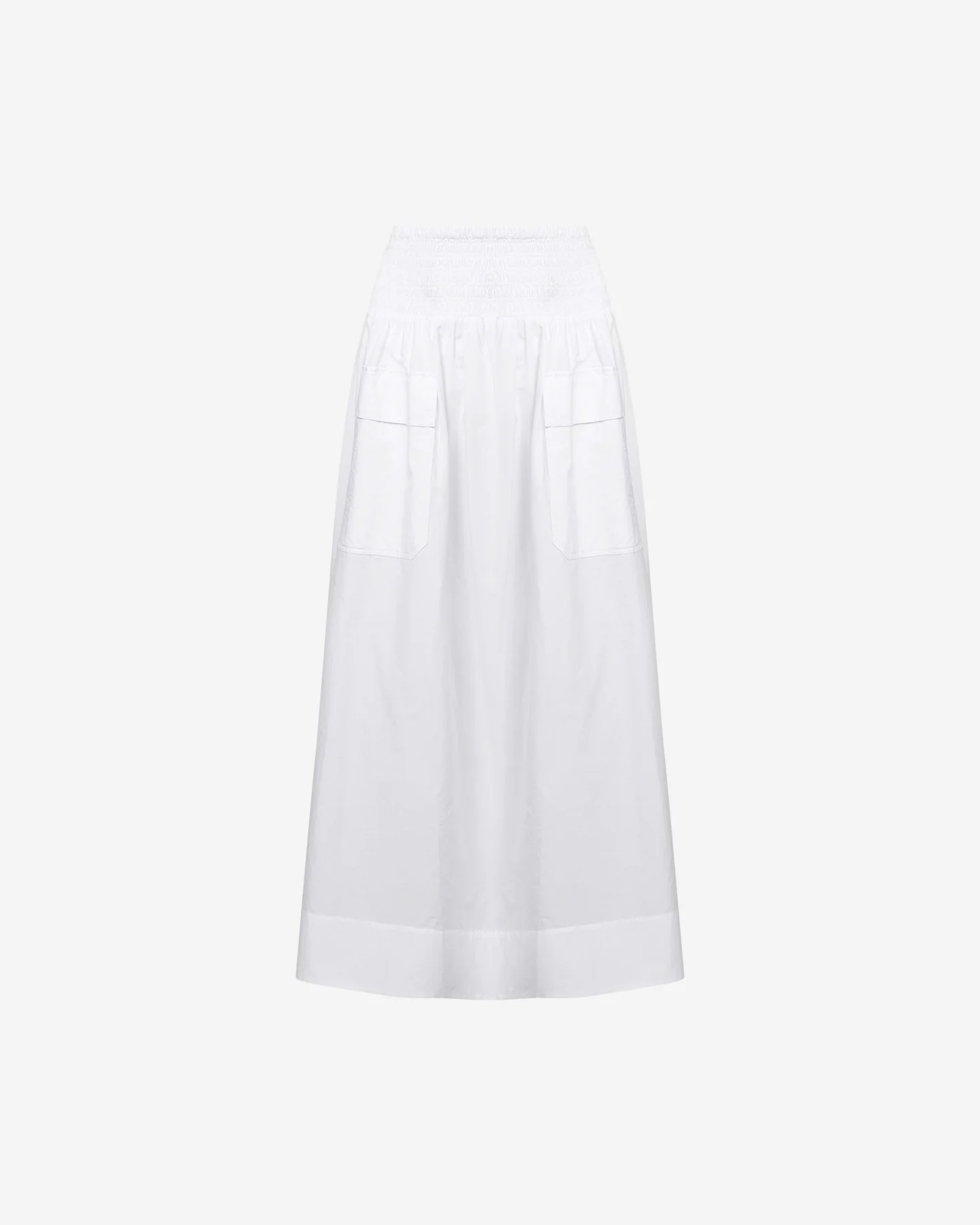 Jupe évasée en popeline de coton craquante blanche aux lignes essentielles et à la base réalisée en smocks appuyés. Deux grandes poches à revers apportent de la décontraction au modèle. Elle se transforme en robe à la poitrine selon vos envies.