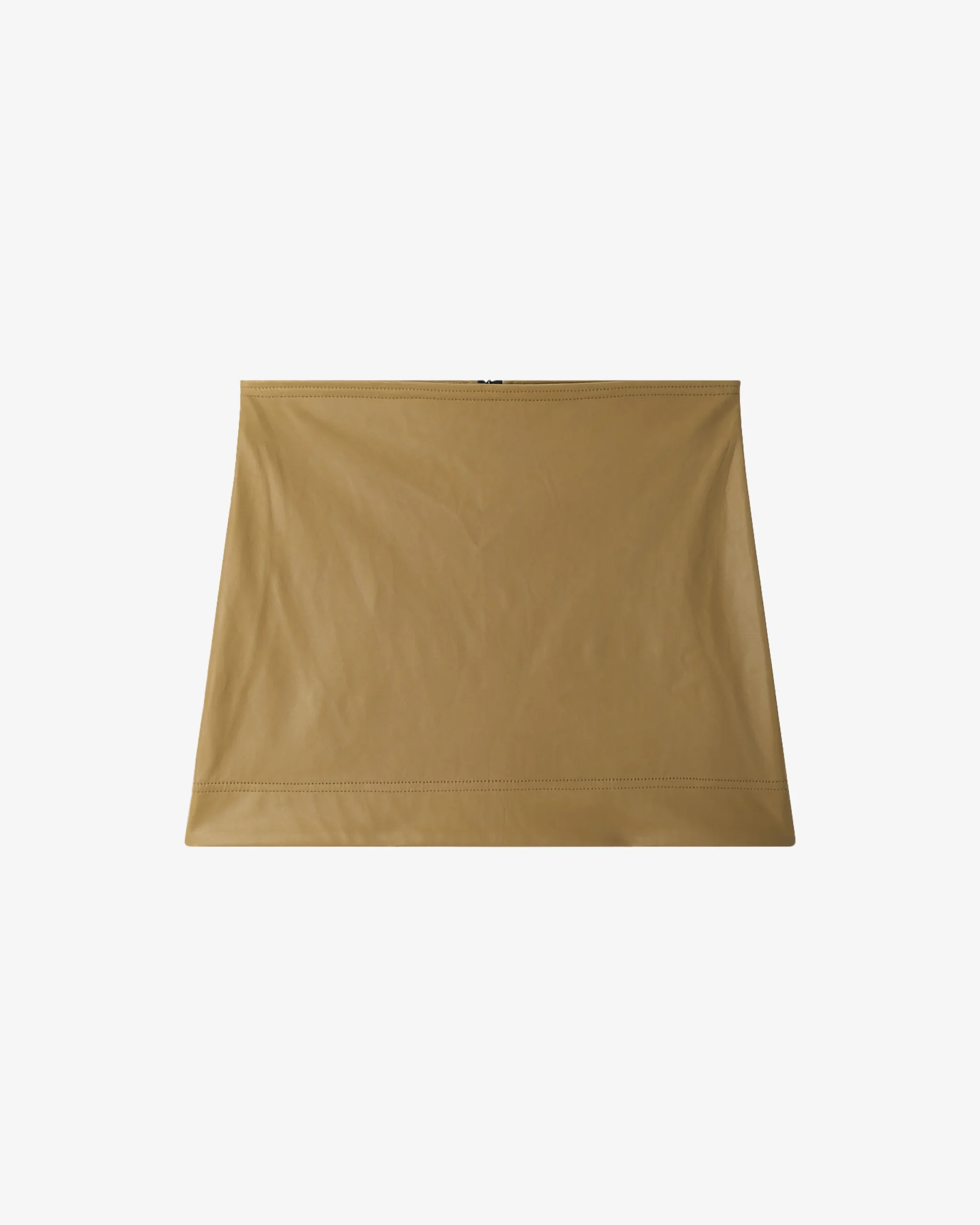 Moderne et structurée, la jupe est confectionnée dans un simili cuir souple de couleur kaki pour une allure urbaine et tendance. Sa coupe trapèze courte est soulignée par des surpiqûres horizontales et verticales qui ajoutent de la structure et du relief à la silhouette.