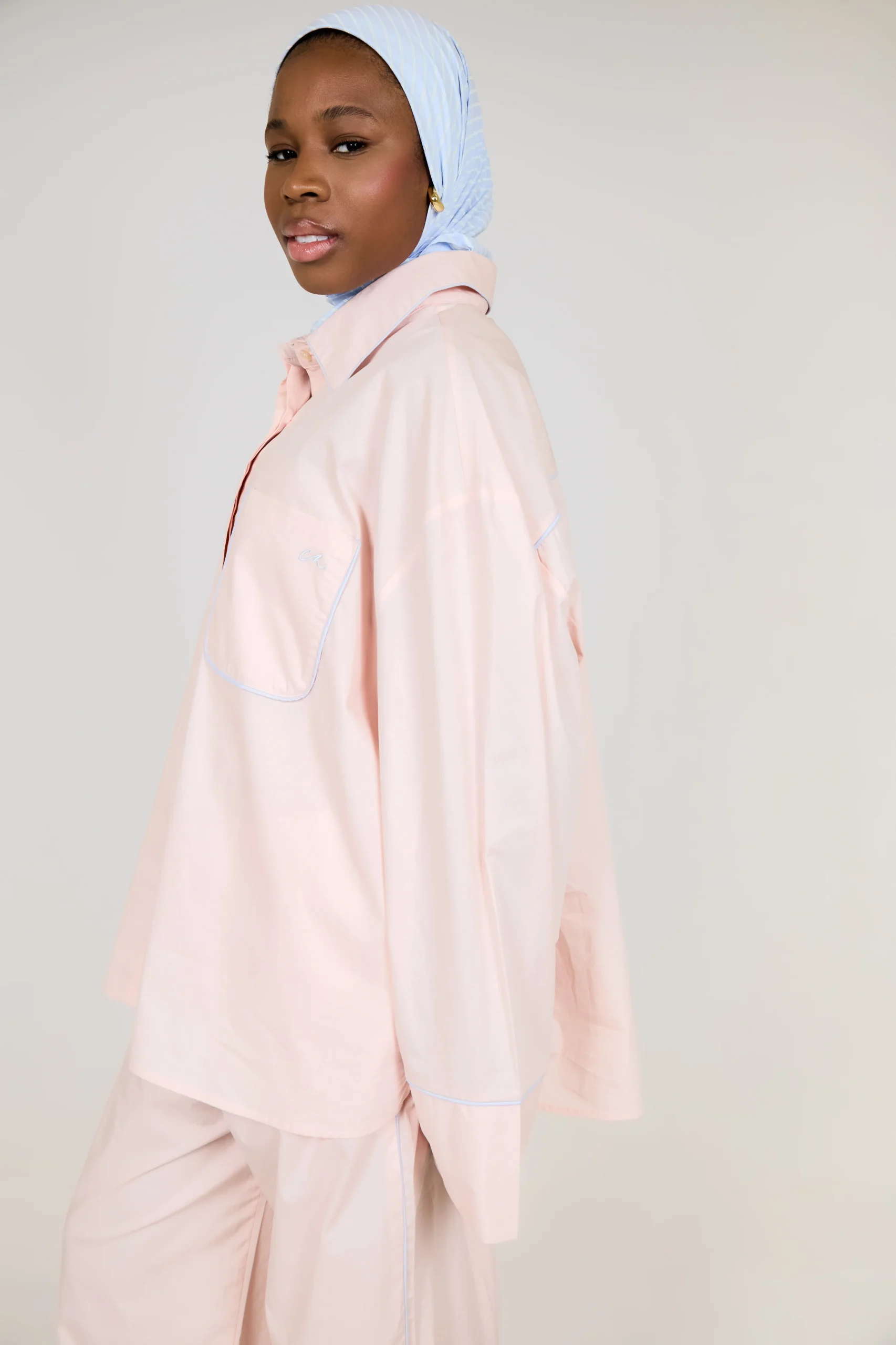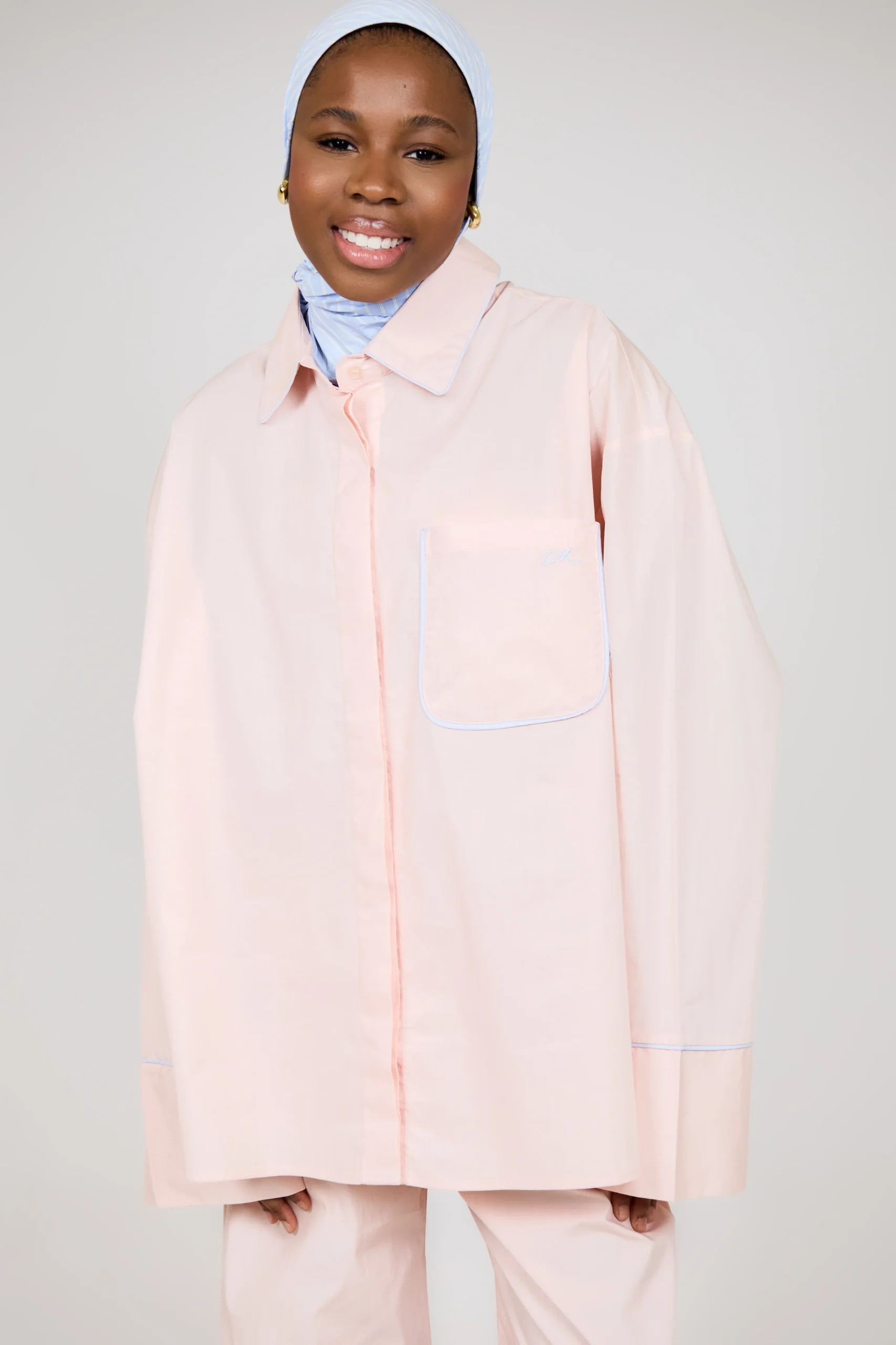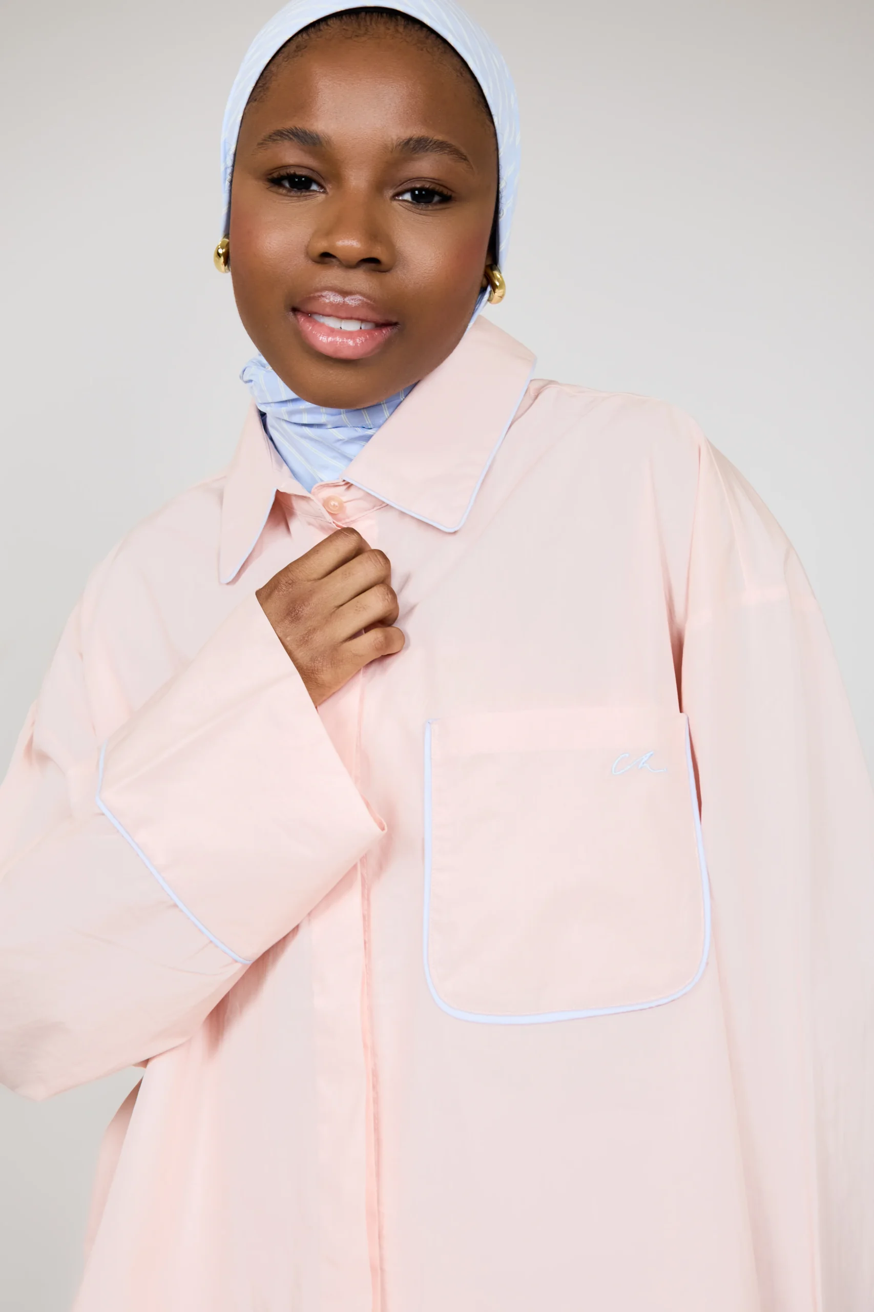 La Chemise Sunday, un haut structuré et ample en coton popeline, avec un tombé net et droit. Le détail d’une poche plaquée à l’avant soulignée d’un liseré coloré, comme sur les poignets et le col, avec une fermeture à boutons discrète. À porter ouverte ou fermée, et peut être complété en total look avec « Le Pantalon Sunday ».