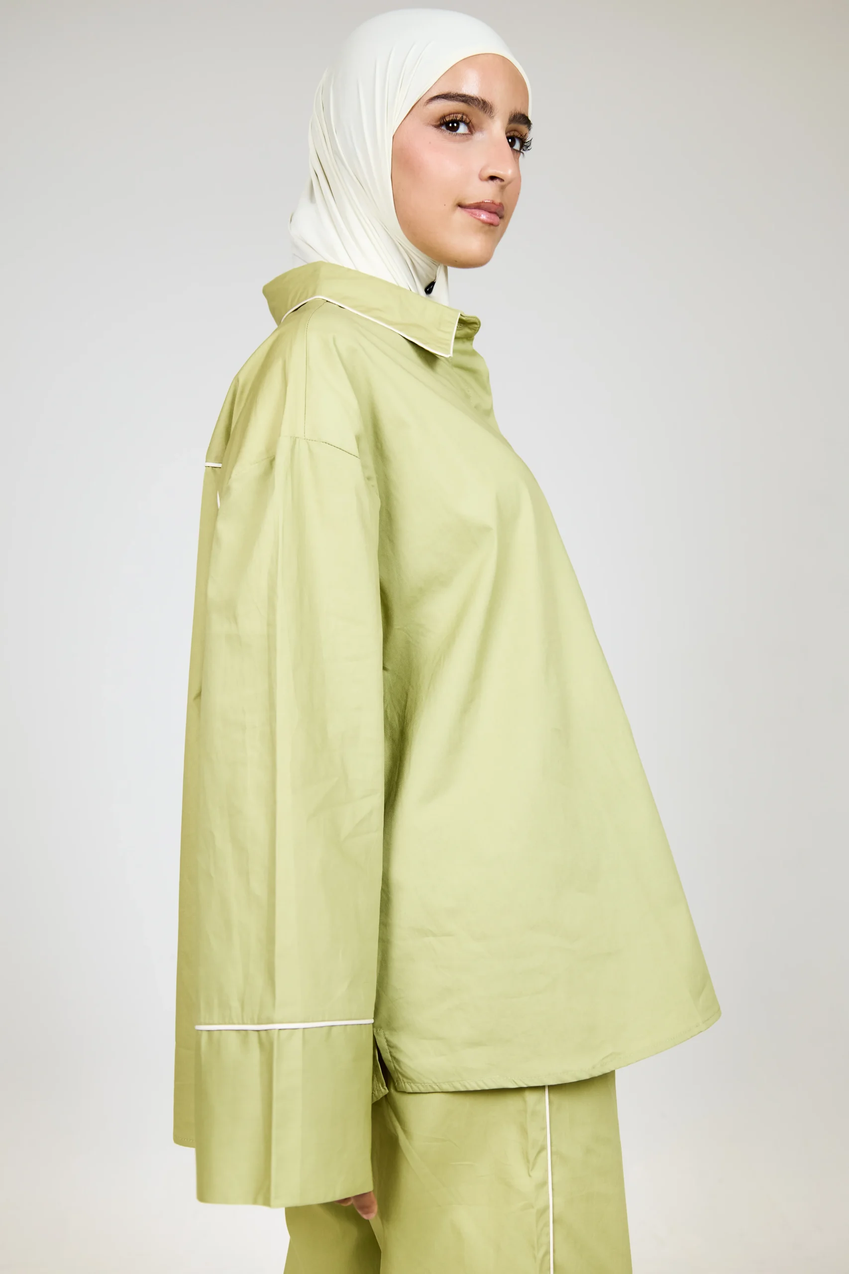 La Chemise Sunday, un haut structuré et ample en coton popeline, avec un tombée net et droit. Le détail d’une poche plaquée à l’avant soulignée d’un liseré coloré, comme sur les poignets et le col, avec une fermeture à boutons discrète. À porter ouverte ou fermée, et peut être complété en total look avec « Le Pantalon Sunday ».
