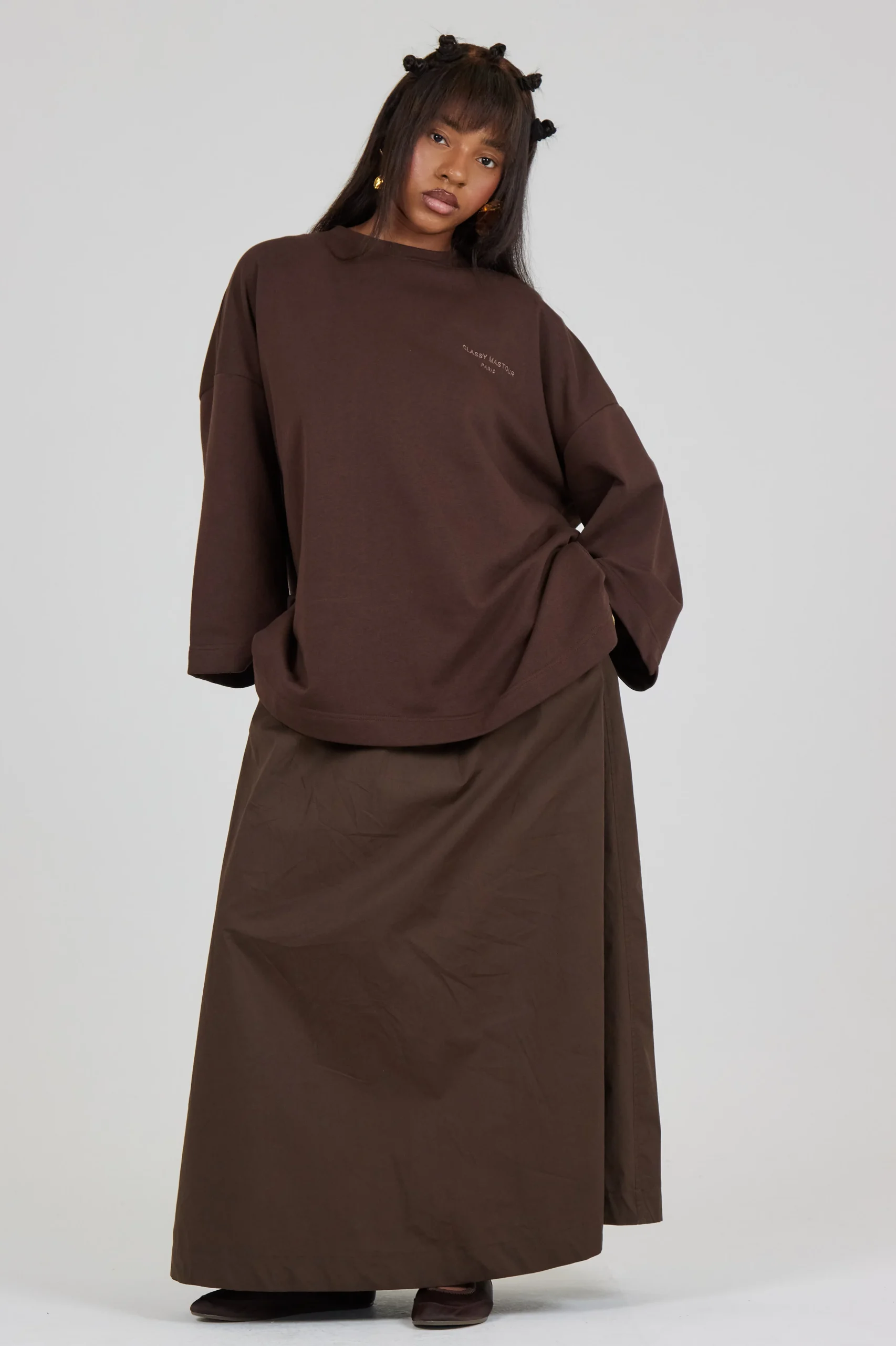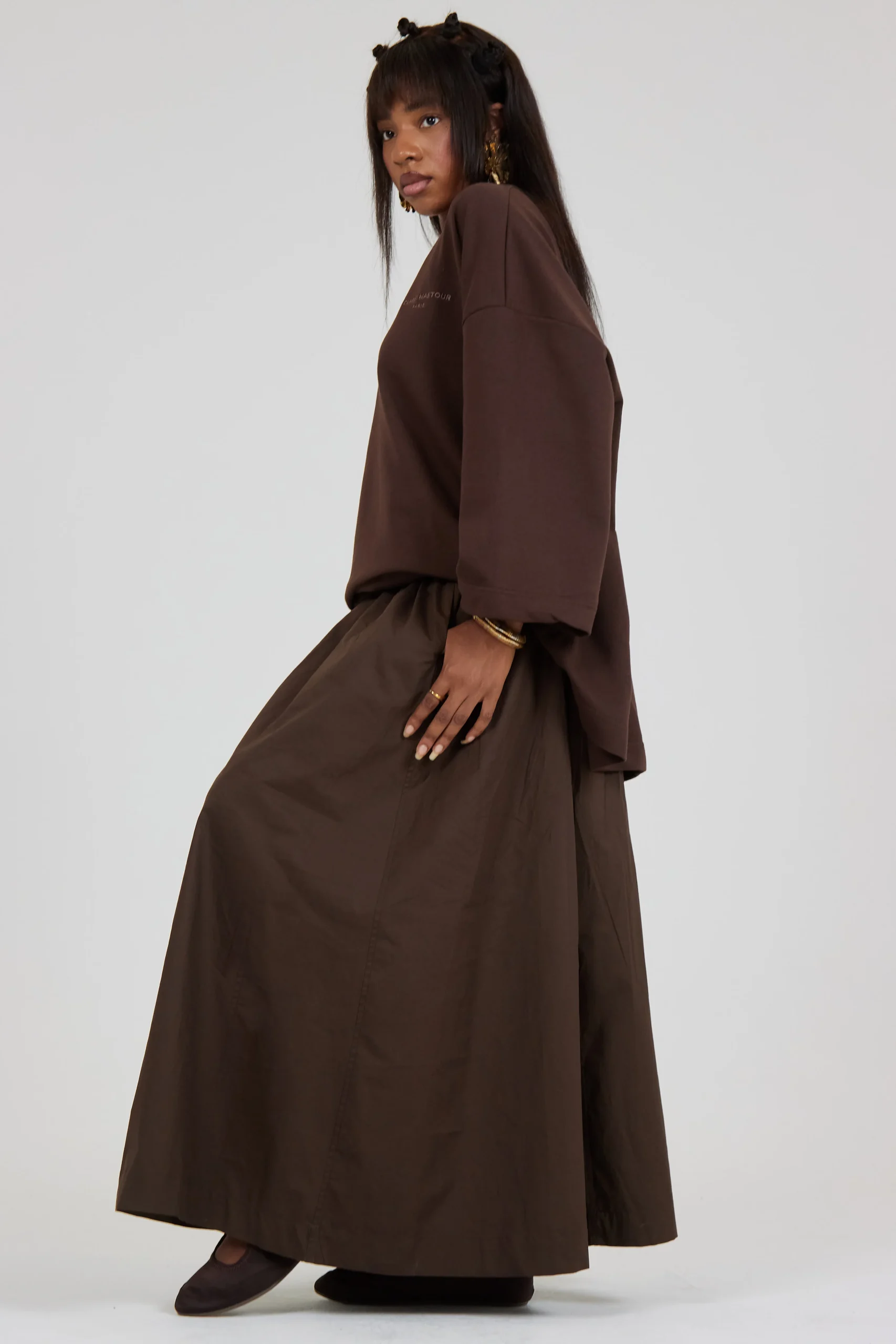 Une jupe longue trapèze, en popeline de coton, dans une coupe ample et volumineuse, à poches. Pour assurer un rendu opaque et plus épais, elle est entièrement doublée en lin. La taille est à élastique, et est disponible dans deux largeurs.