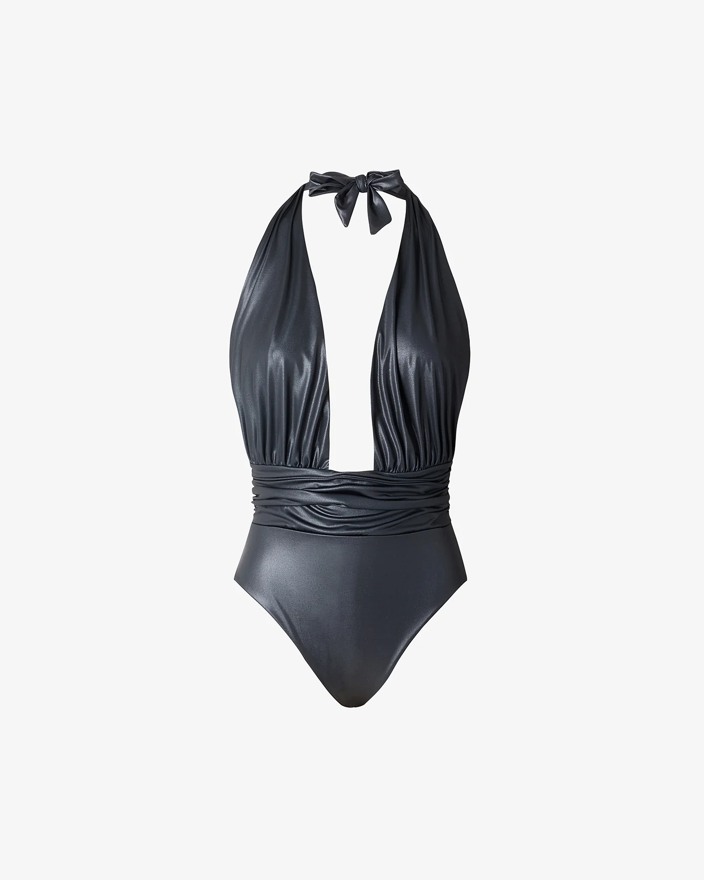 Sculptural et résolument sophistiqué, ce maillot de bain une pièce séduit par son tissu noir à l’effet mouillé, subtilement irisé, qui capte la lumière et sublime la silhouette. La poitrine est délicatement dissimulée sous deux larges bandes froissées, à nouer derrière le cou, créant un décolleté élégant façon drapé. La base du maillot, également travaillée en matière froissée, ajoute texture et volume tout en épousant harmonieusement les courbes. Un modèle audacieux et raffiné, pensé pour celles qui veulent conjuguer allure couture et esprit balnéaire.
