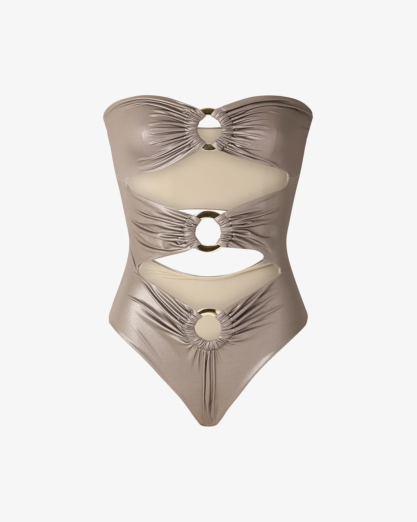 Audacieux et éclatant, ce maillot de bain une pièce façon bustier attire tous les regards avec sa matière effet mouillé taupe, ultra brillante et sensuelle. Trois grands anneaux métalliques structurent le devant du maillot : un entre la poitrine, un au creux du ventre et un dernier au niveau de la culotte, créant de subtils ajours qui laissent entrevoir la peau avec élégance. Cette construction graphique sublime les courbes tout en assurant un maintien flatteur. Une pièce statement, pensée pour celles qui aiment allier glamour doré et design audacieux.