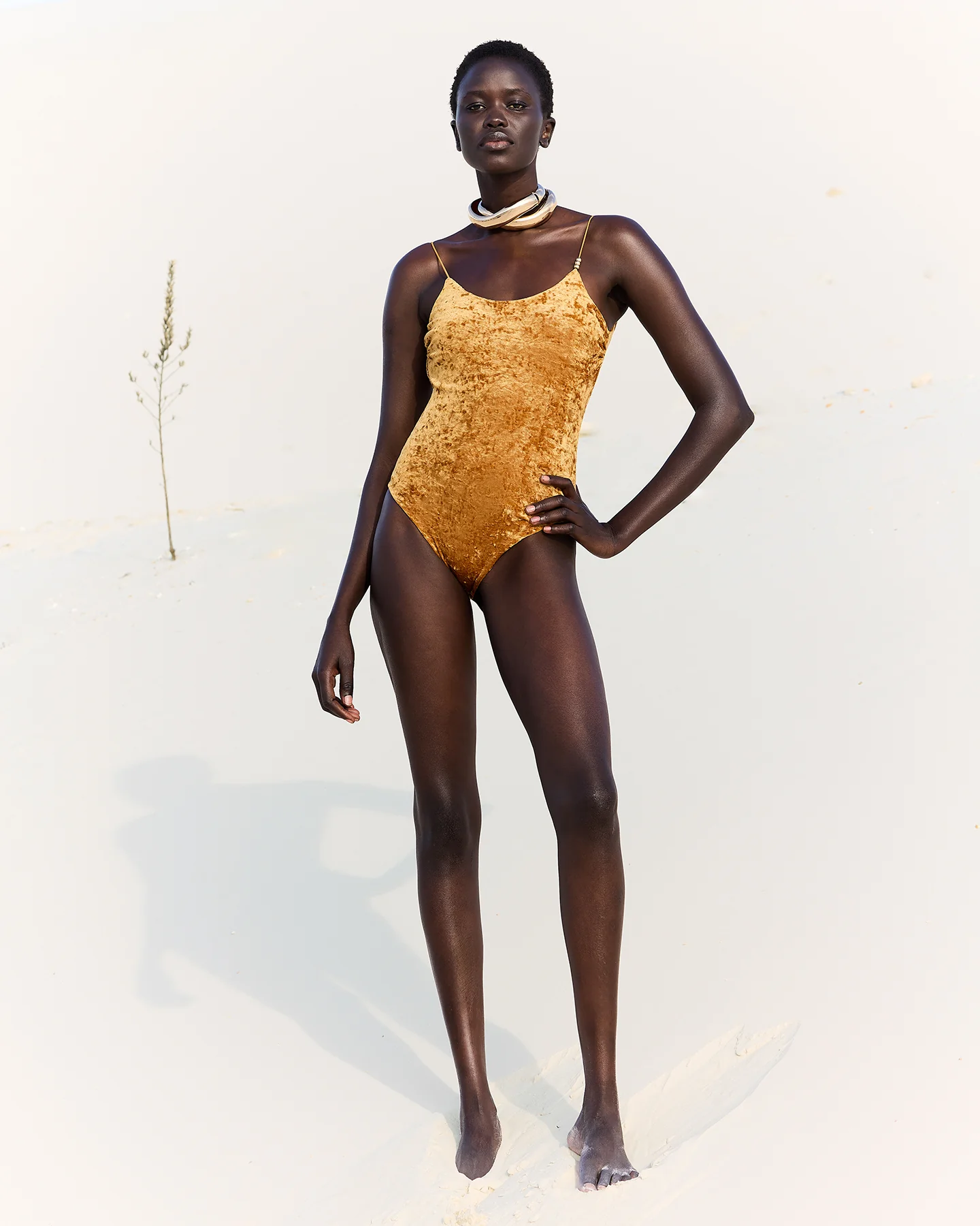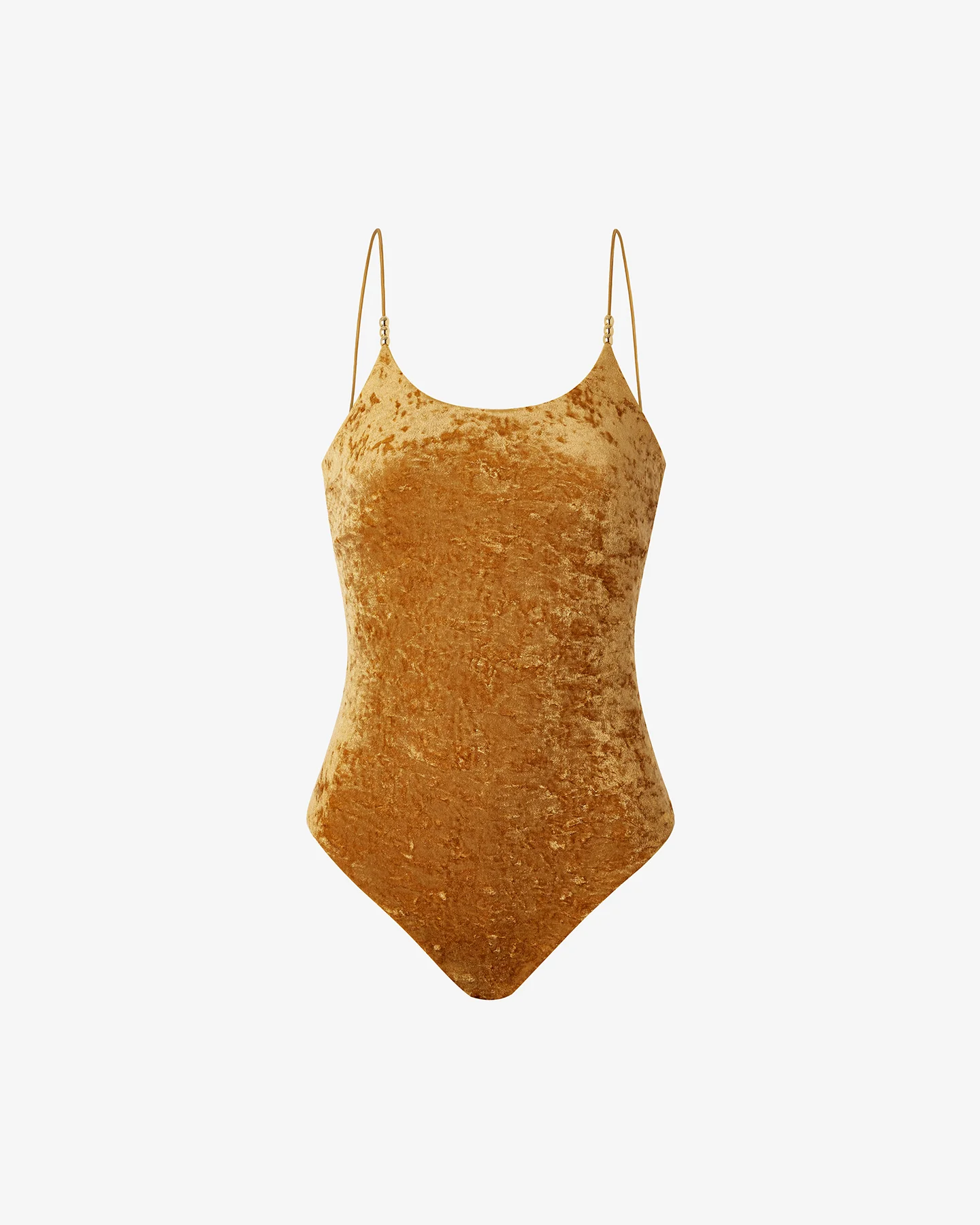 Épure et raffinement s’unissent dans ce maillot de bain une pièce en tissu effet panne de velours, à la texture douce et légèrement brillante. Sa teinte ocre, romantique et lumineuse, sublime toutes les carnations avec délicatesse. La coupe minimaliste est rehaussée par un jeu de perles argentées sur chaque bretelle, détail bijou discret mais précieux. Le dos, très dégagé, révèle la peau avec élégance, tandis que la matière froncée au niveau des fesses dessine une silhouette flatteuse et féminine. Une pièce subtilement glamour, pensée pour briller tout en finesse.