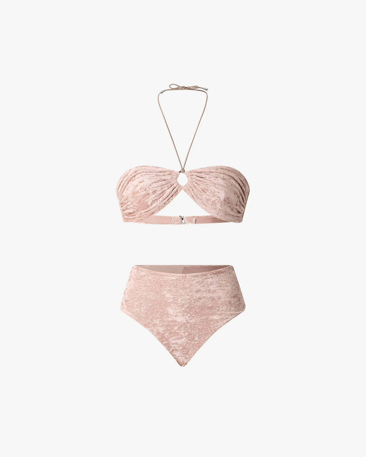 Chic et sensuel, ce maillot de bain 2 pièces couleur rose pâle se distingue par son tissu effet panne de velours, délicatement froissé et subtilement brillant. Sa texture veloutée capte la lumière pour une allure sophistiquée au bord de l’eau. Le haut bandeau, épuré et élégant, se noue autour du cou grâce à un lien fin, apportant maintien et féminité. La culotte taille haute sculpte la silhouette tout en douceur, pour un look à la fois rétro et contemporain. Une pièce précieuse au charme discret, pensée pour sublimer toutes les courbes avec grâce.