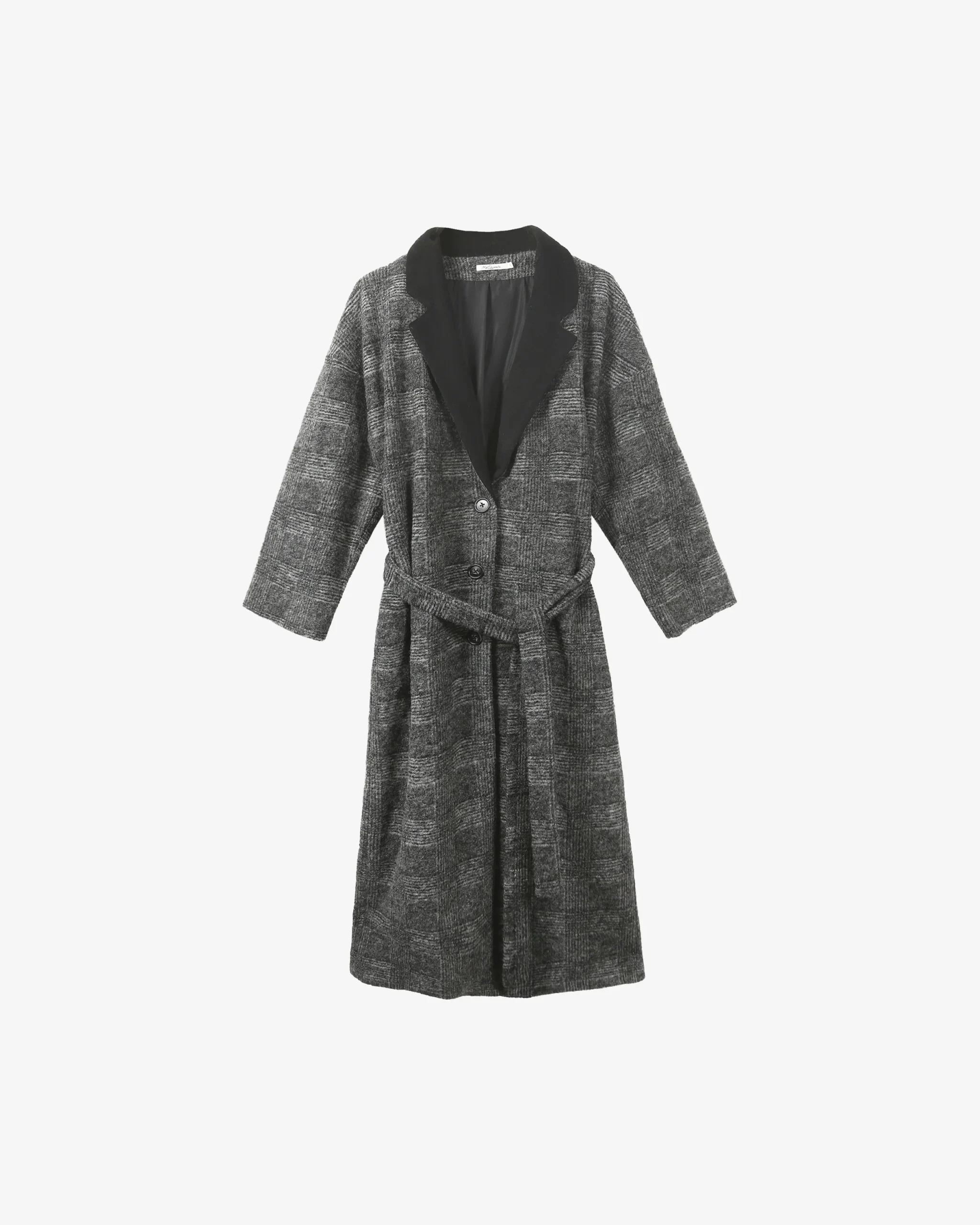 Ce manteau s’impose comme une pièce maîtresse d’une élégance intemporelle avec sa maille texturée grise au motif à carreaux subtil. Sa coupe longue et structurée est rehaussée par un col tailleur contrasté noir et une ceinture à nouer qui permet de dessiner la taille selon vos envies. Un manteau à l’allure chic et enveloppante, conçu pour affronter le froid avec un raffinement absolu.