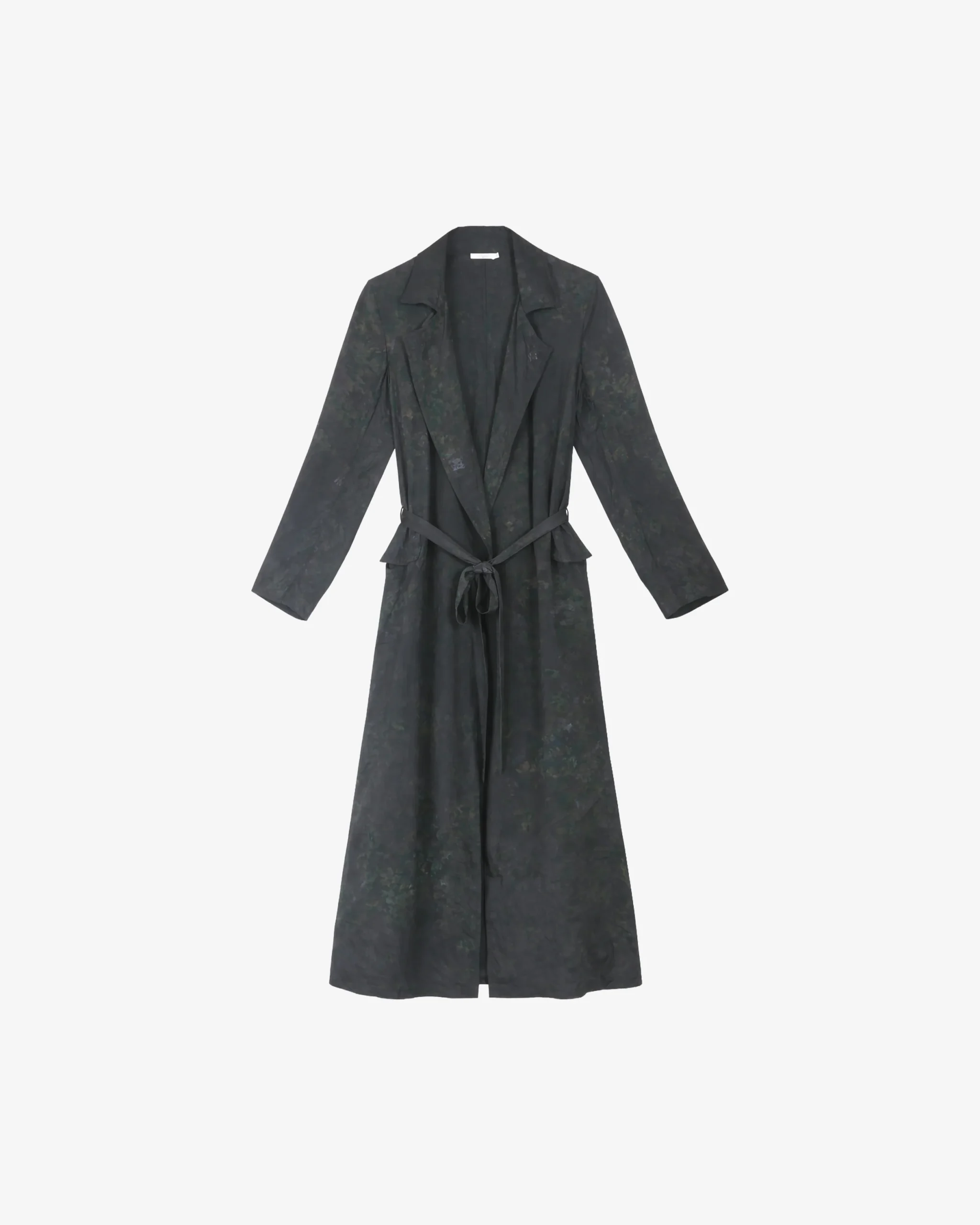 Ce long manteau fluide en soie légère s’habille d’un noir profond, animé par un imprimé onirique aux reflets ténébreux et subtils. Sa silhouette élégante, dotée d’un col à revers et de poches à rabats, se structure gracieusement à l’aide d’une ceinture coordonnée à nouer.