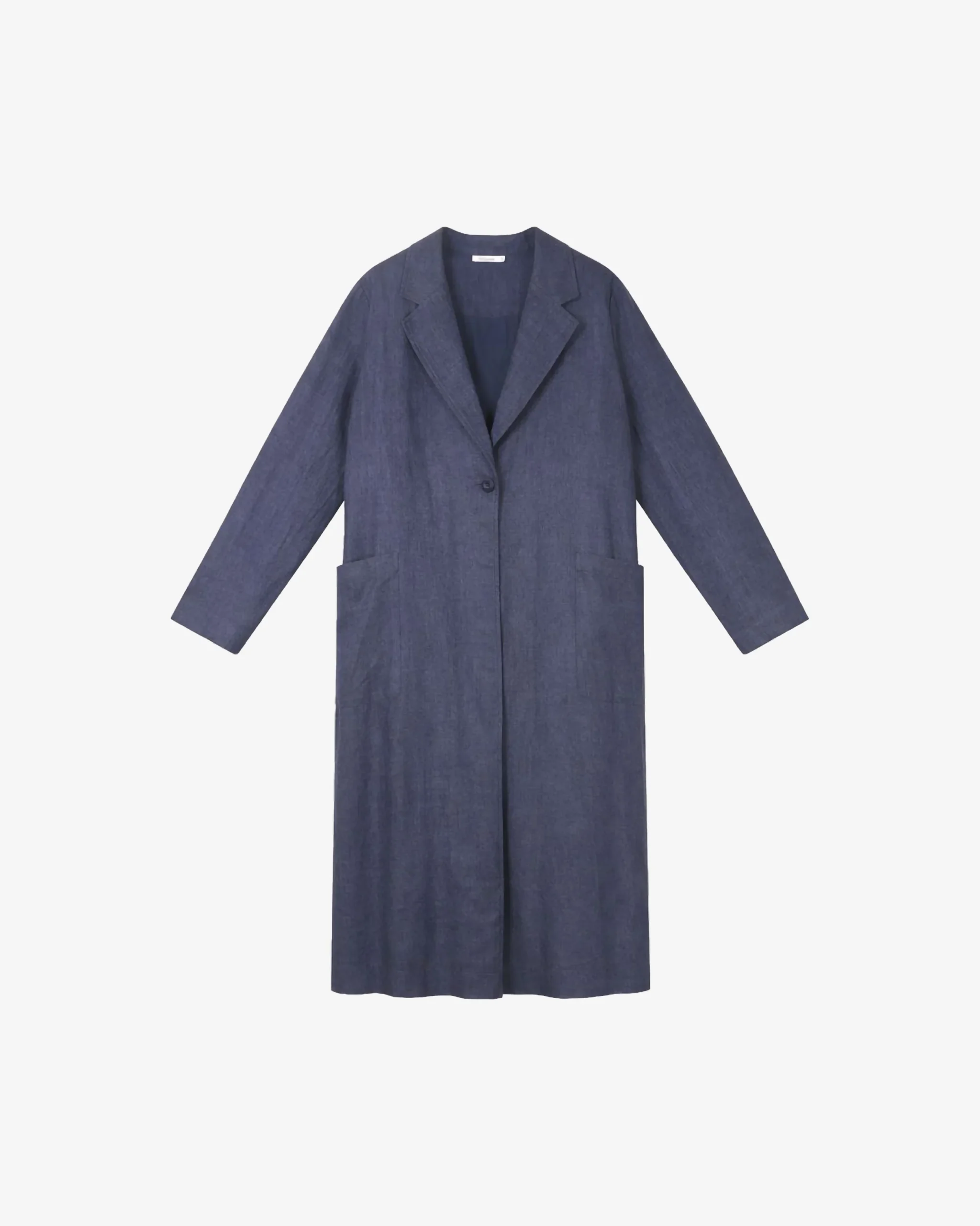 Laissez-vous séduire par ce long manteau en lin, à revers, qui est doté de grandes poches latérales et une fermeture en « V ». Enfilez-le aisément par-dessus tous vos pulls pour cet hiver à venir.