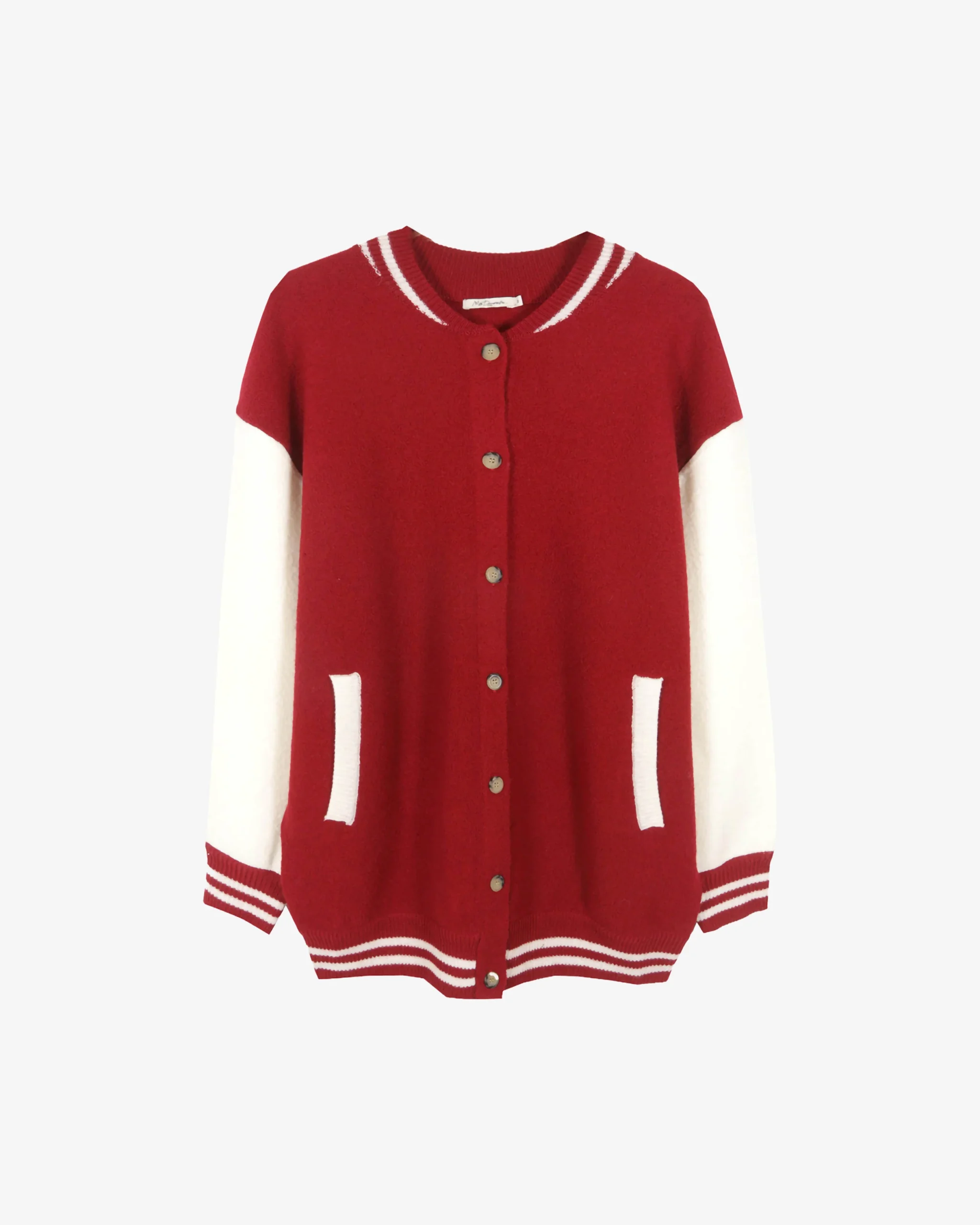 Ce manteau boutonné s’inspire de l’esthétique « varsity » avec son coloris rouge vibrant contrasté par des manches longues d’un blanc pur. Sa silhouette décontractée présente une encolure arrondie, deux poches passepoilées blanches sur le devant et des finitions côtelées rayées aux poignets ainsi qu’à la base.