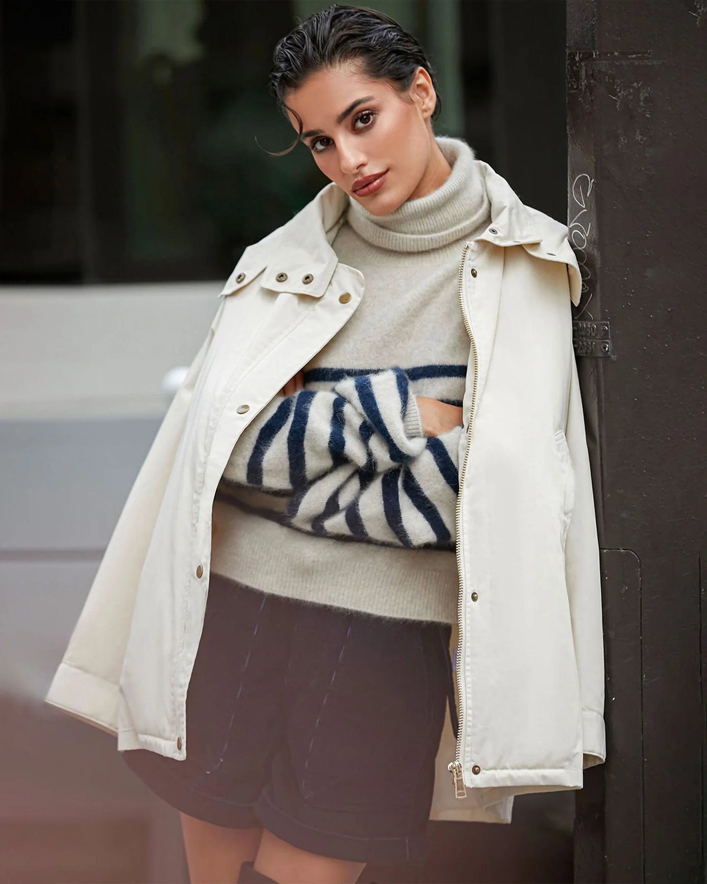 Un style utilitaire et chic, cette veste est parfaite pour les journées de mi-saison. Confectionnée dans un tissu résistant de couleur ivoire, elle offre une coupe courte et confortable. Elle se distingue par sa grande capuche et son col montant boutonné, assurant une protection efficace contre les intempéries tout en conservant une allure moderne et décontractée.