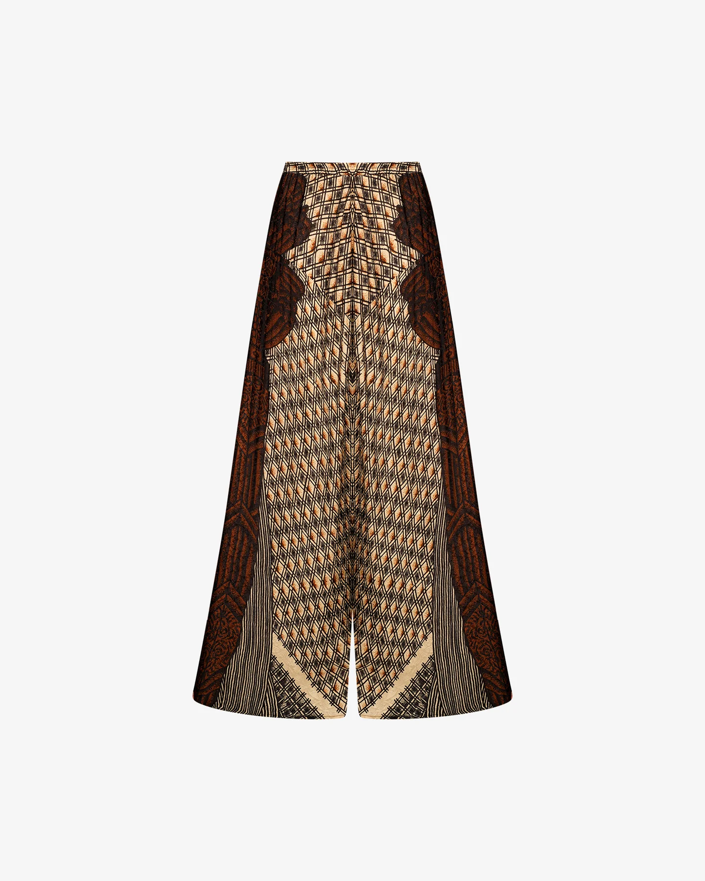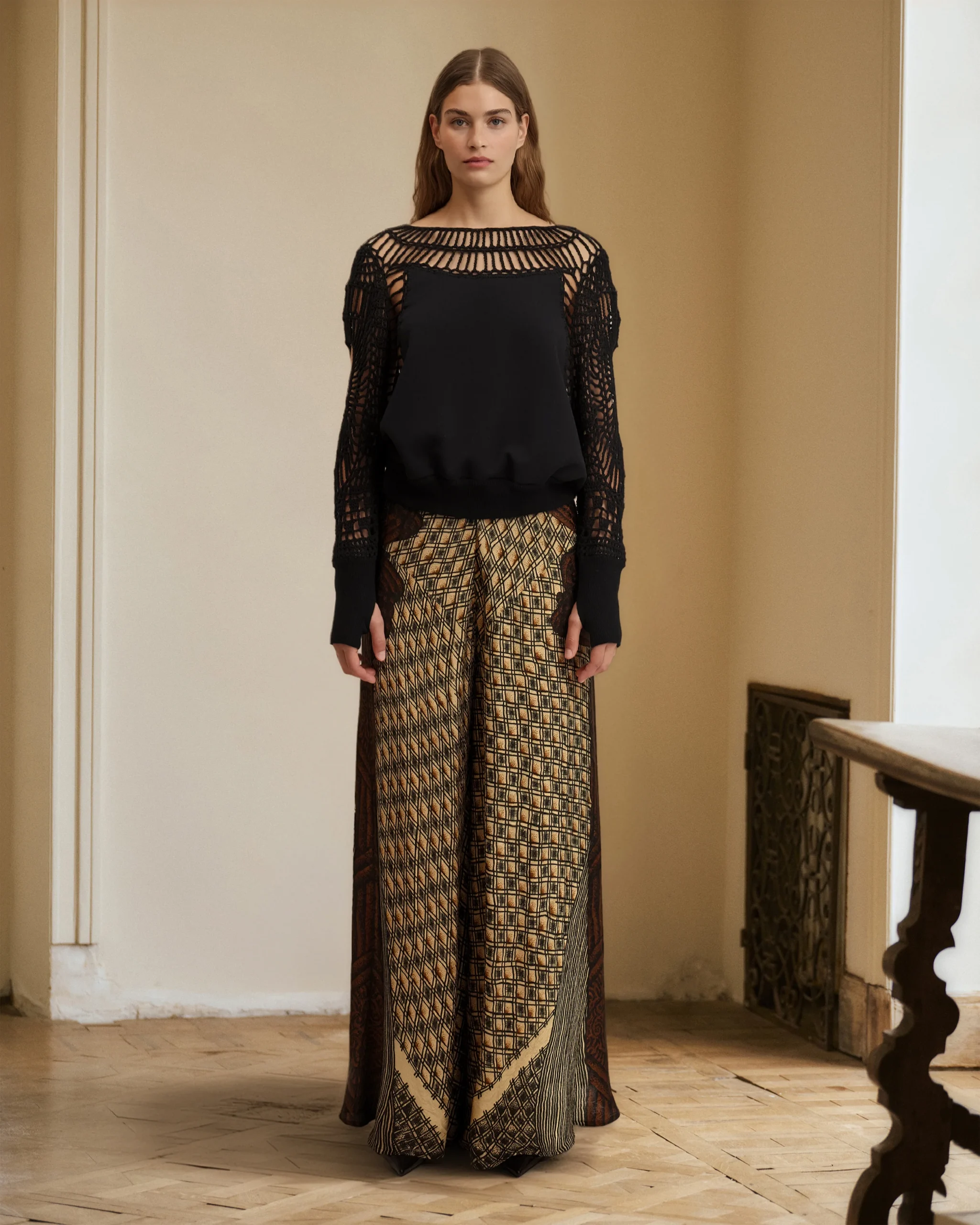 Ce pantalon long et large est une pièce audacieuse qui allie confort et style avec brio. L’imprimé placé, plus foncé sur les côtés, crée un effet visuel flatteur qui allonge la silhouette tout en ajoutant une touche de dynamisme. Inspiré par les tons de l’automne, cet imprimé apporte une richesse de couleur et une ambiance chaleureuse à la tenue. La coupe près du corps sur le haut du pantalon met en valeur la silhouette, tandis que la coupe extra large sur le bas apporte une touche de modernité et de fluidité à l’ensemble. Cette combinaison de coupes crée un équilibre parfait entre structure et mouvement, offrant un confort optimal sans sacrifier le style.