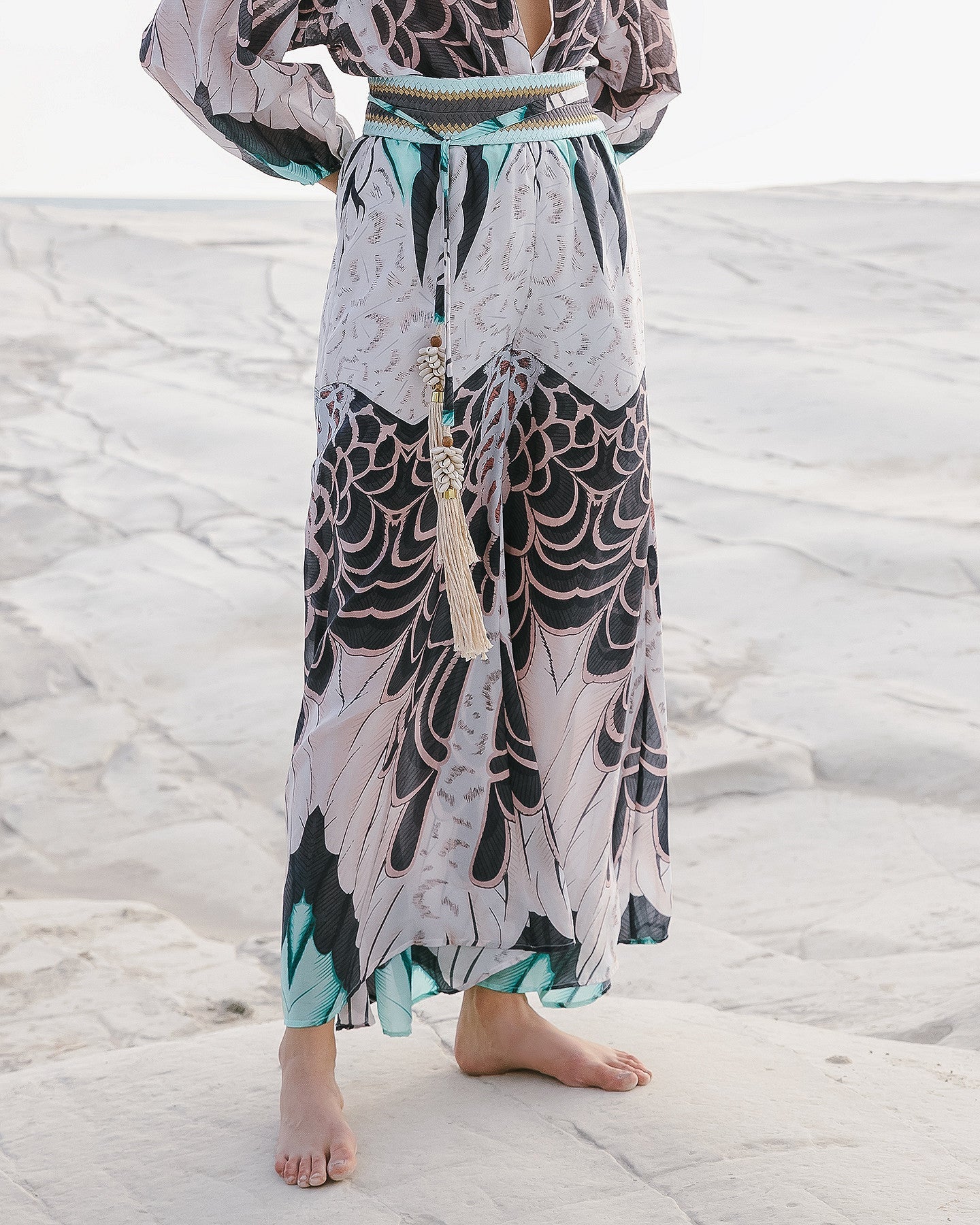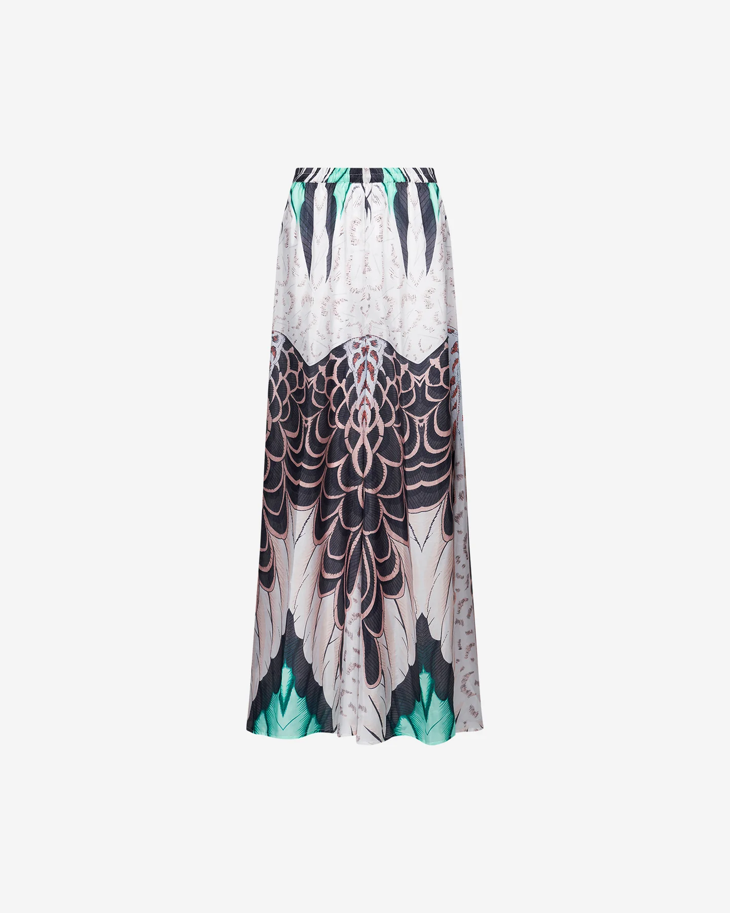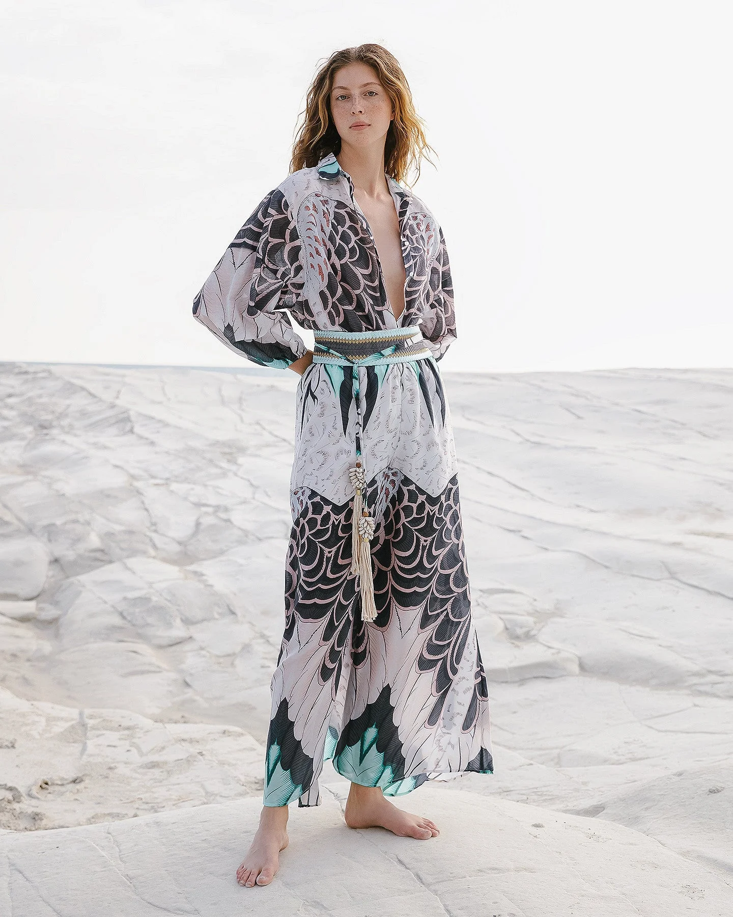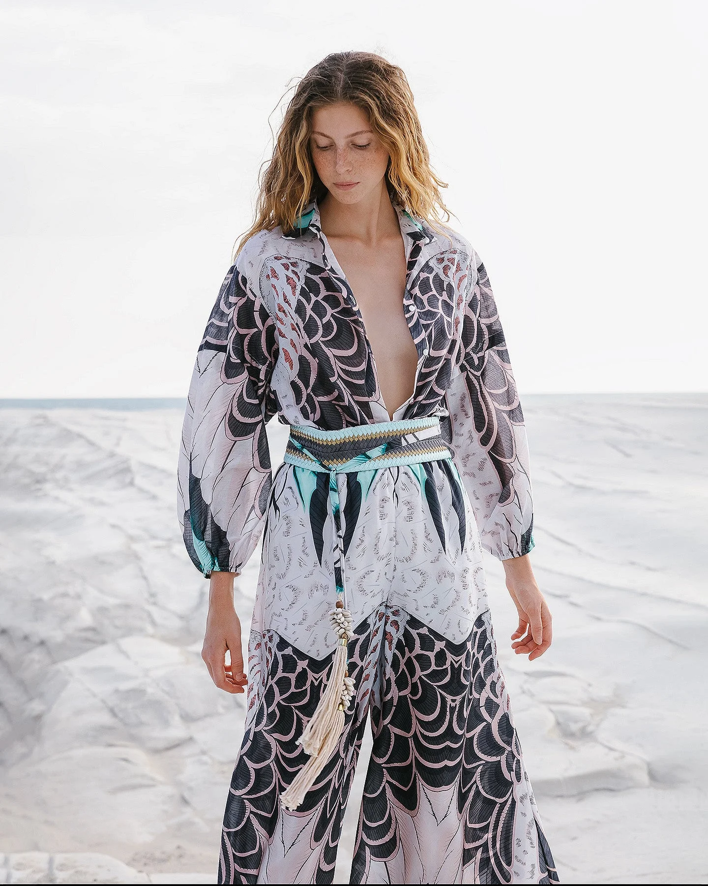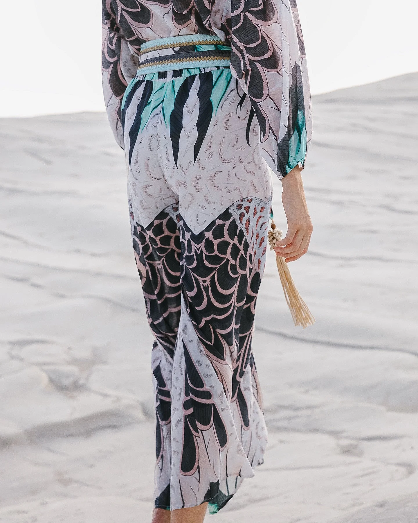 Fluide, désinvolte, notre pantalon en soie habotai trouve une parfaite élégance dans sa coupe large. Le délicat imprimé d’un phoenix revisité est placé judicieusement sur le modèle. La ceinture est élastiquée pour plus de confort.