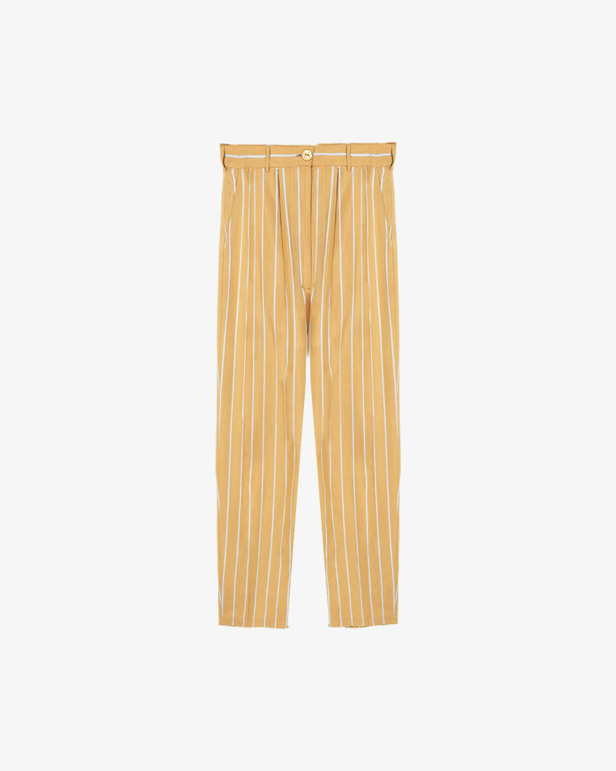 Souple et super féminin, ce pantalon en soie et coton mélangés parcouru de fines rayures est le compagnon parfait des tenues de saison. Sa forme décontractée est accentuée par des pinces à la taille, les jambes se resserrent légèrement dans le bas pour une coupe moderne et épurée. Des poches cotés sont présentes pour le confort.