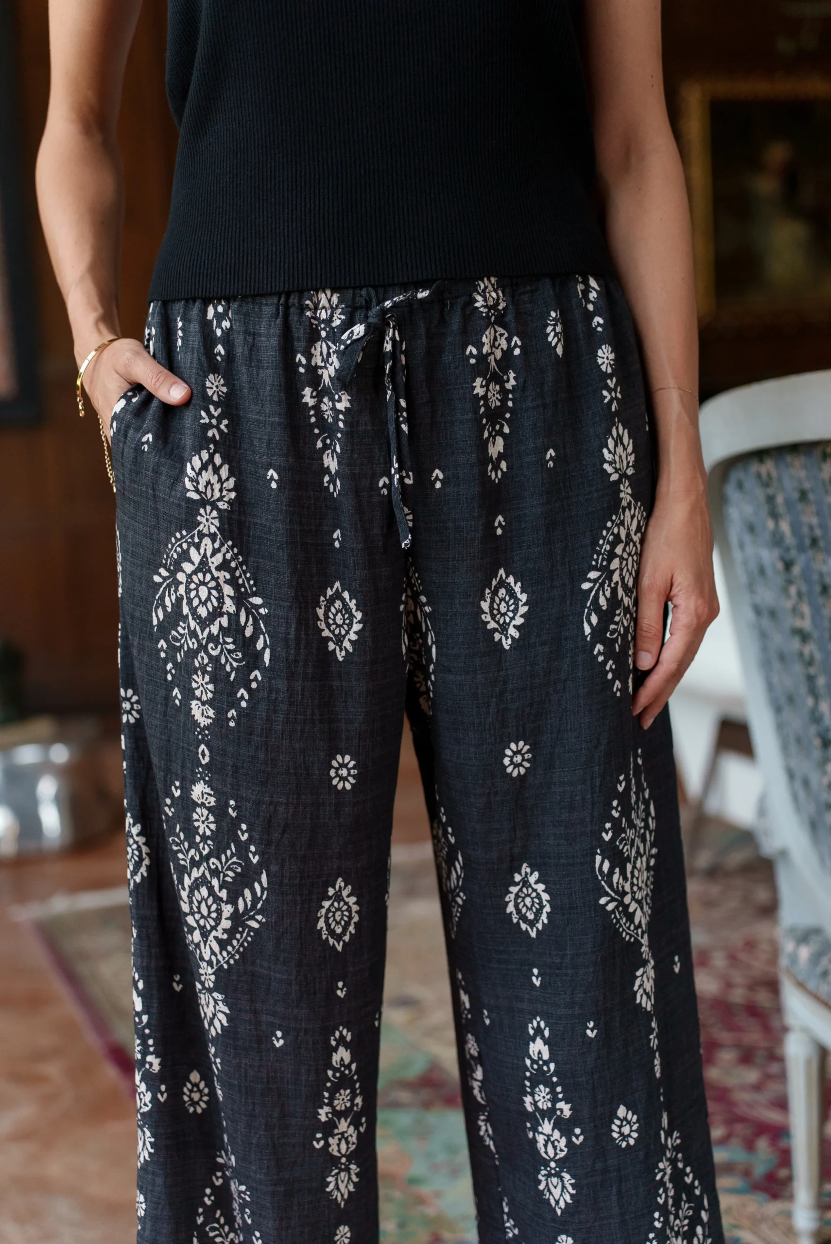 Découvrez le pantalon Calie et ses imprimés bohème chic pour plus de charme. Sa fluidité et sa coupe droite vous offrent un confort exceptionnel tout au long de la journée. Ses poches latérales ajoutent une touche pratique et décontractée pour un rendu élégant. Polyvalent et chic, ce pantalon est parfait pour créer une tenue à la fois décontractée et sophistiquée.