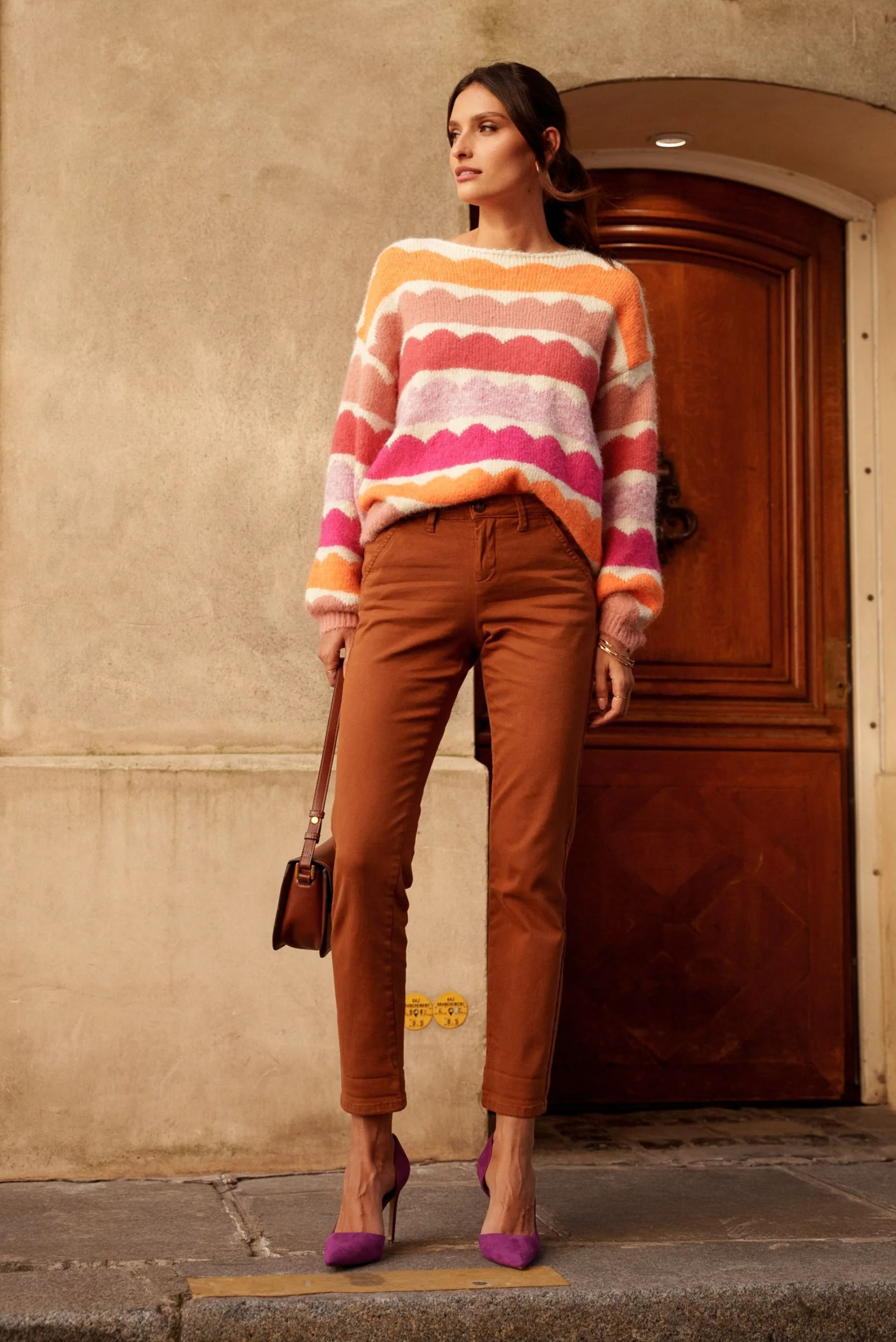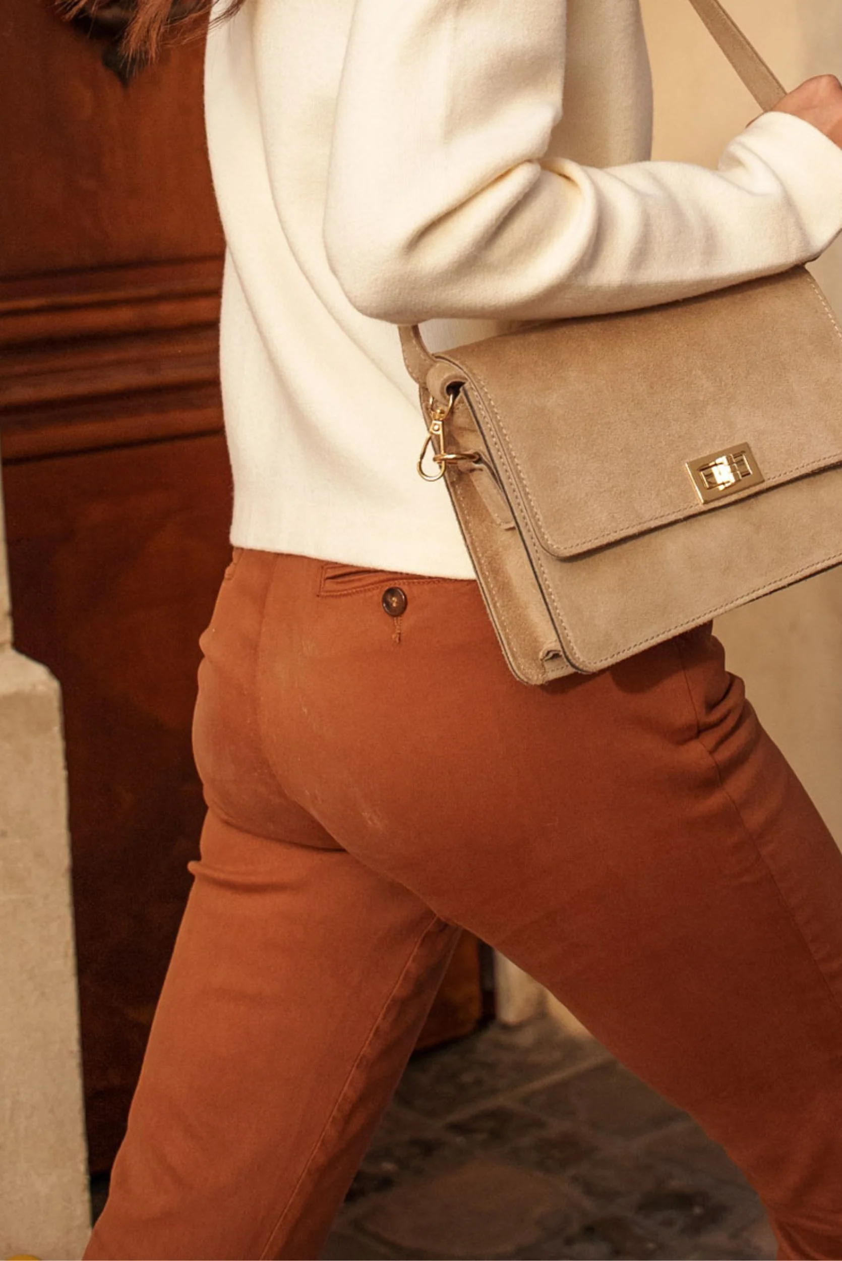 De couleur camel, notre fameux pantalon Carmen est tout simplement l’élément indispensable à avoir dans sa garde-robe. Il ajoute une touche de pep’s et de couleur à votre tenue, convenant parfaitement à chaque événement de votre vie.