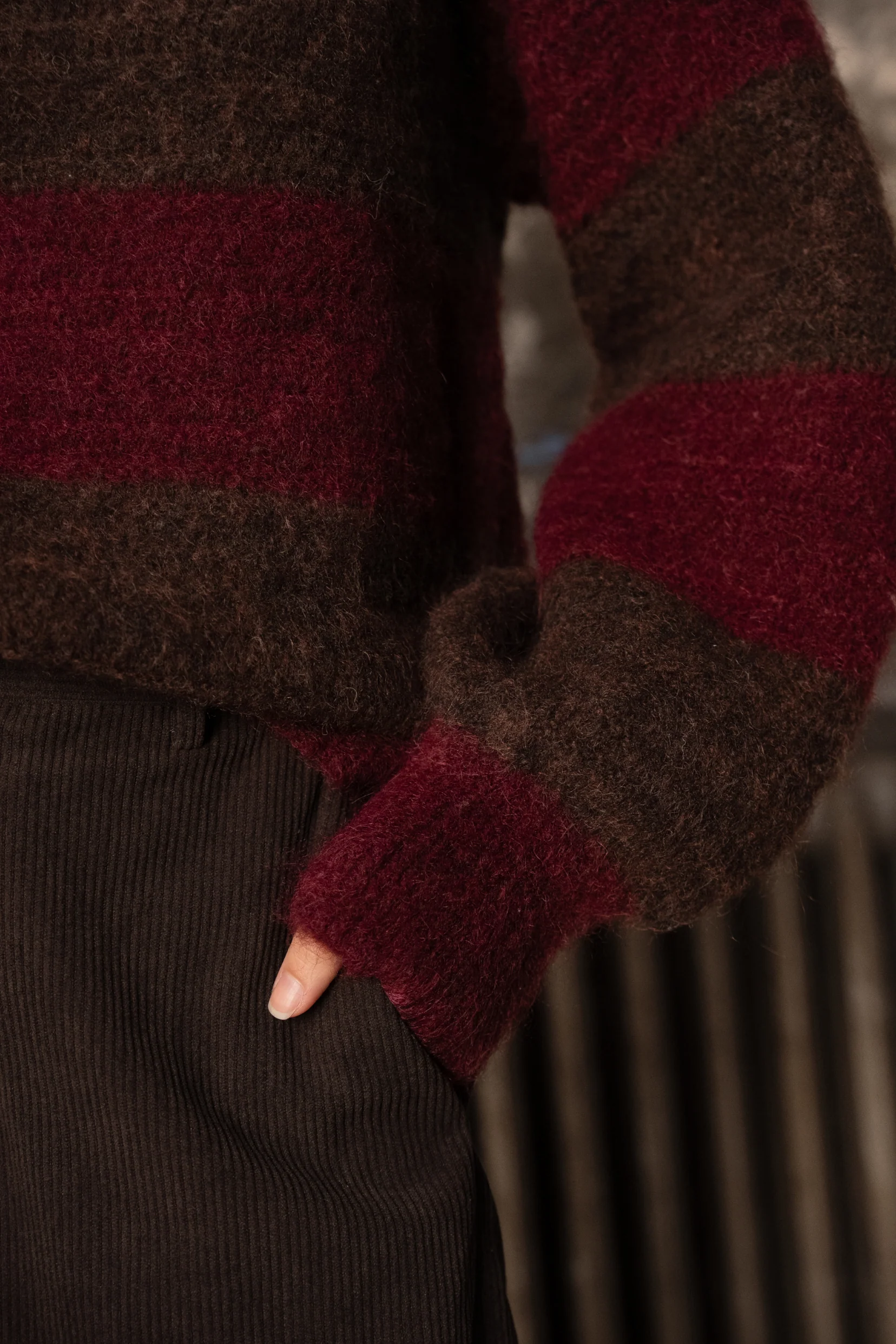 Emyrra en fait partie. Avec son velours côtelé profond et son brun chocolat intense, elle réchauffe la silhouette tout en dessinant une allure naturellement élégante.