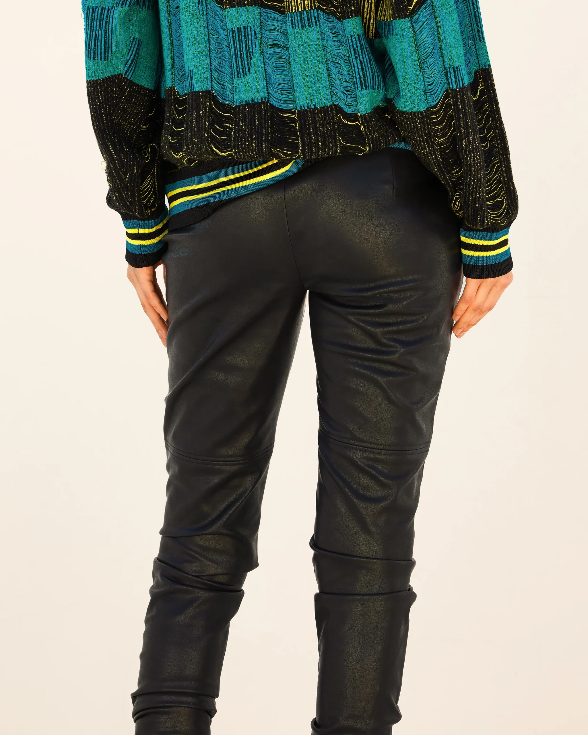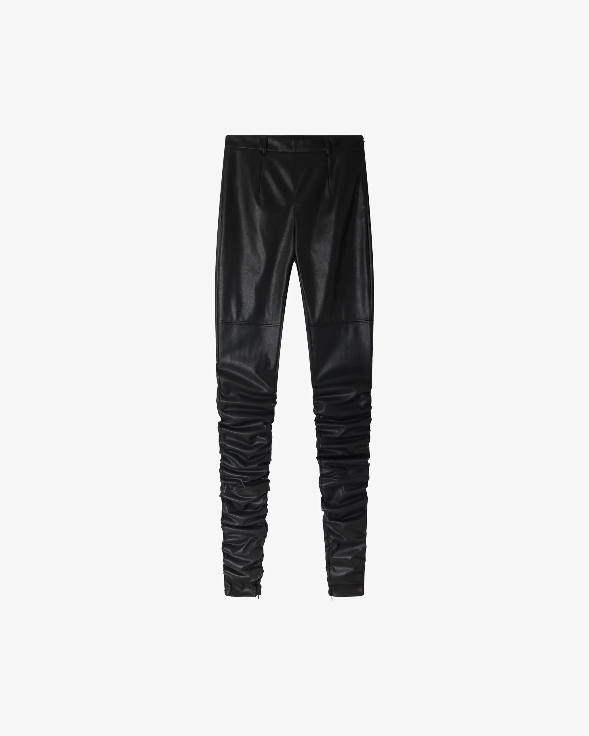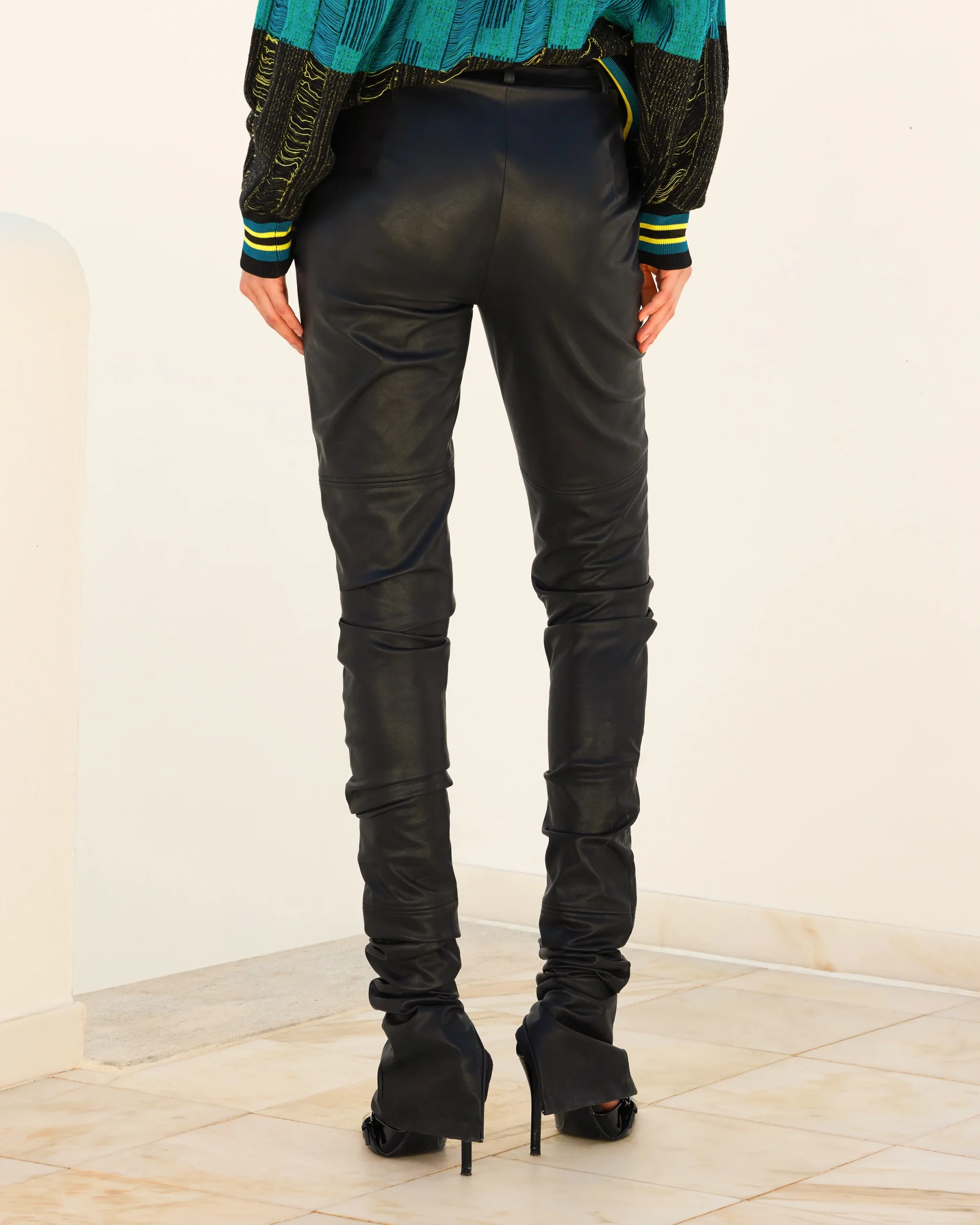 Legging ultra long près du corps en simili cuir stretch noir, pensé comme une seconde peau. Sa longueur volontairement excessive crée un plissé élégant en bas de jambe, pour un effet allongé et stylisé. Une fente intérieure zippée permet d’ouvrir le bas du modèle pour entourer la chaussure. Taille élastique pour un confort optimal. Une pièce audacieuse et contemporaine, à mixer avec des volumes oversize ou des pièces plus habillées.
