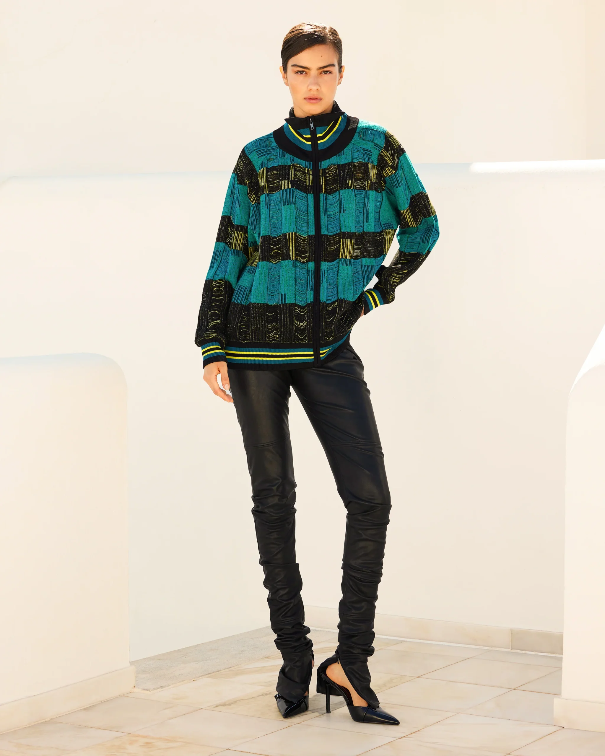 Legging ultra long près du corps en simili cuir stretch noir, pensé comme une seconde peau. Sa longueur volontairement excessive crée un plissé élégant en bas de jambe, pour un effet allongé et stylisé. Une fente intérieure zippée permet d’ouvrir le bas du modèle pour entourer la chaussure. Taille élastique pour un confort optimal. Une […]