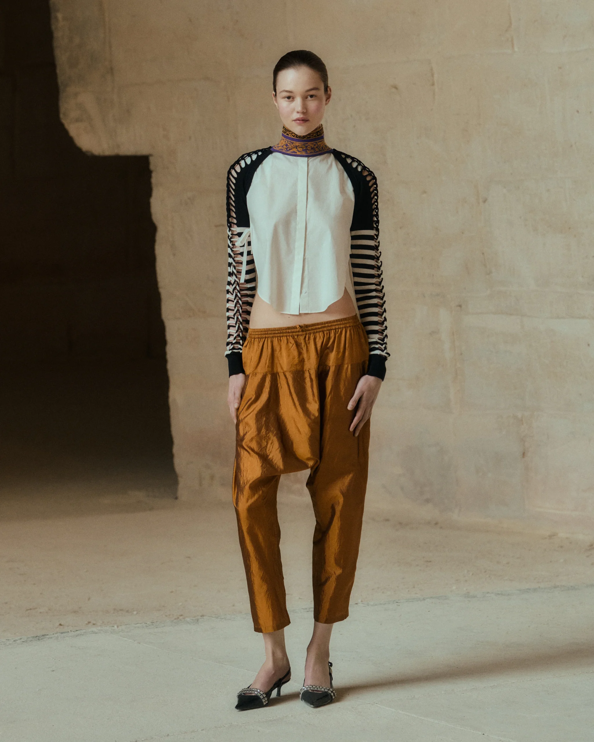 Notre pantalon incarne l’élégance et la singularité avec son tissu en soie habotai aux couleurs changeantes, oscillant entre le jaune et l’aubergine. Sa simplicité de forme en fait un vêtement remarquable. Inspiré du saroual, il présente un fond qui tombe légèrement, créant ainsi une silhouette fluide et gracieuse. La taille élastiquée assure un confort optimal et permet de le porter souplement sur les hanches. De plus, les poches ajoutent une touche pratique à ce modèle sophistiqué.