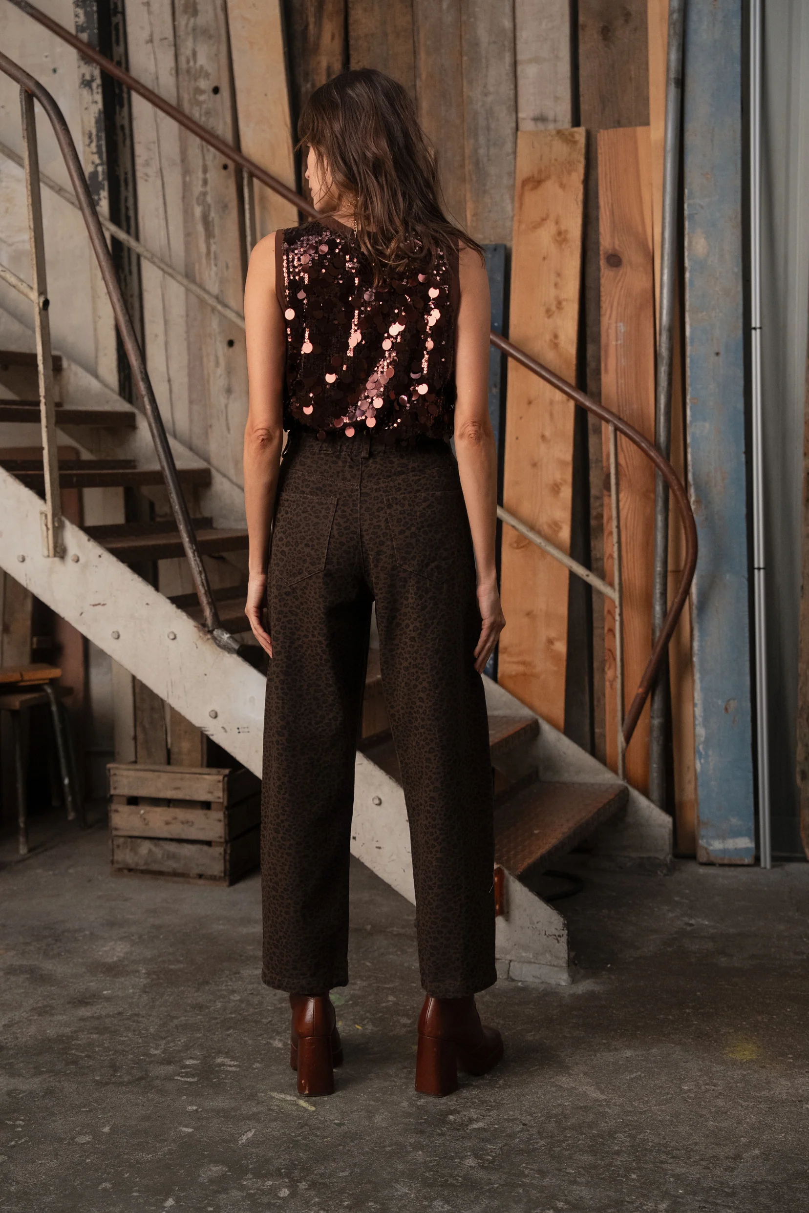 Sa coupe large et son imprimé léopard chocolat insufflent une touche de caractère à chaque silhouette. Taille haute et jambe fluide, il allonge la ligne tout en offrant un tombé naturel et confortable.