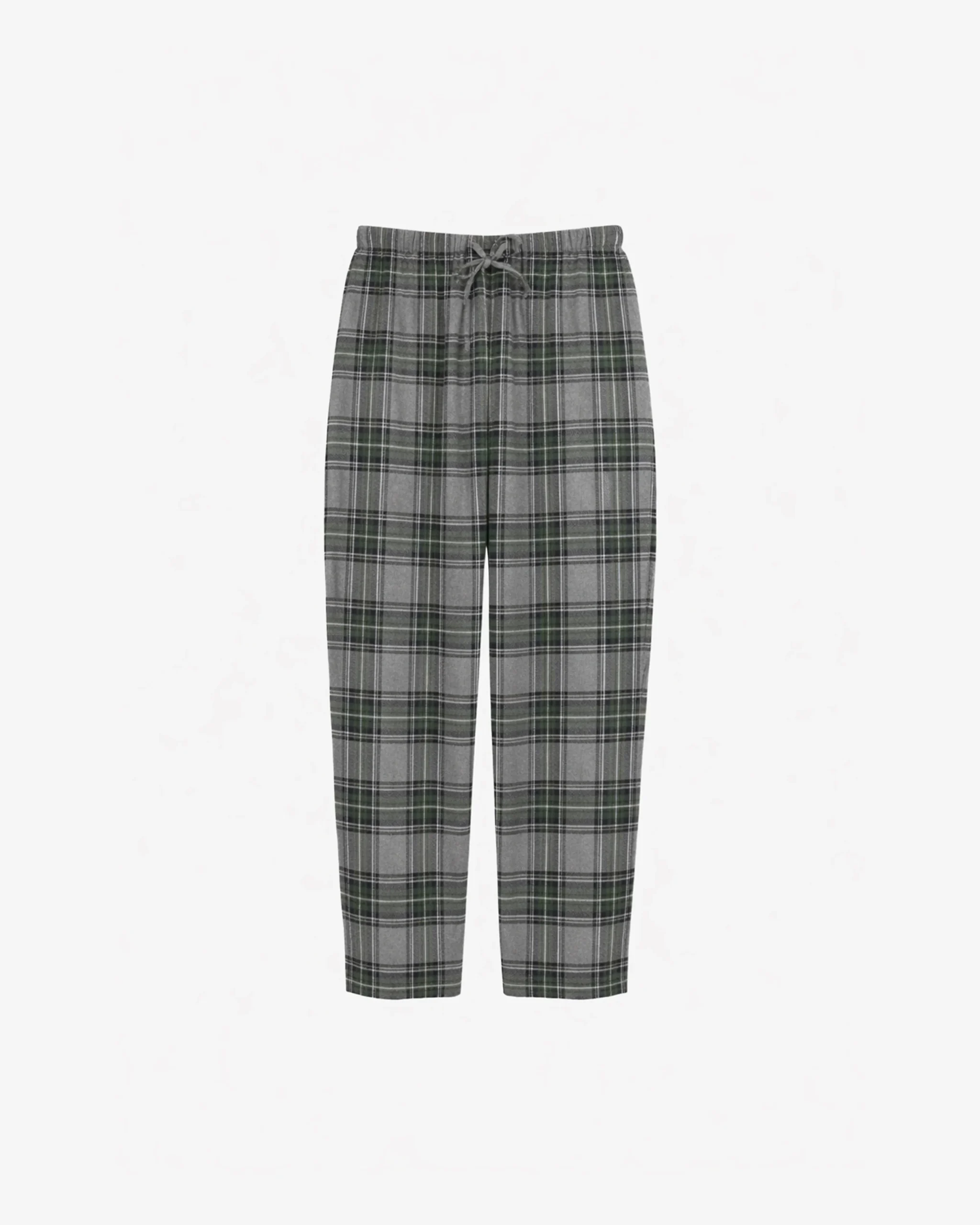Ce pantalon se distingue par son motif à carreaux classique dans des tons de gris et de vert forêt, rehaussé de fines rayures scintillantes qui apportent une note de lumière discrète. Sa silhouette décontractée privilégie le confort avec une taille haute entièrement élastiquée munie d’un cordon de serrage assorti pour un ajustement personnalisé.