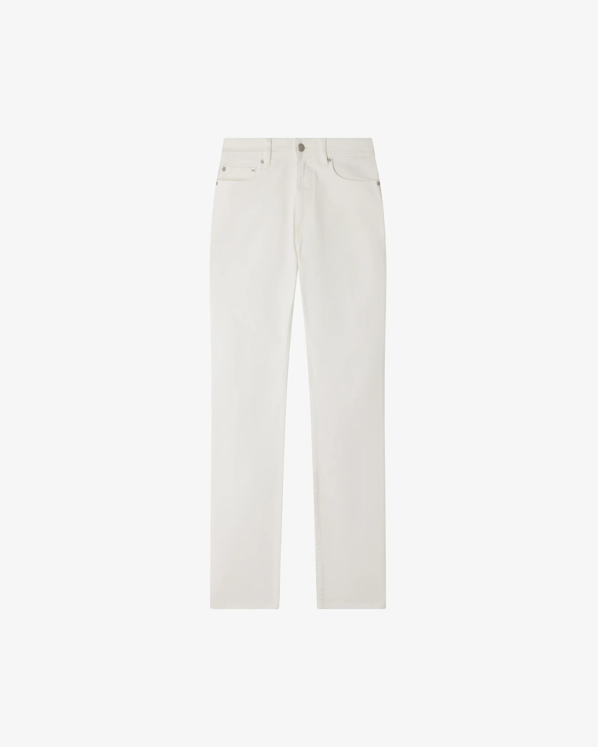 Jean long à la coupe droite, réalisé dans une toile de denim blanc éclatant. Structure 5 poches classique revisitée avec des fentes discrètes à l’intérieur des jambes, pour un tombé élégant autour de la chaussure. Un modèle épuré et lumineux, parfait avec des souliers pointus pour un look graphique et affirmé.