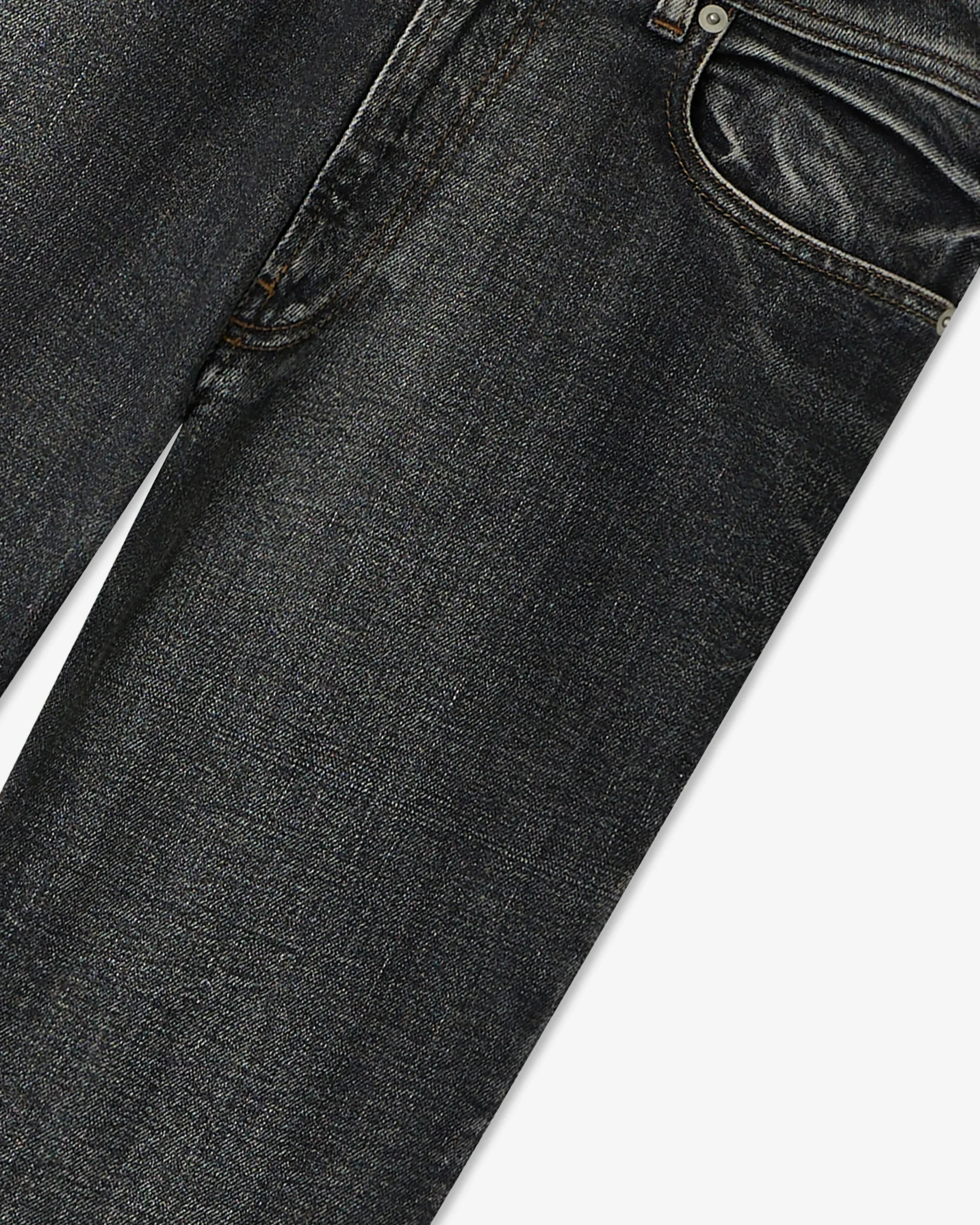 Jean long à la coupe droite, inspiré du denim 5 poches classique. Confectionné dans une toile noire délavée, il présente une allure subtilement usée. Détail signature : des fentes discrètes à l’intérieur des jambes, pensées pour épouser la chaussure et créer un tombé net. Idéal porté avec des souliers pointus pour une silhouette affirmée.