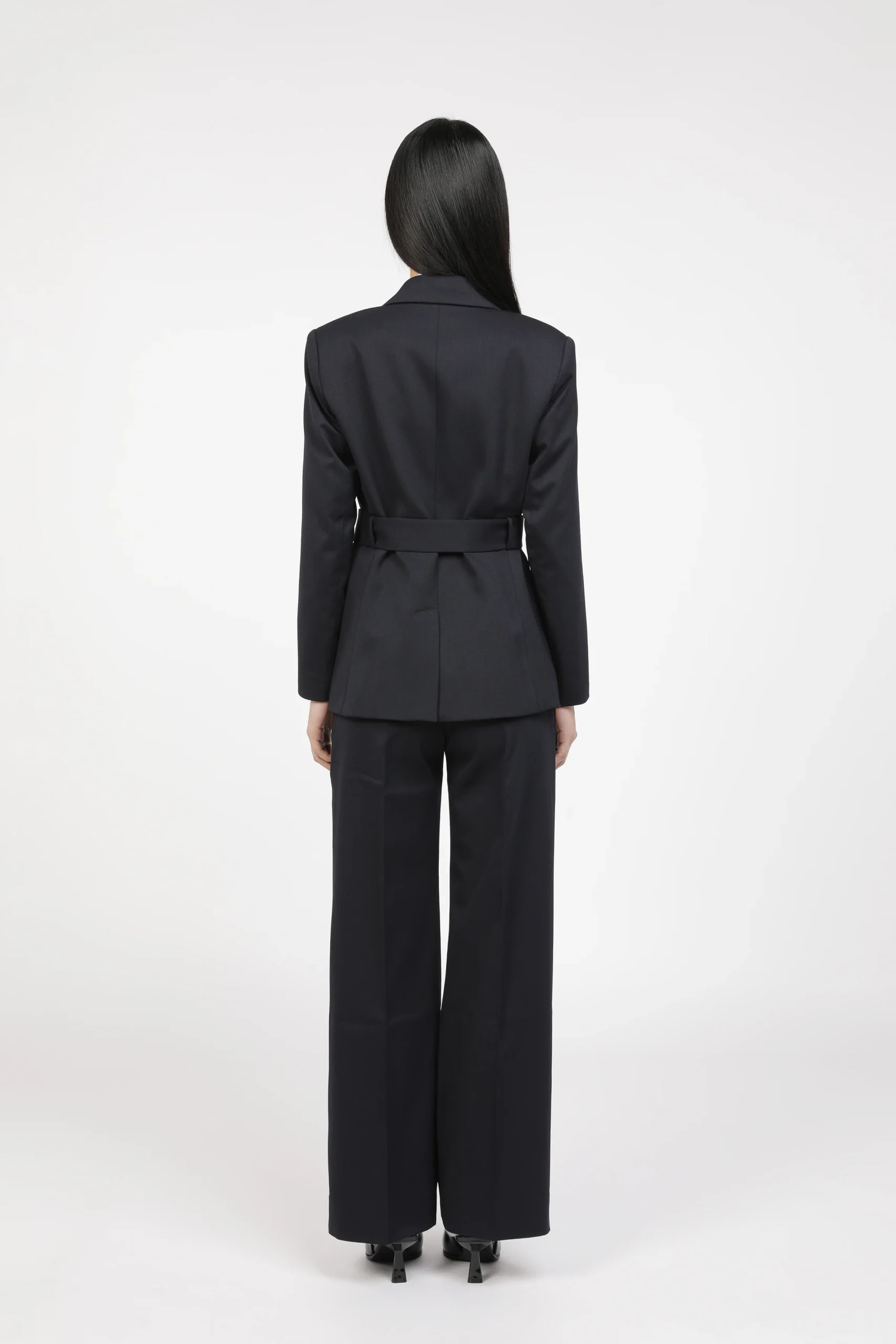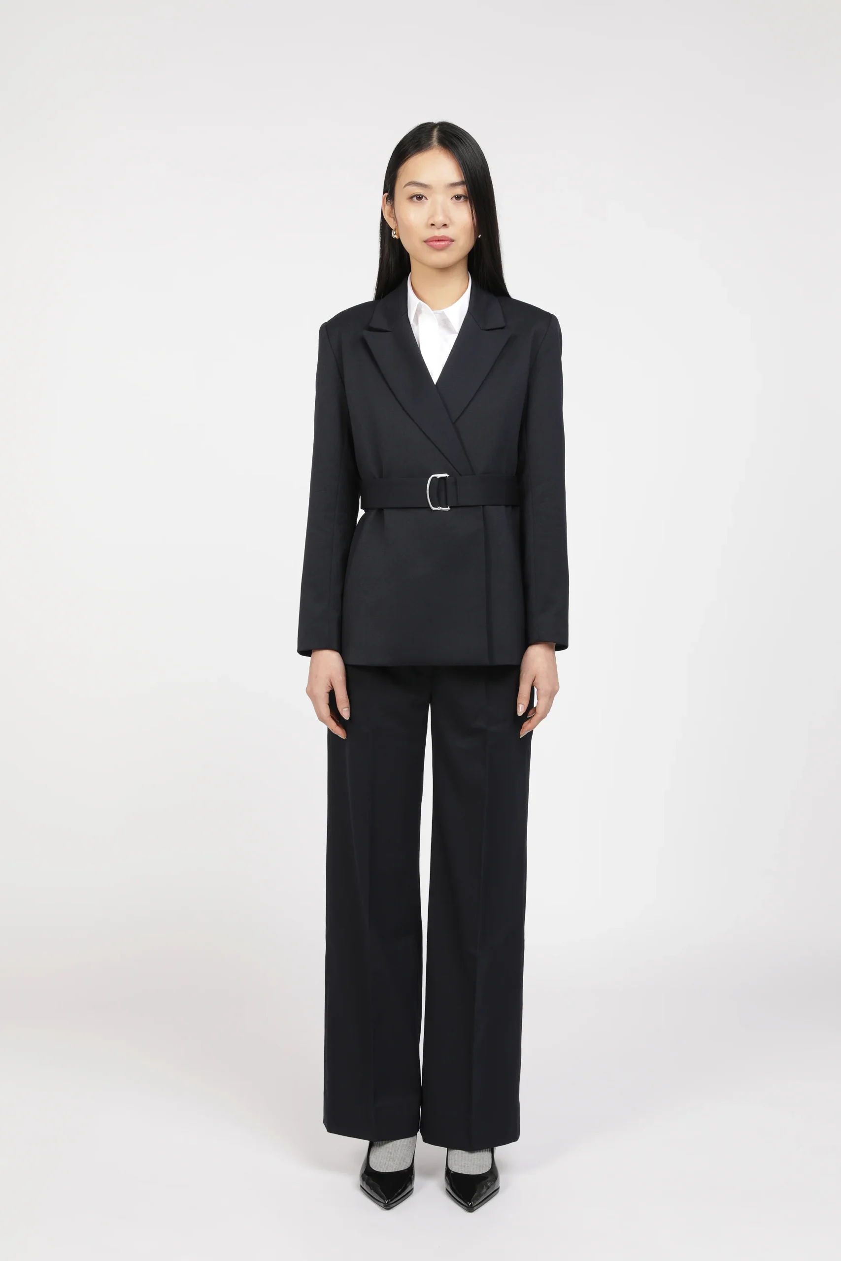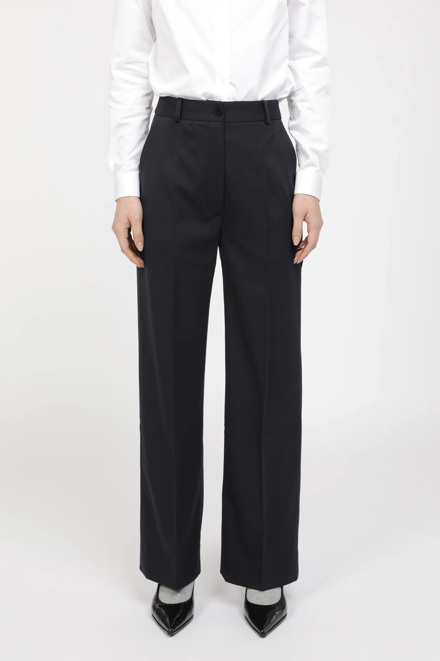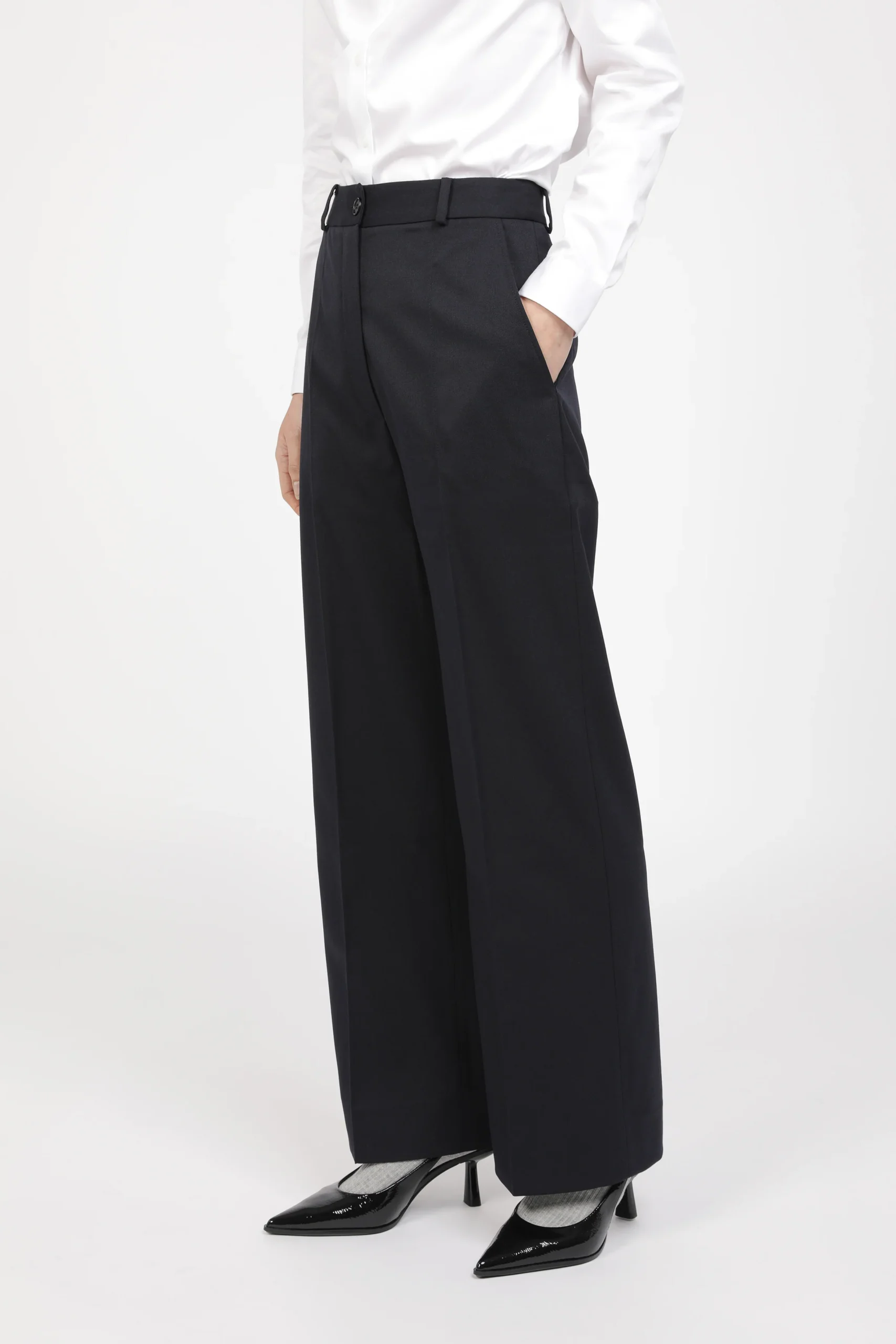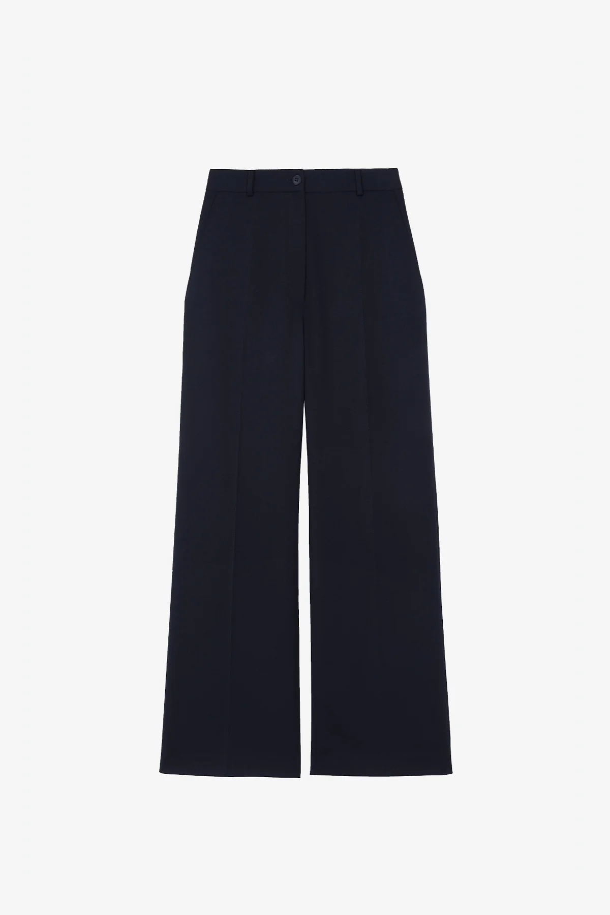 Pantalon coupe large féminine. Taille haute élégante. Poches obliques sur le devant. Une poche passepoilée au dos.