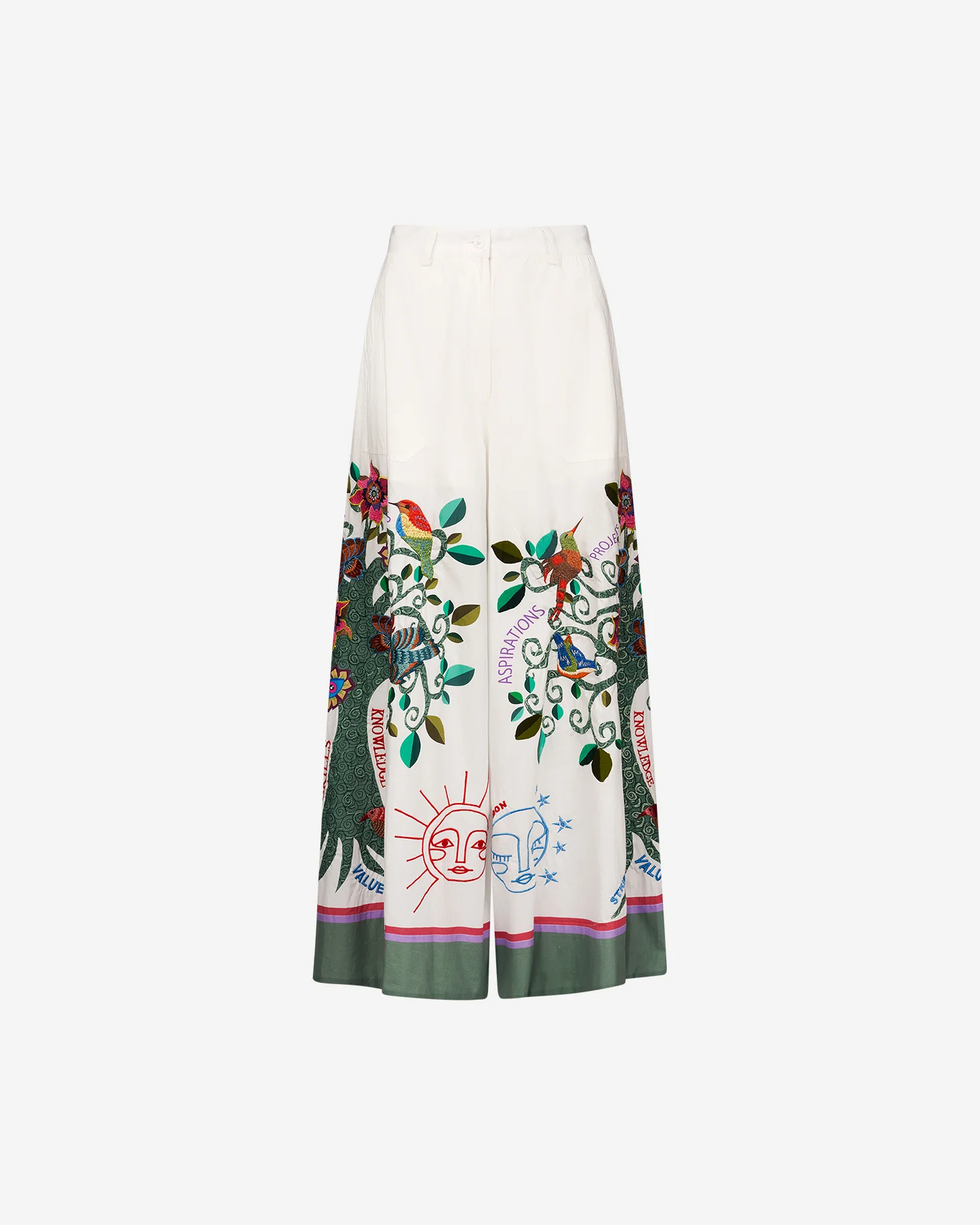 Elégance et allure, pour une dégaine de haut vol portez notre long pantalon en popeline de coton blanc. La coupe souple et large est parsemée de délicates broderies représentant un arbre de vie judicieusement placé de part et d’autre du modèle. Des poches latérales, une fermeture sur le devant ainsi qu’une doublure façon short optimise le pantalon.