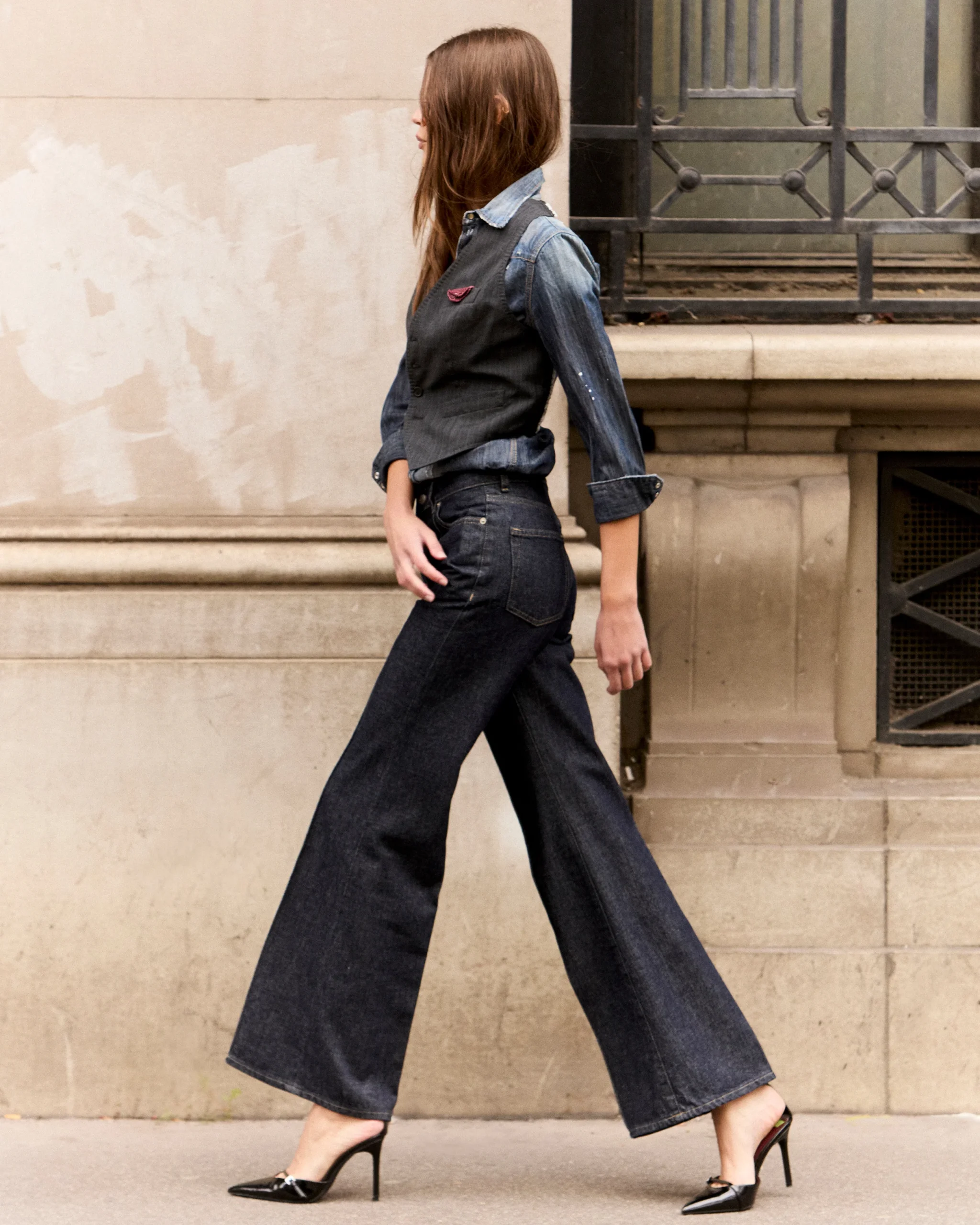 Pantalon en toile de jeans indigo foncé, au look sobre et épuré. Coupe droite avec un bas légèrement évasé pour allonger la silhouette. Détail signature : une surpiqûre apparente court le long de la jambe sur le devant, apportant une touche graphique discrète. Finition 5 poches classique. Un essentiel du vestiaire, facile à associer au quotidien.