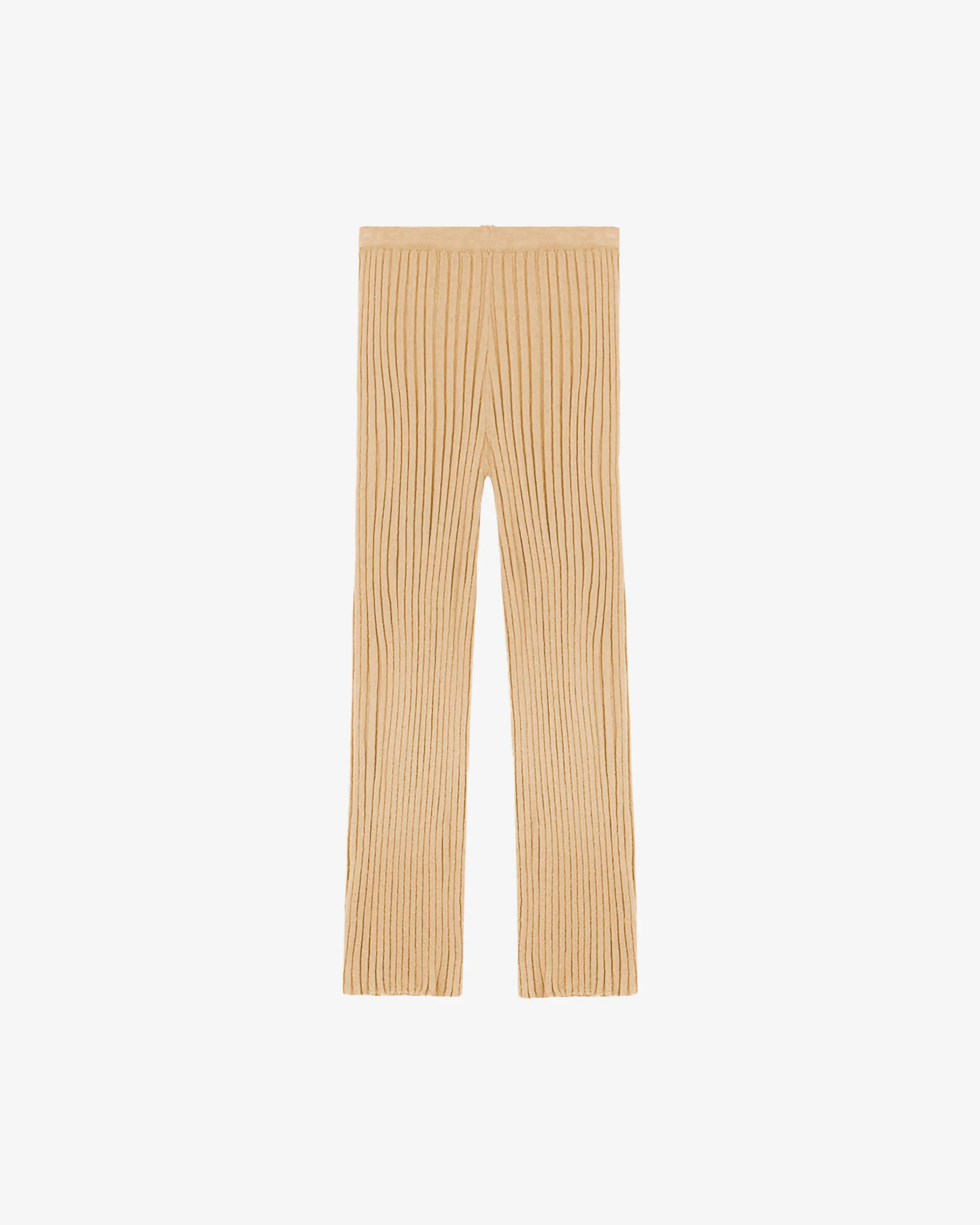Ce pantalon est d’une couleur camel neutre et se caractérise par une maille côtelée très visible sur toute la longueur de la jambe, lui conférant une texture et une élasticité distinctives. Il présente une coupe droite et ajustée ou légèrement évasée vers le bas, typique d’un pantalon tricoté confortable. Sa matière en maille et sa couleur douce le destinent à être un vêtement confortable de type loungewear ou décontracté, idéal pour l’automne et l’hiver.
