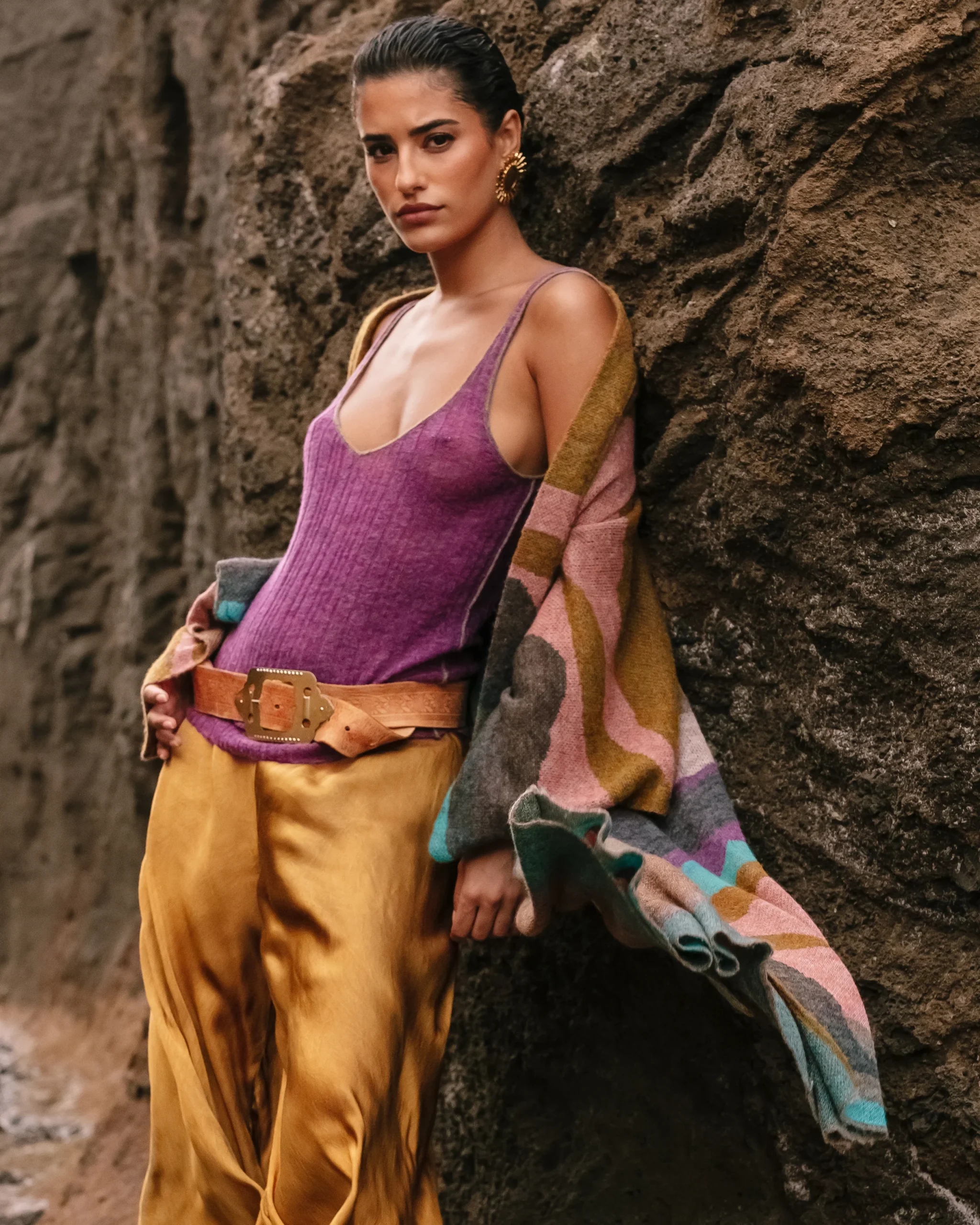 Ce pantalon se distingue par une couleur ocre, accentuée par un fini satiné et froissé qui réfléchit la lumière. Il présente une coupe palazzo très large et fluide, créant un drapé ample et élégant le long des jambes. La taille est élastiquée (ou froncée) pour assurer le confort et une ligne douce au niveau des […]
