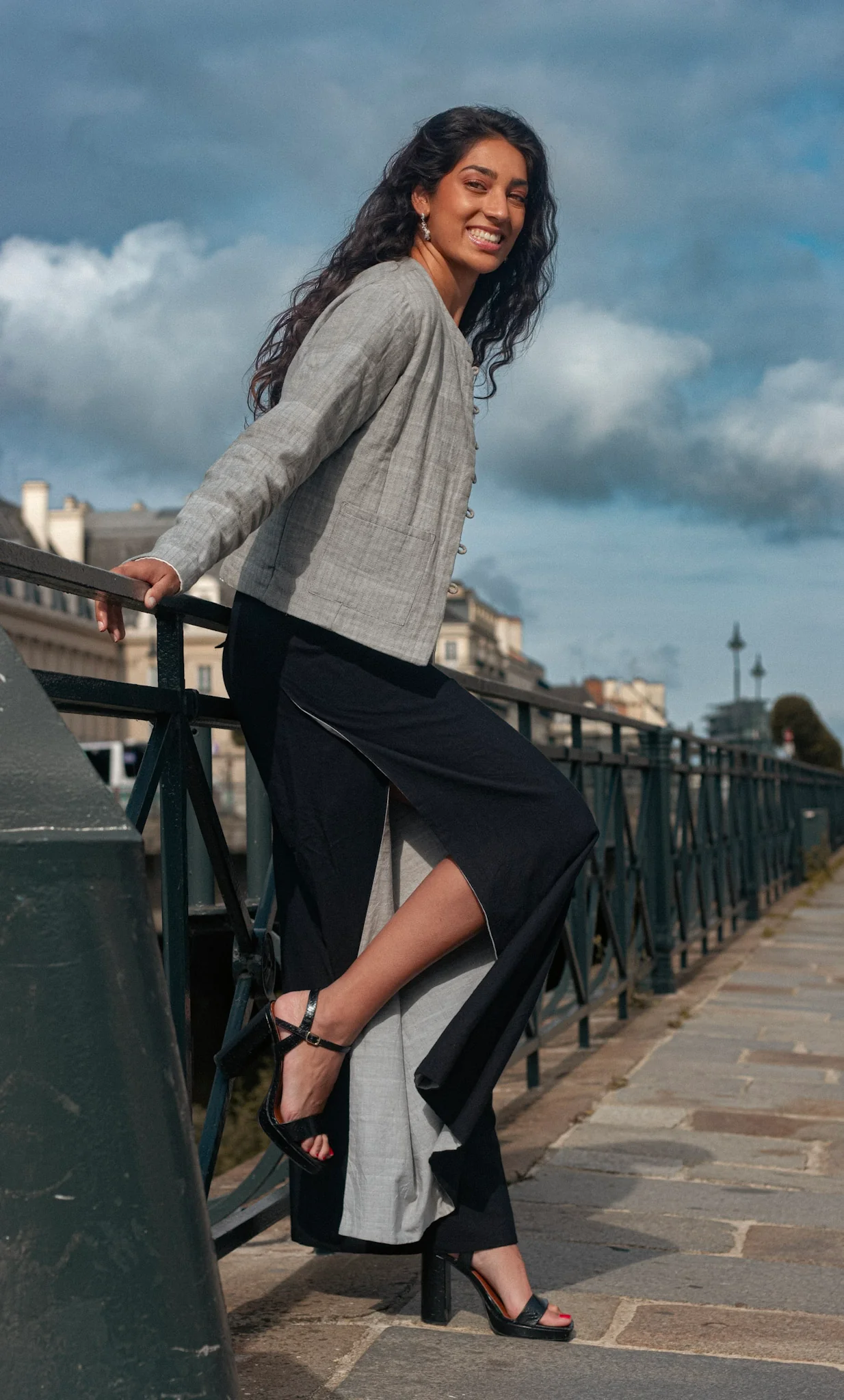Le pantalon Jeannette est conçu pour répondre aux besoins de toutes les morphologies grâce à son système de nouage inspiré du pantalon thaï traditionnel. Il se porte de manière ajustée autour de la taille et s’enroule élégamment autour des hanches, offrant un mouvement fluide avec des fentes sur les côtés. Ce pantalon est disponible en trois longueurs : long (112 cm), regular (107 cm), et petite (102 cm), garantissant un ajustement optimal pour chaque femme. Polyvalent, il se marie aussi bien avec un look décontracté que sophistiqué, tout en assurant un confort quotidien. La fluidité du tissu et la coupe travaillée s’adaptent facilement à toutes les silhouettes, faisant du pantalon Jeannette un incontournable de la garde-robe.