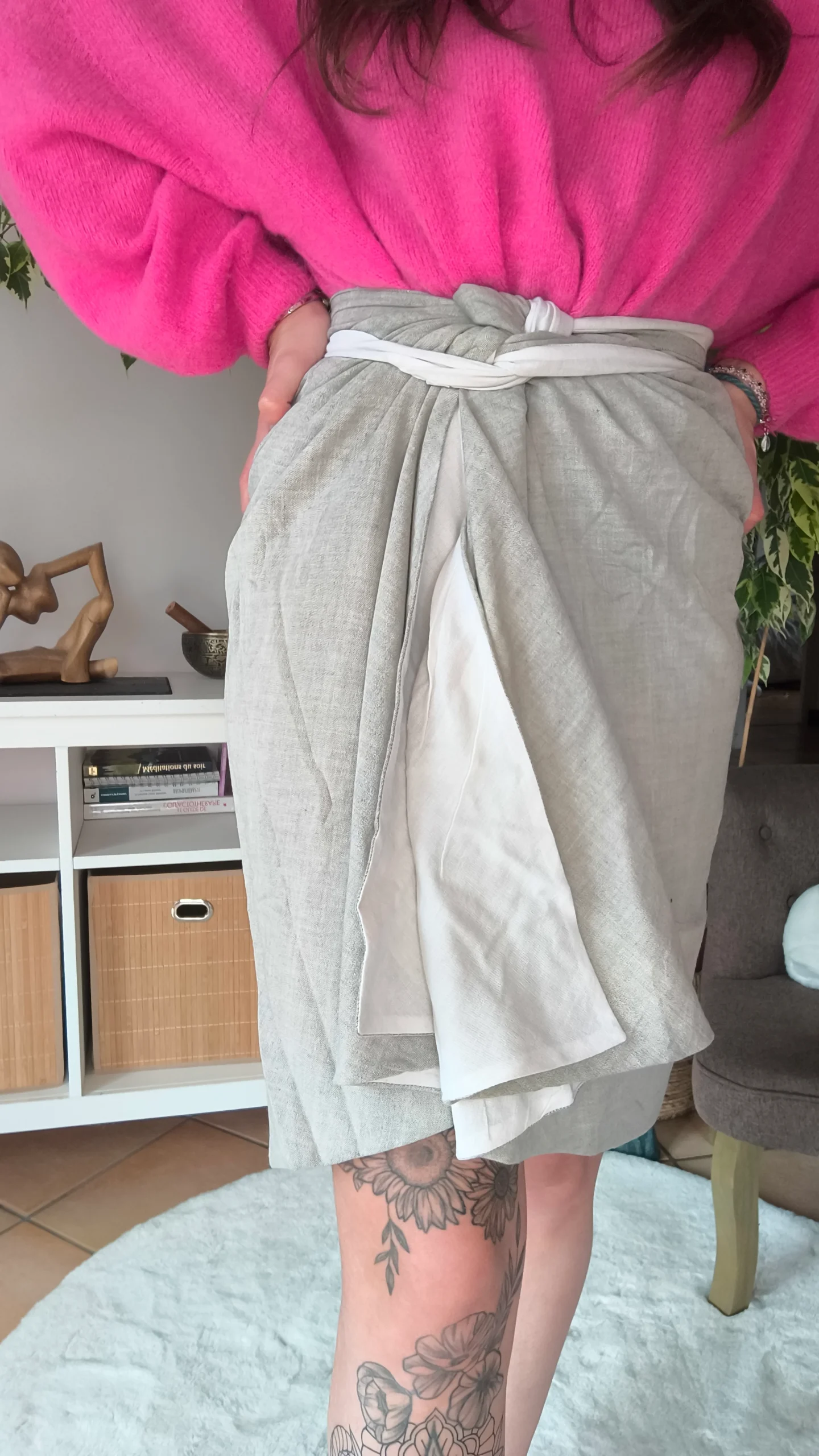 - En jupe enroulée : Portez-la de manière classique en l’enroulant autour de votre taille pour une allure élégante et féminine.