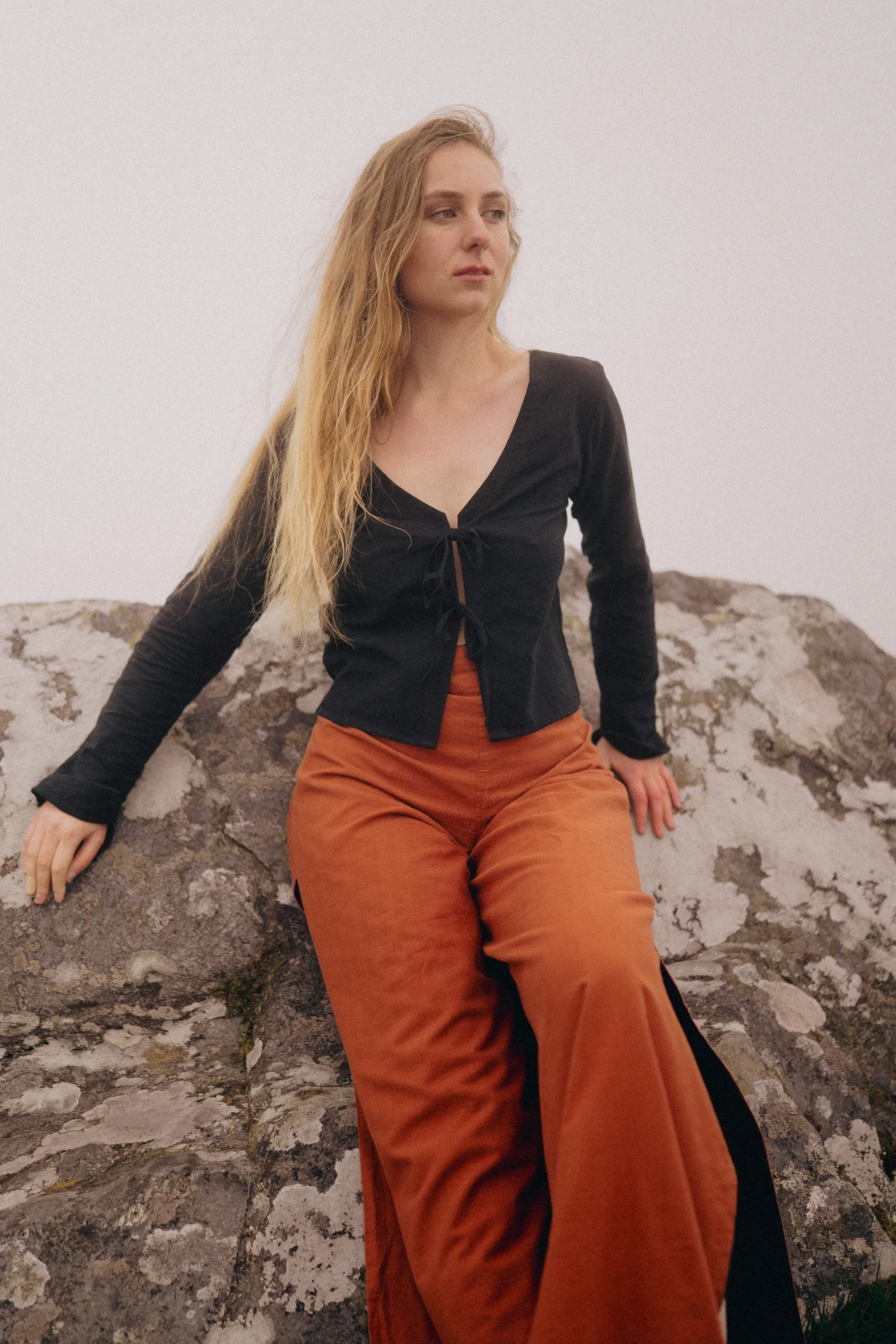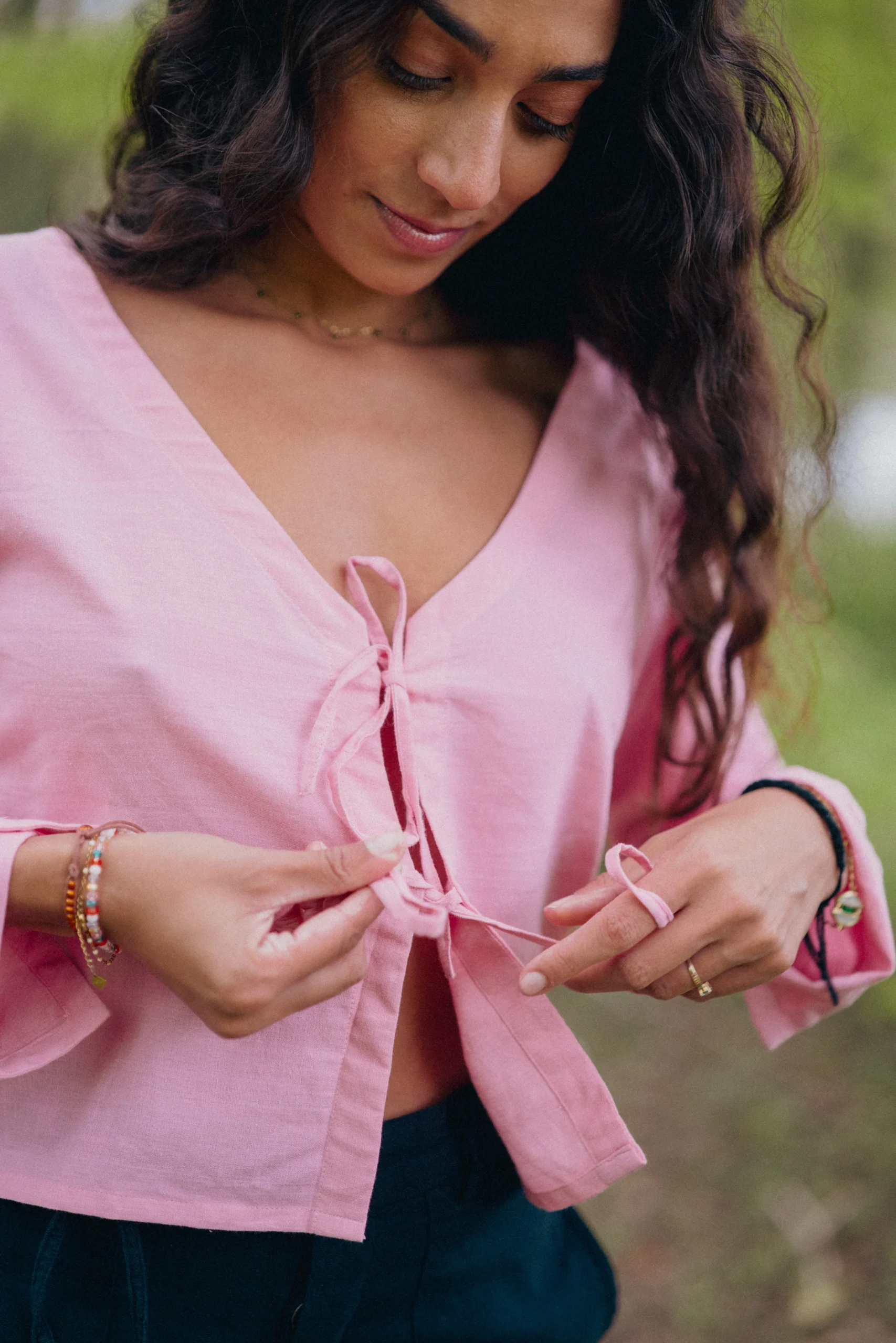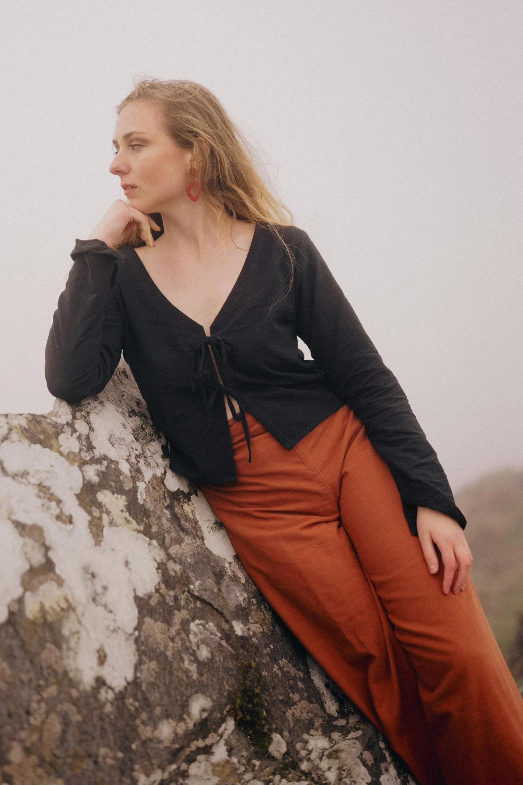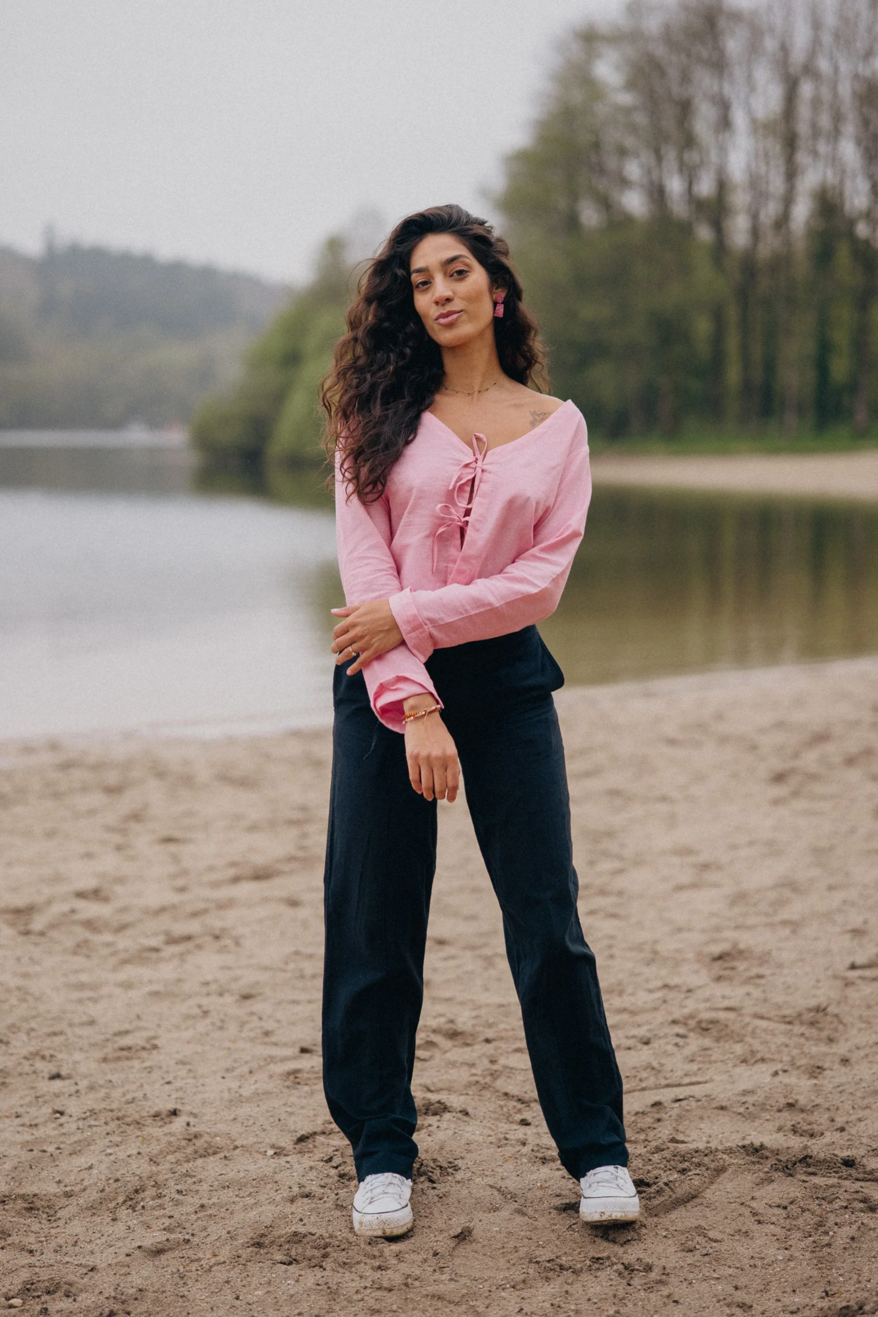 La blouse Jessica séduit par son encolure en V et ses deux liens à nouer sur le devant. Sa coupe droite légèrement courte souligne la taille sans la contraindre, tandis que ses manches longues légèrement évasées lui donnent un charme poétique.