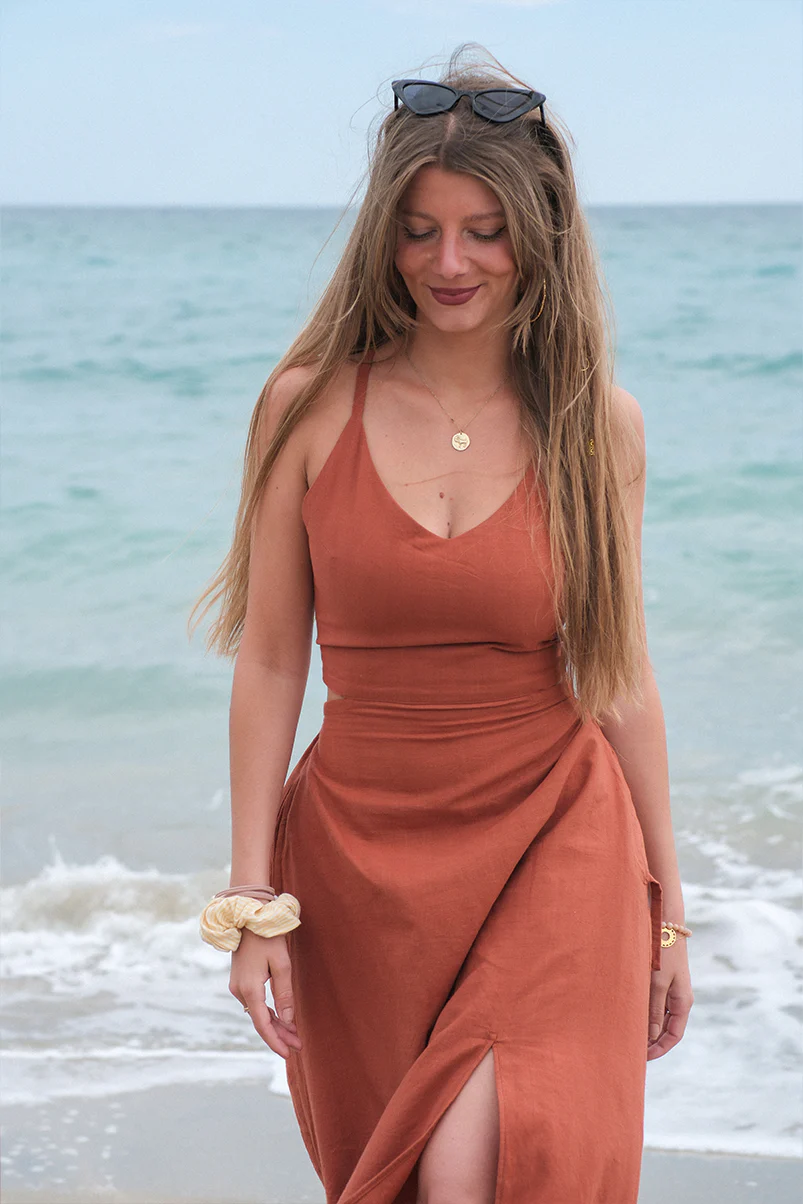 Son haut à bretelles fines présente un laçage croisé dans le dos, permettant un ajustement personnalisé et un maintien parfait. La jupe, fluide et longue, est dotée de poches discrètes et d’un lien de serrage intégré à la taille pour une coupe ajustable sans élastique. Ce détail de fabrication assure un tombé flatteur tout en conservant un maximum de confort.