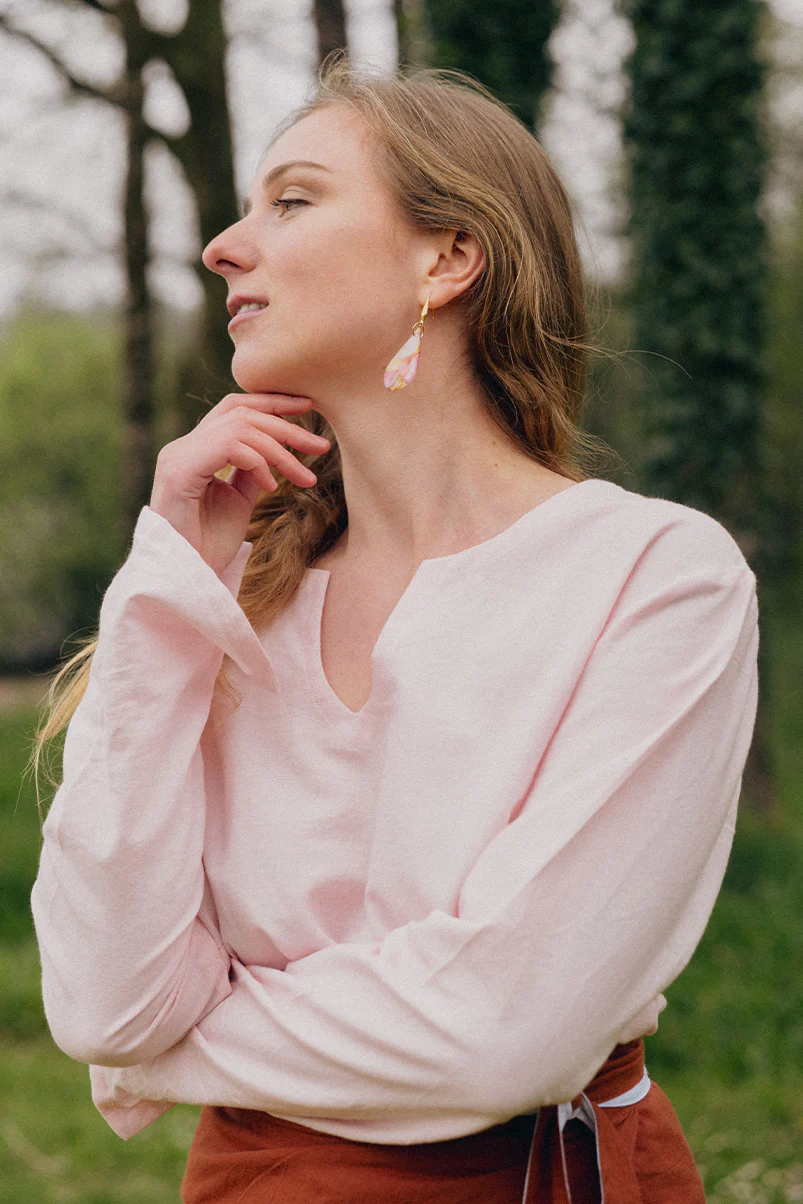 Parfaite pour les matins de printemps comme pour les soirées d’été, elle se glisse aussi bien dans un pantalon ample que nouée dans une jupe taille haute. Son encolure sobre met en valeur la nuque et les bijoux, et sa teinte rose poudré illumine le teint tout en douceur.