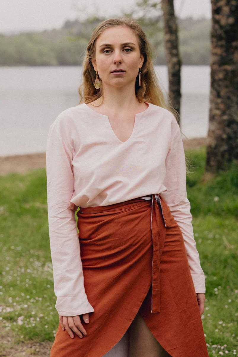 Inspirée du tee-shirt Stéphanie, la blouse Marine en reprend l’encolure légèrement fendue et la coupe fluide, tout en apportant la chaleur de manches longues. Elle est confectionnée en coton tissé artisanalement, un tissu respirant et naturellement texturé, au tombé léger.