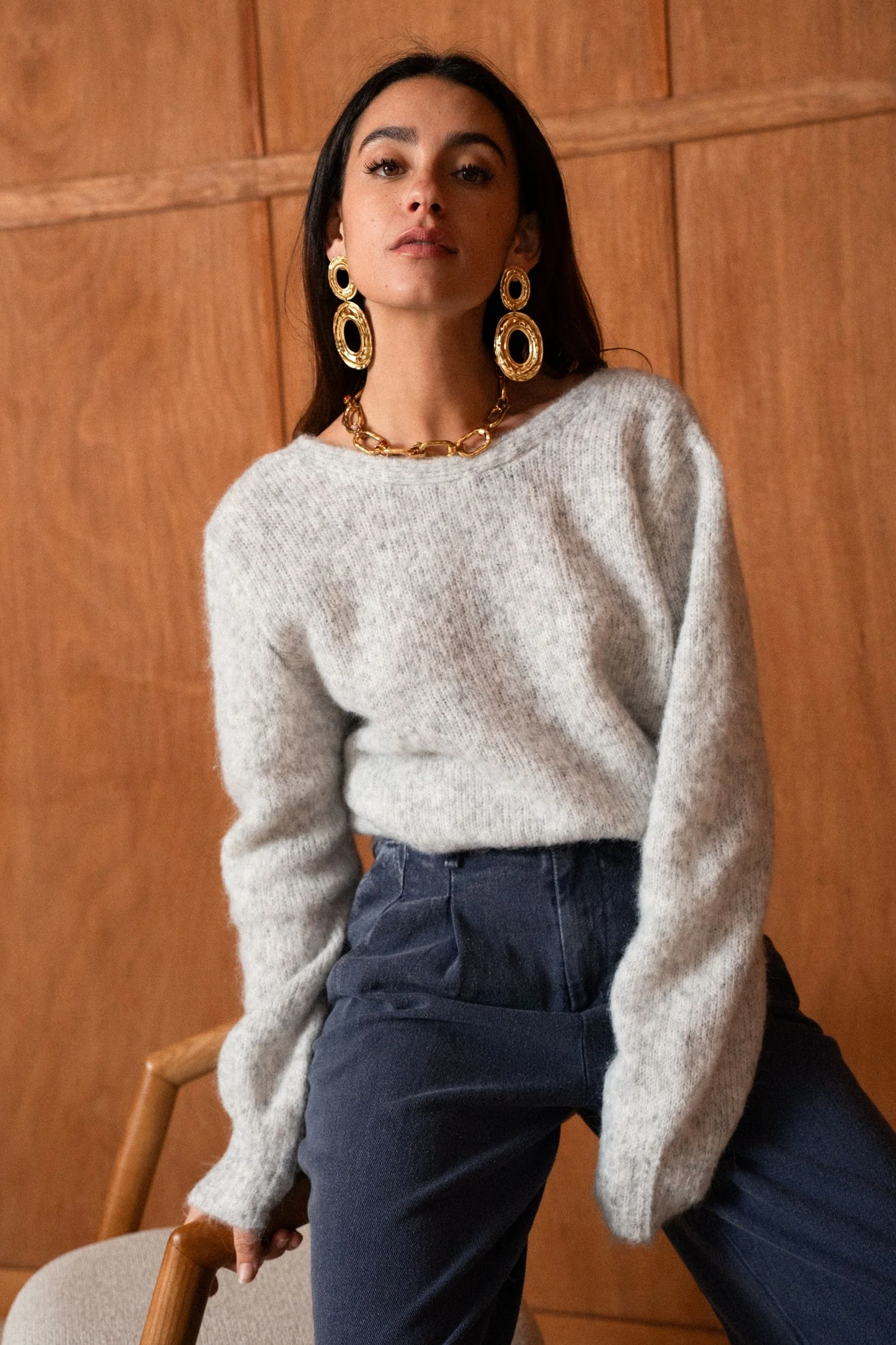 Aélis, c’est le pull qu’on enfile sans réfléchir et qu’on ne quitte plus. Sa maille moelleuse au toucher nuage enveloppe la silhouette avec légèreté, tandis que son gris clair lumineux s’accorde à tout, du denim brut au pantalon tailleur.