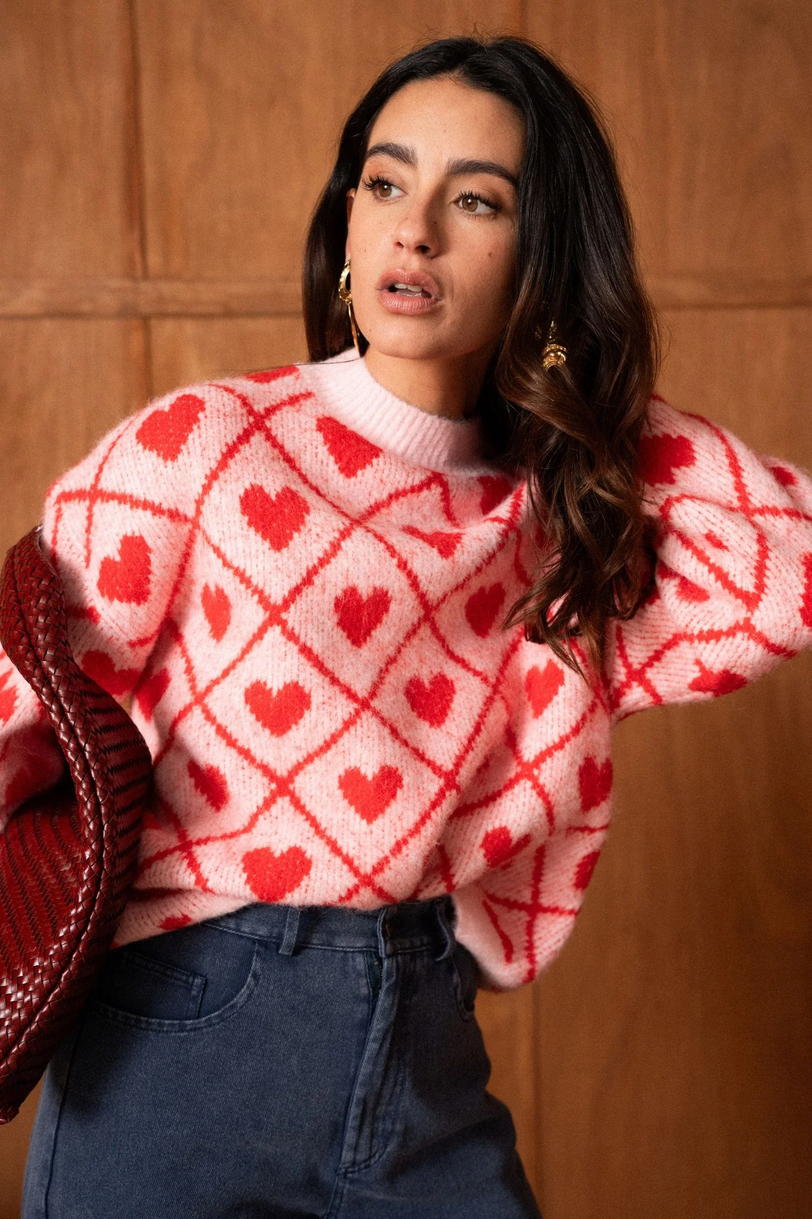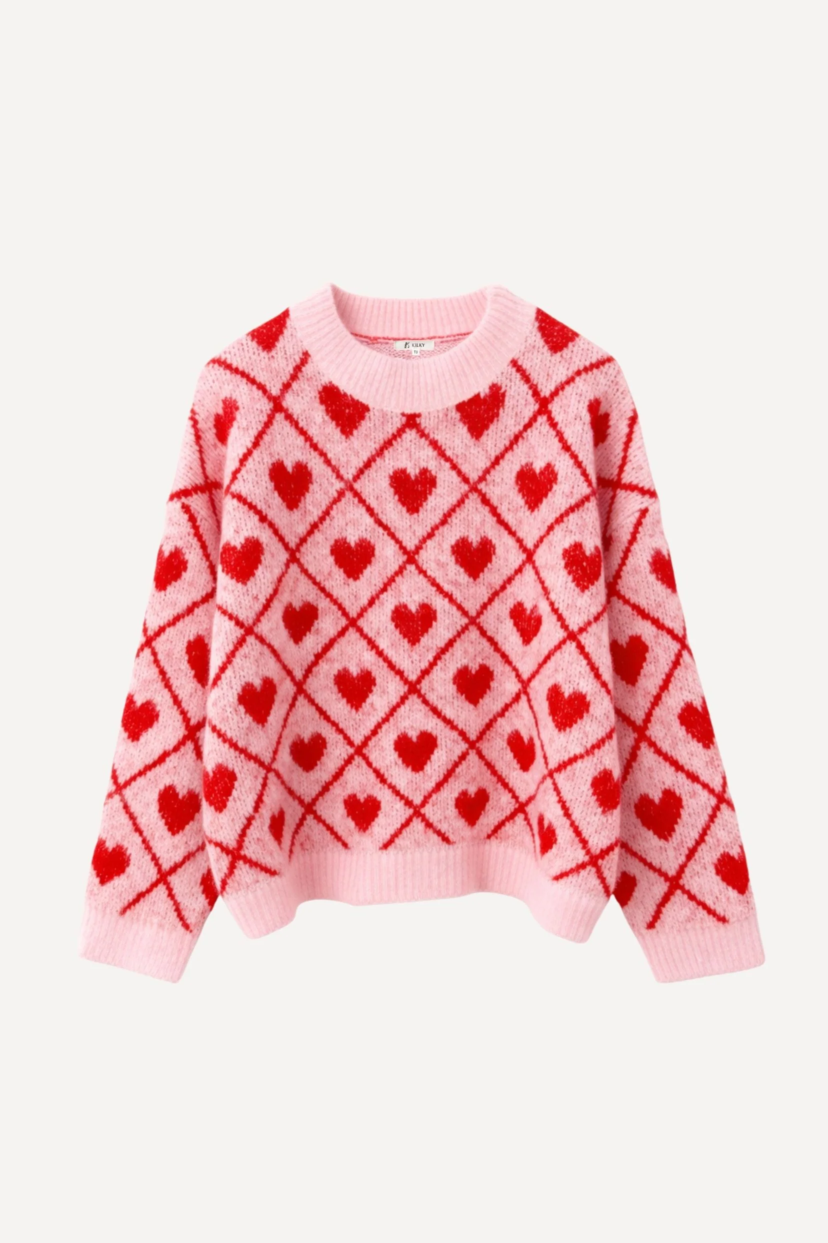 Un pull qui ose le motif cœur avec justesse, entre esprit rétro et allure assumée. Son rouge vibrant vient rythmer le rose de la maille et insuffle une énergie joyeuse au vestiaire. C’est la pièce coup de cœur, celle qui donne le ton dès qu’on l’enfile.