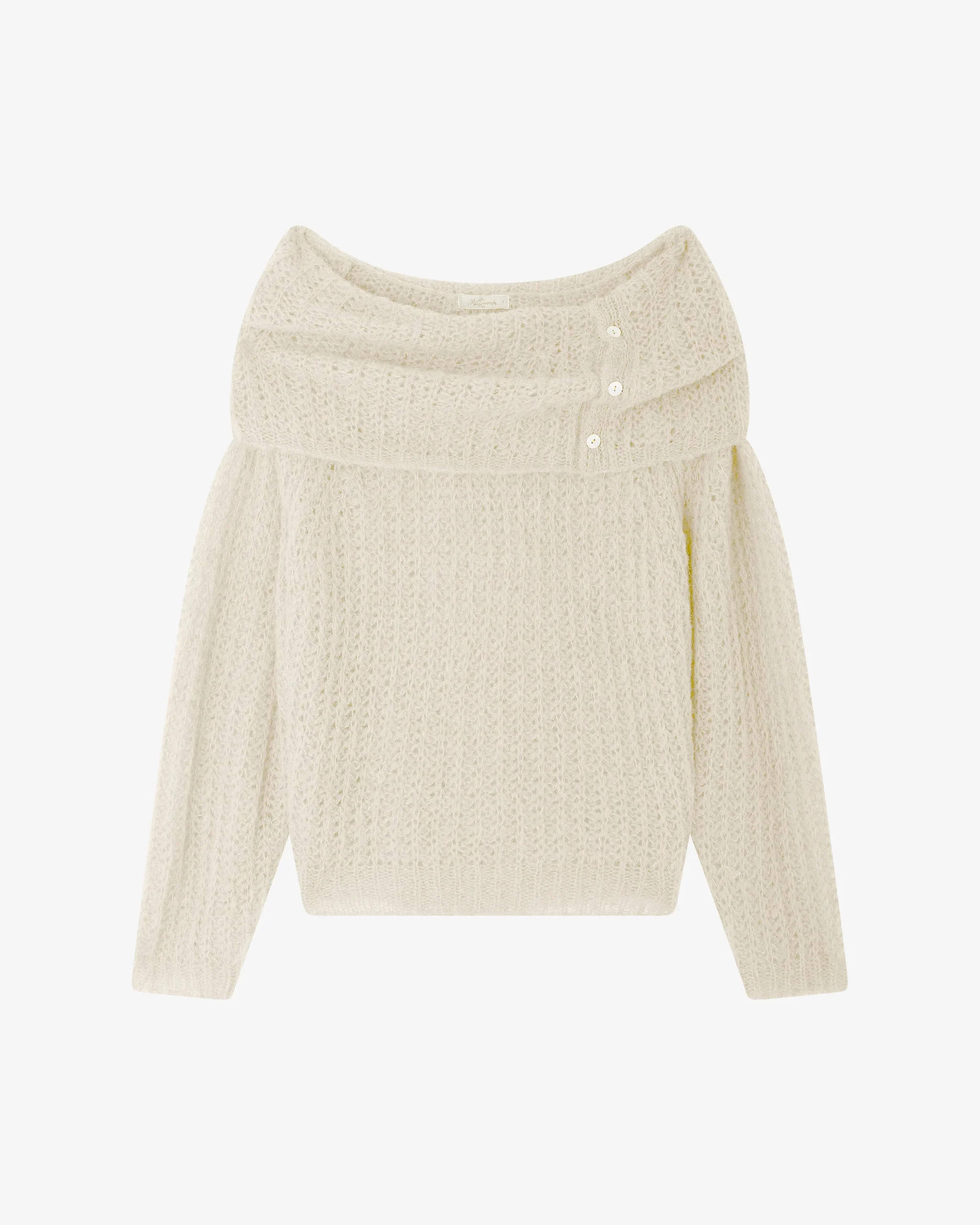 Un pull à l’allure décontractée et à la coupe ample, confectionné en alpaga brossé pour un confort inégalé. Son volume oversize et son encolure très souple accompagnée de boutons sur le col lui permettent d’être porté ouvert sur l’épaule et décontracté. La texture moelleuse, ajourée et la couleur ivoire offrent à cette pièce une douceur idéale pour l’hiver, tout en restant chic et moderne.