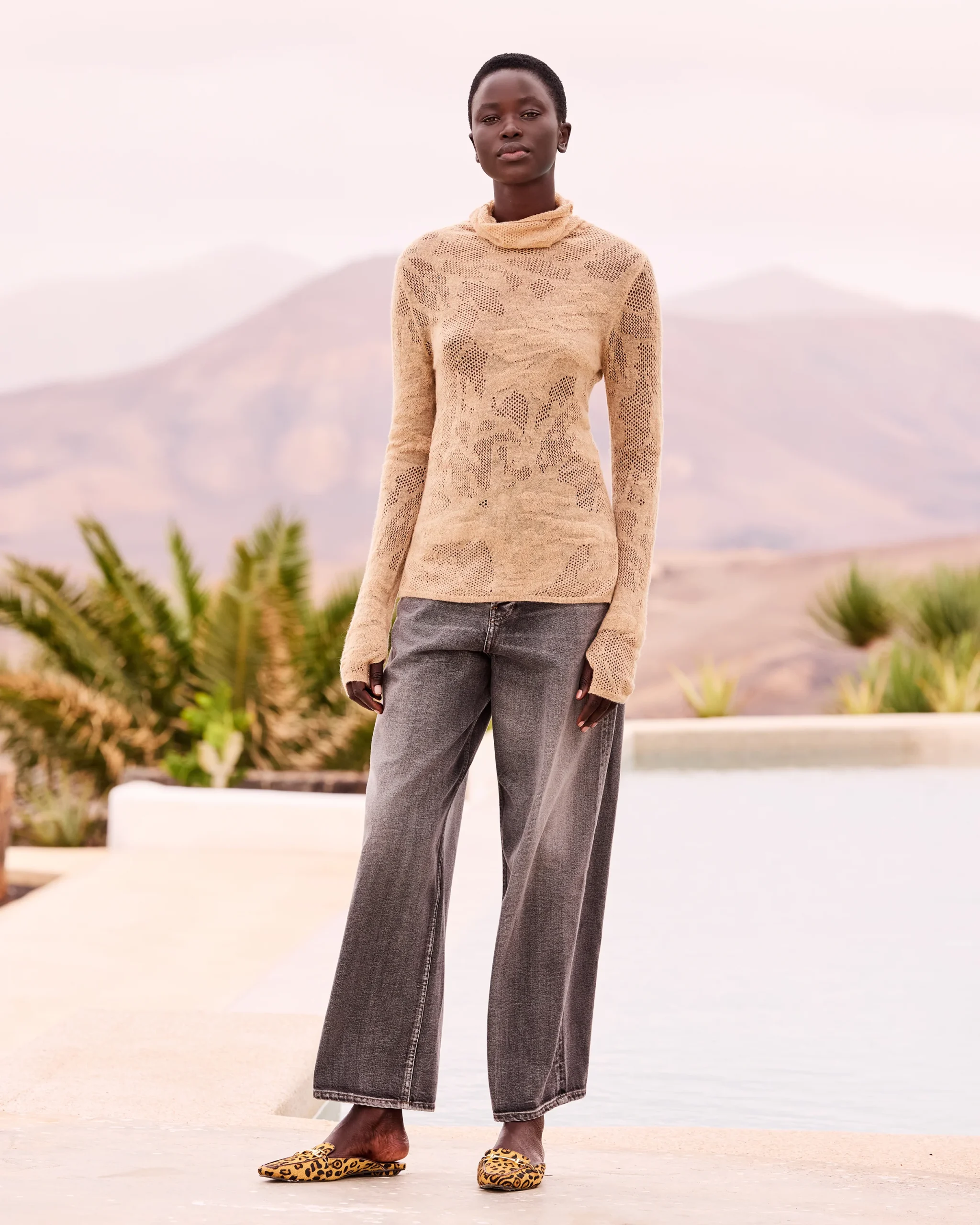 Tricoté dans une maille d’alpaca souple et aérée, ce pull beige se distingue par sa texture pointelle travaillée comme une dentelle, révélant un motif délicat de fleurs ajourées. Légèrement transparent, il allie légèreté et raffinement. Son col cheminée enveloppe le cou avec douceur, tandis que les fentes sur les côtés offrent une aisance fluide et […]