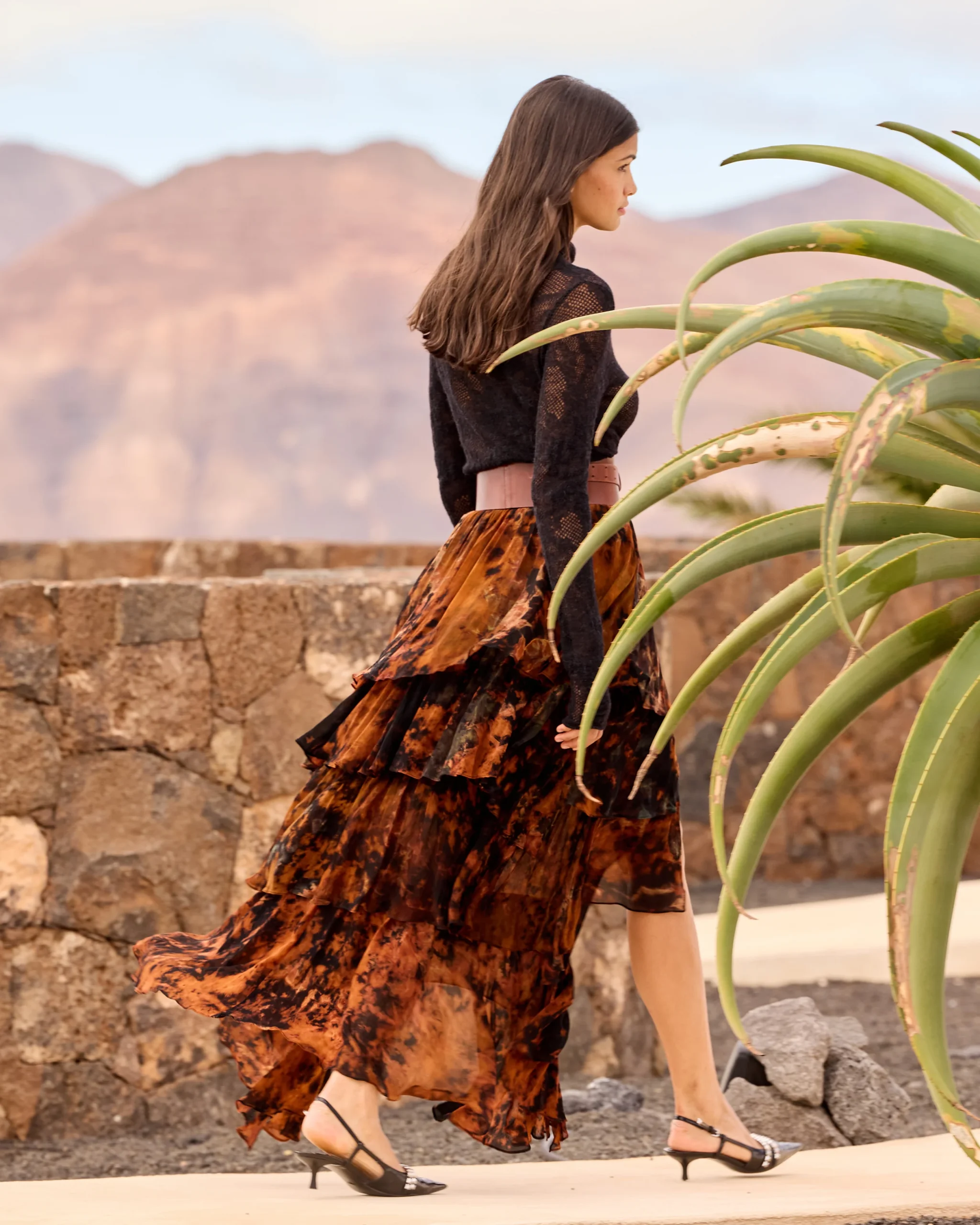 Tricoté dans une maille d’alpaca souple et aérée, ce pull noir se distingue par sa texture pointelle travaillée comme une dentelle, révélant un motif délicat de fleurs ajourées. Légèrement transparent, il allie légèreté et raffinement. Son col cheminée enveloppe le cou avec douceur, tandis que les fentes sur les côtés offrent une aisance fluide et […]