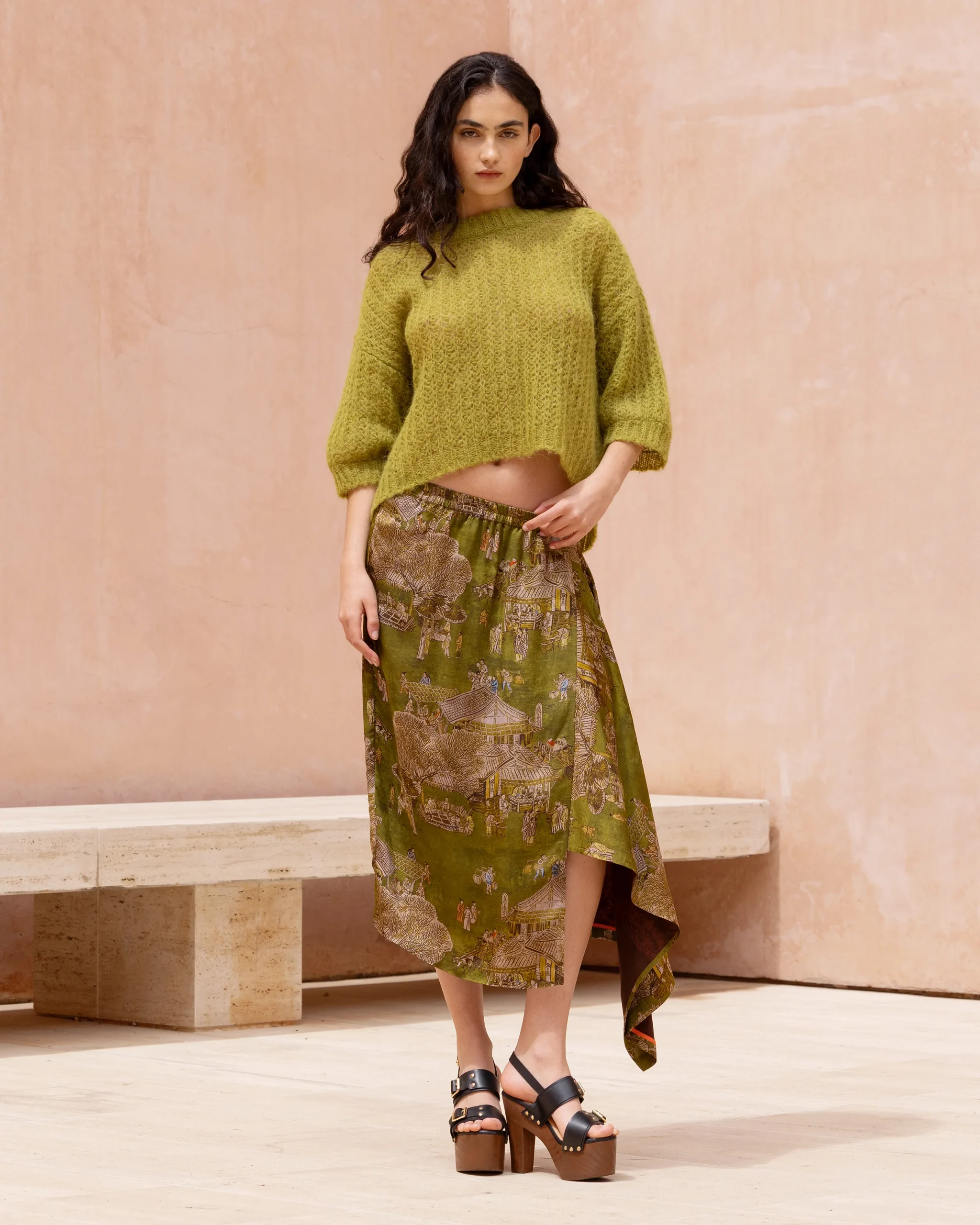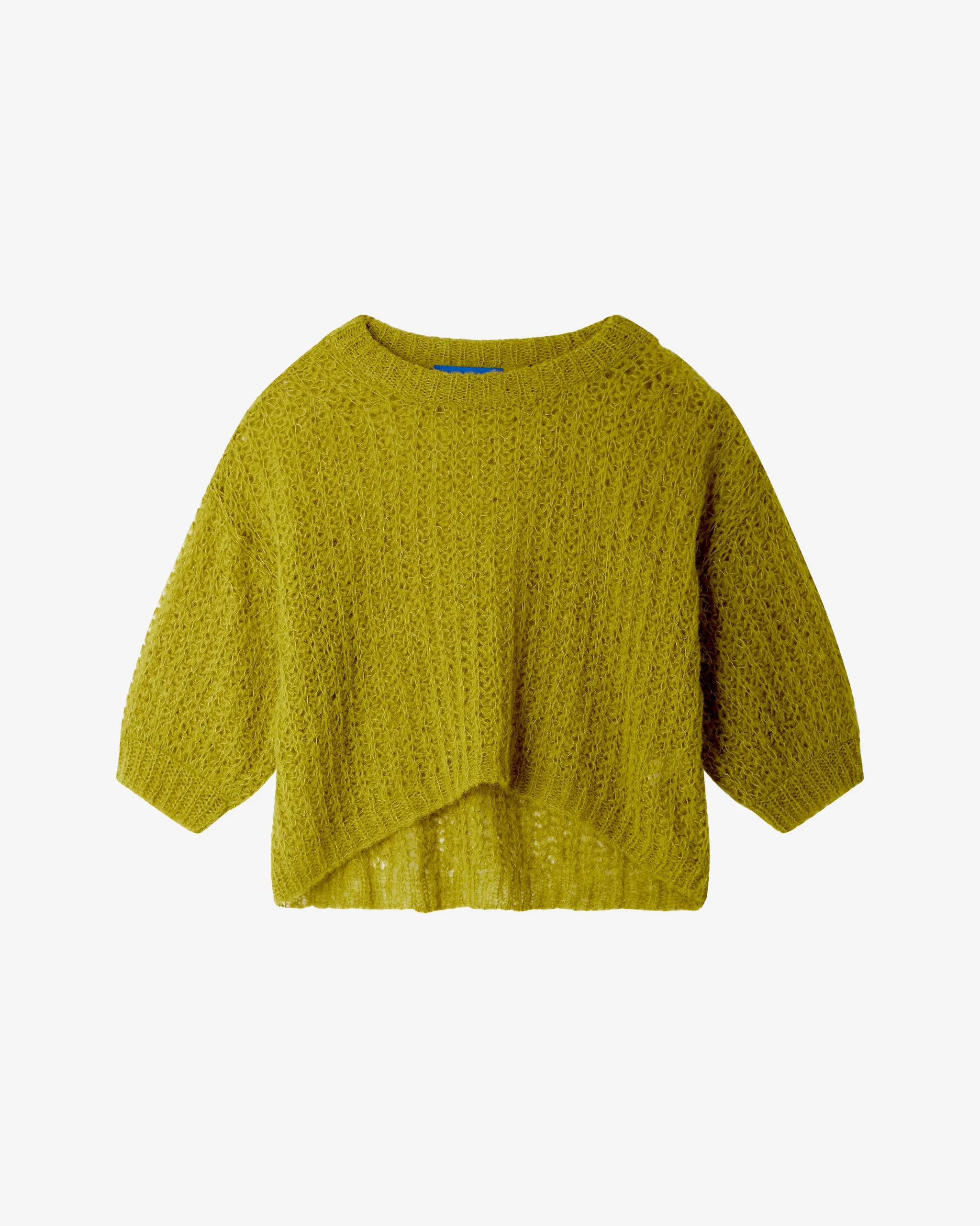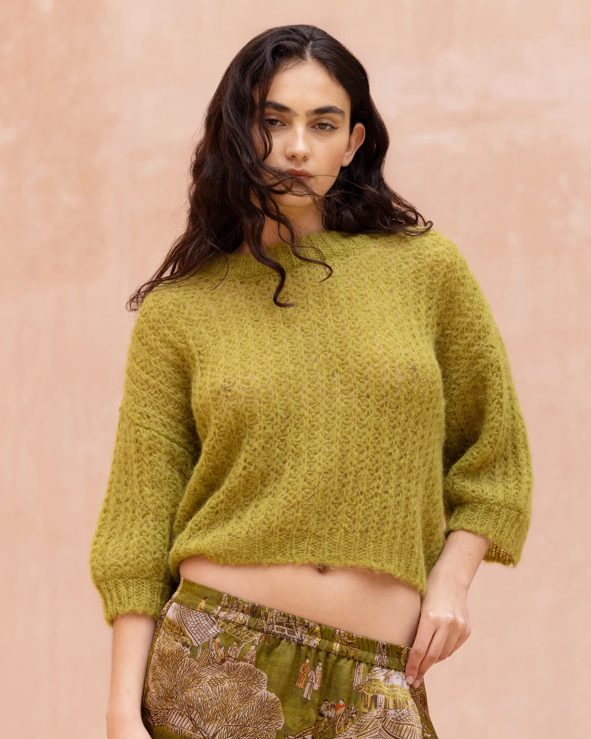 Une maille douce ajourée et enveloppante, au volume compact pour notre pull court. Confectionné en alpaga brossé, ce pull à manches courtes séduit par sa texture moelleuse et sa coupe épurée. L’encolure ronde, légèrement dégagée, apporte une touche féminine et décontractée. À porter à même la peau ou sur une chemise pour jouer les superpositions.