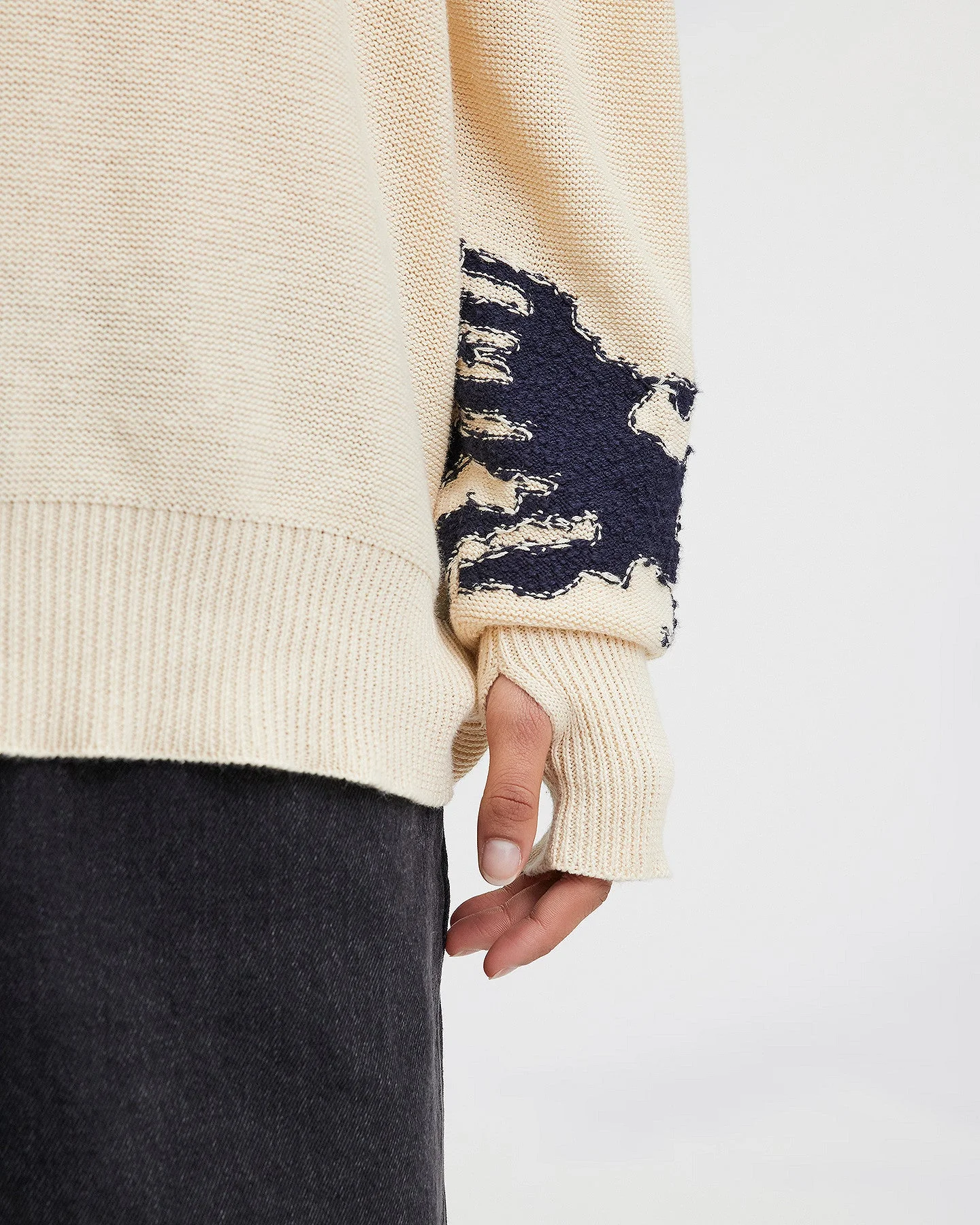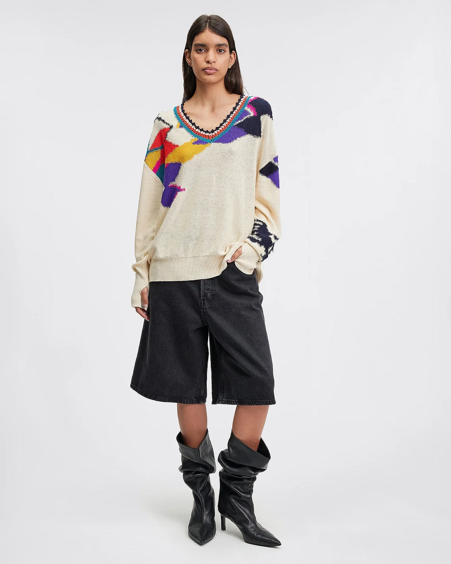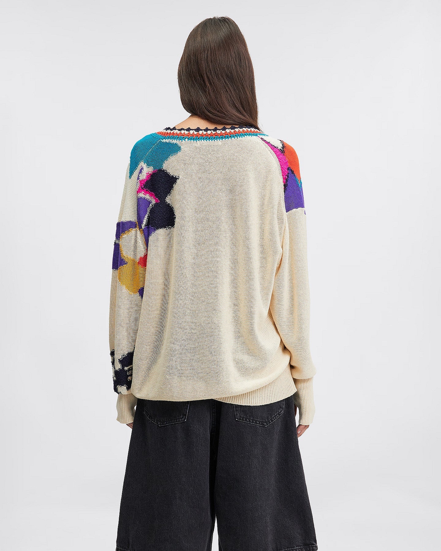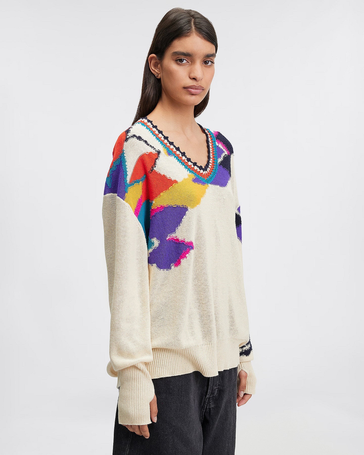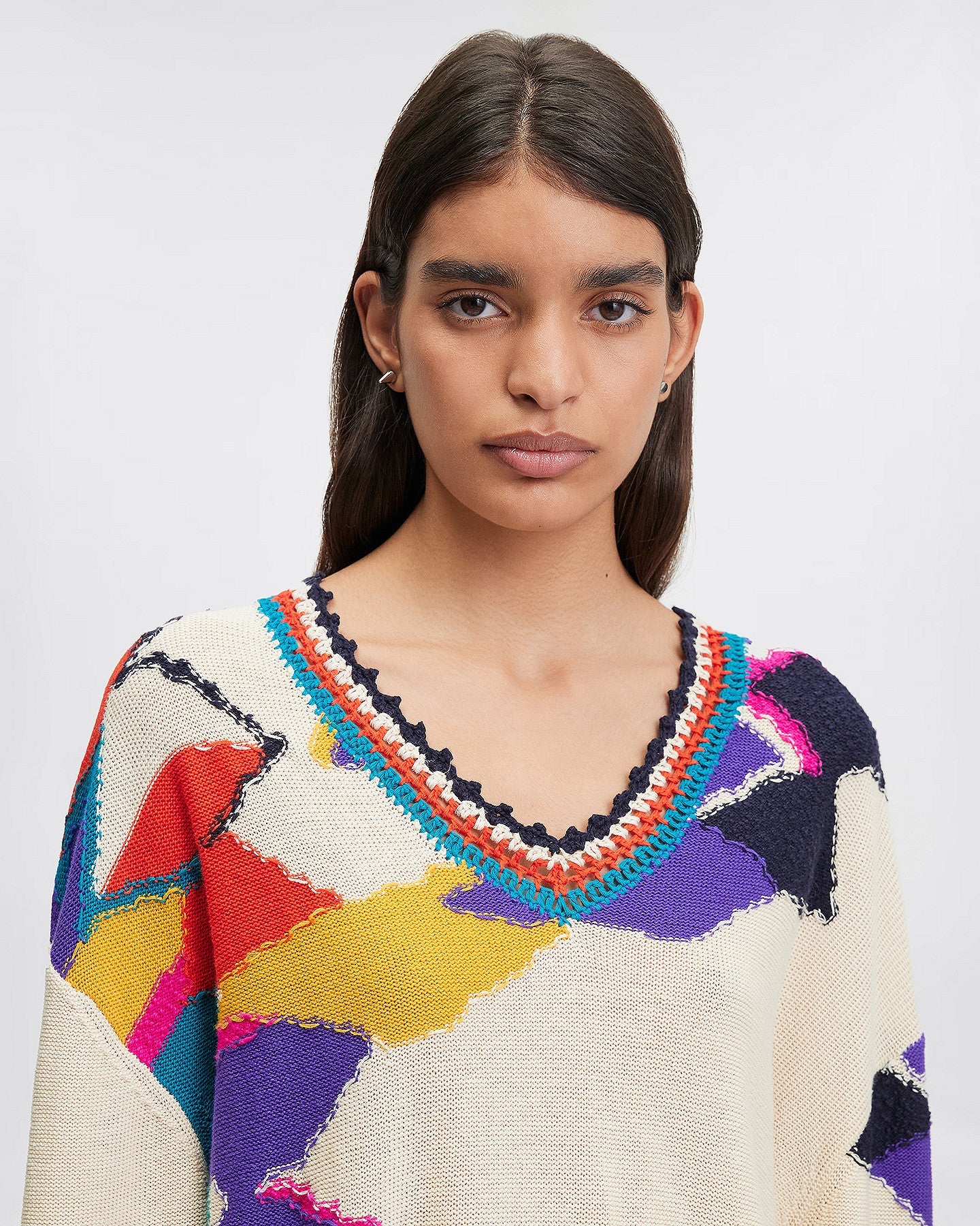 Ce pull offre une palette de couleurs chatoyantes qui contrastent magnifiquement avec son fond d’écru, créant ainsi un effet visuel dynamique et accrocheur. Réalisé avec une technique intarsia, le fil est travaillé avec une finition au crochet qui ajoute une texture subtile et un détail artisanal à la pièce. Son encolure en V classique apporte une touche de sophistication et d’élégance, tandis que sa coupe droite garantit un port facile et confortable, s’adaptant parfaitement à vos tenues de saison.